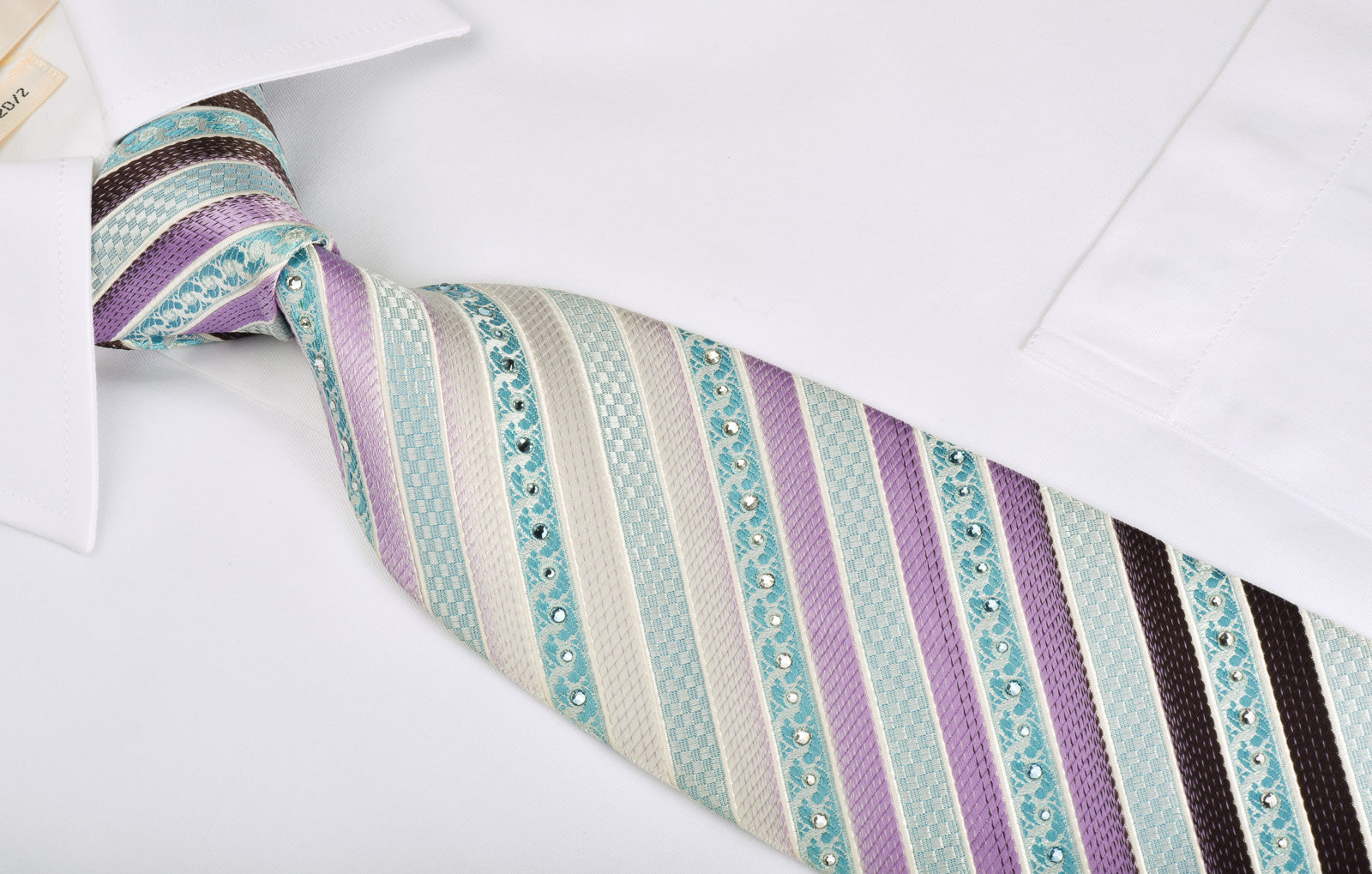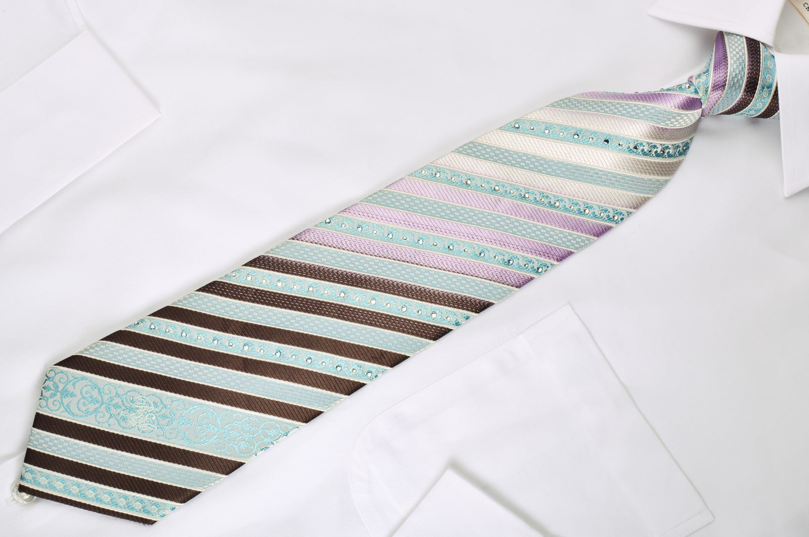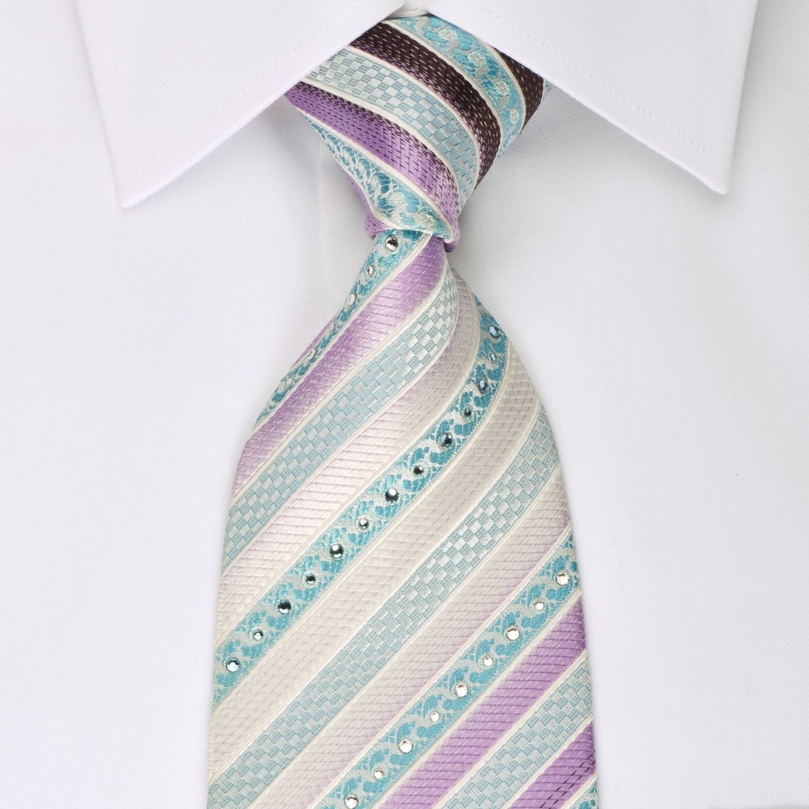 Material - SilkDesign - StripedColor - Brown, Purple, Silver, TurquoiseLength - Classic (57 in.-60 in.)(145 cm-153 cm)Width - Classic (3 1/4 in.-3 3/4 in.)(8 cm-9.5 cm)Special Features - Blue Rhinestones, White RhinestonesBrand -
