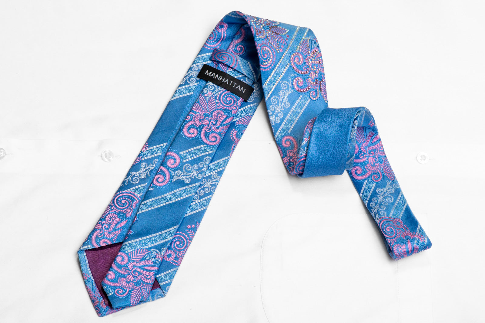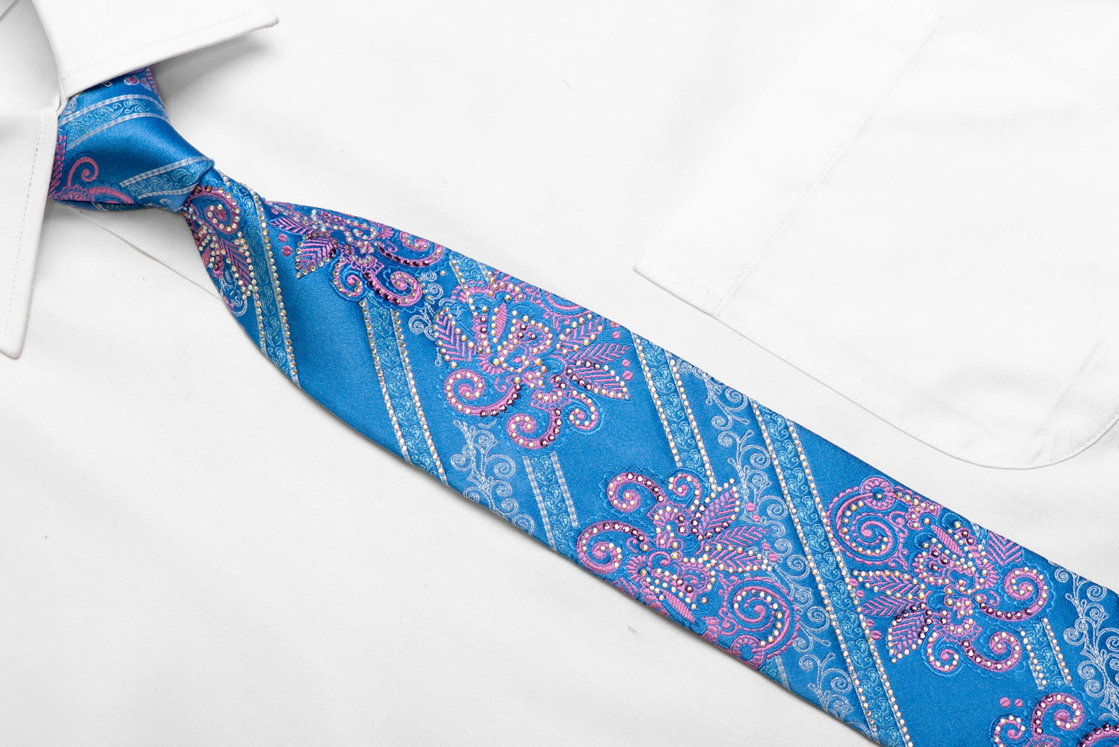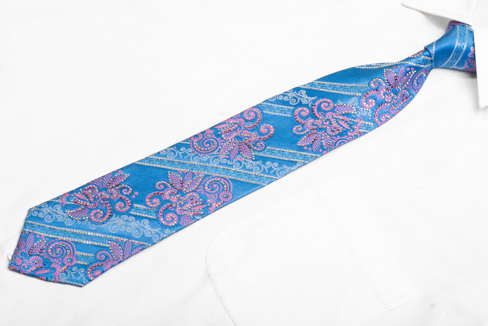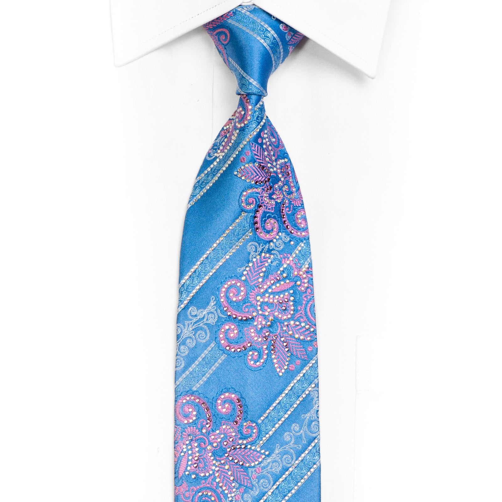 Material - SilkDesign - Floral, StripedColor - Blue, Pink, SilverLength - Classic (57 in.-60 in.)(145 cm-153 cm)Width - Classic (3 1/4 in.-3 3/4 in.)(8 cm-9.5 cm)Special Features - Rhinestones