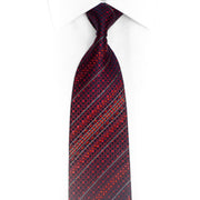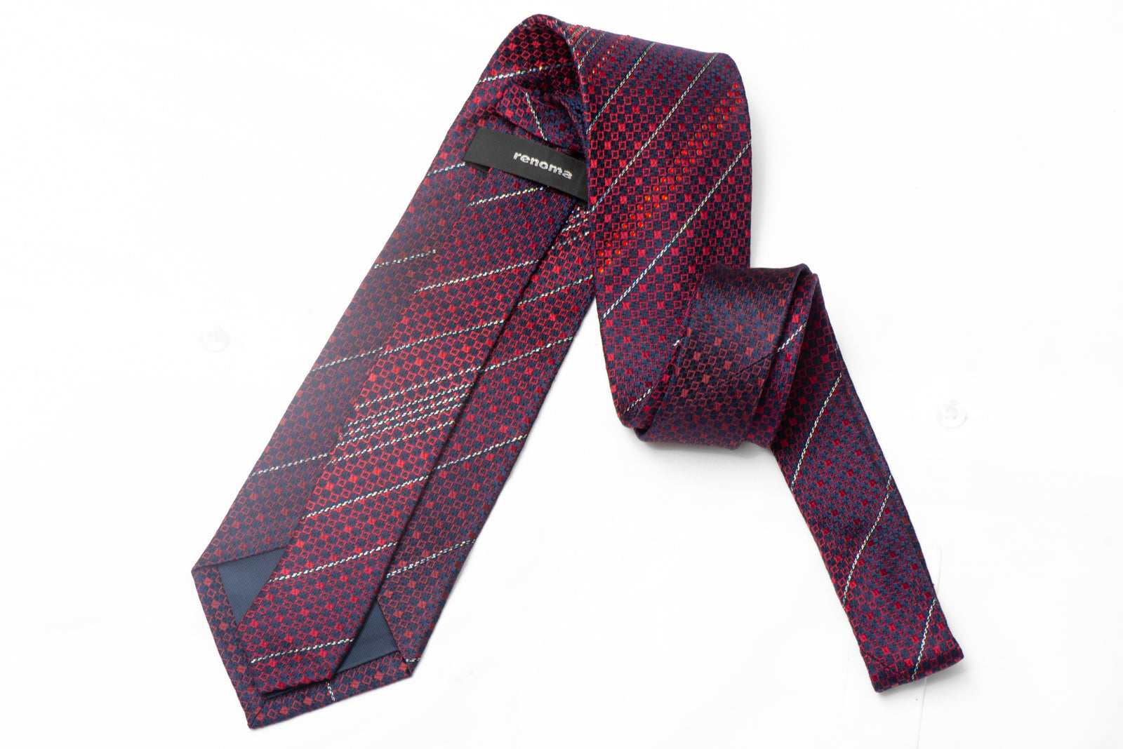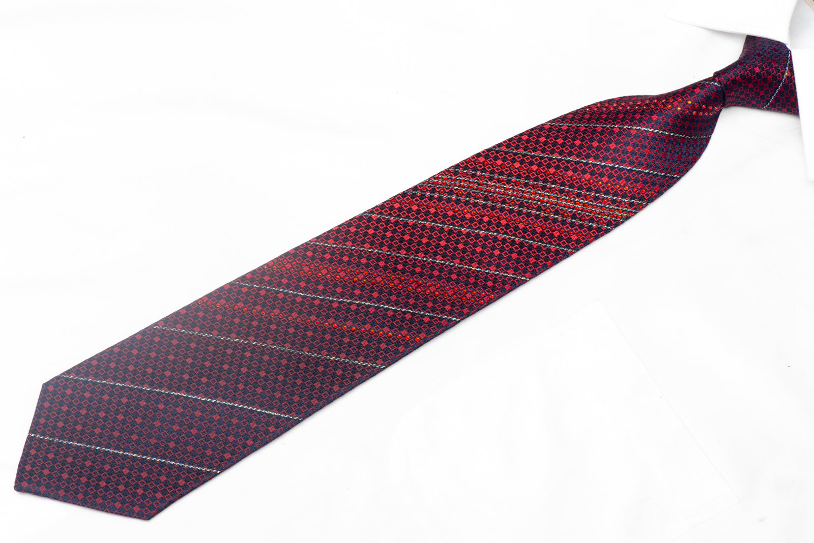 Enhance your wardrobe with our stunning Red Geometric On Blue Rhinestone Silk Necktie, featuring subtle hints of silver sparkle. Perfect for adding a touch of sophistication to any outfit.