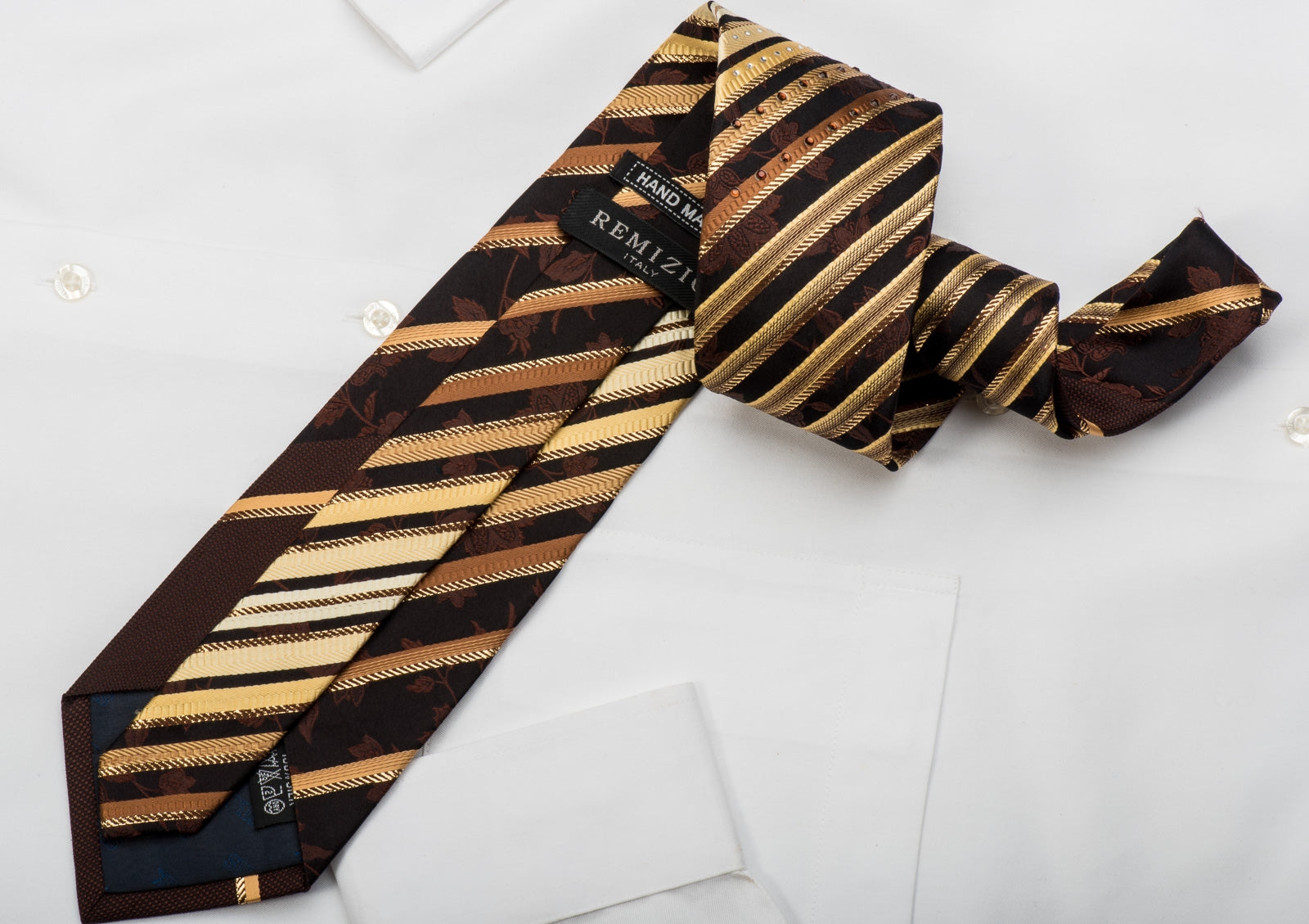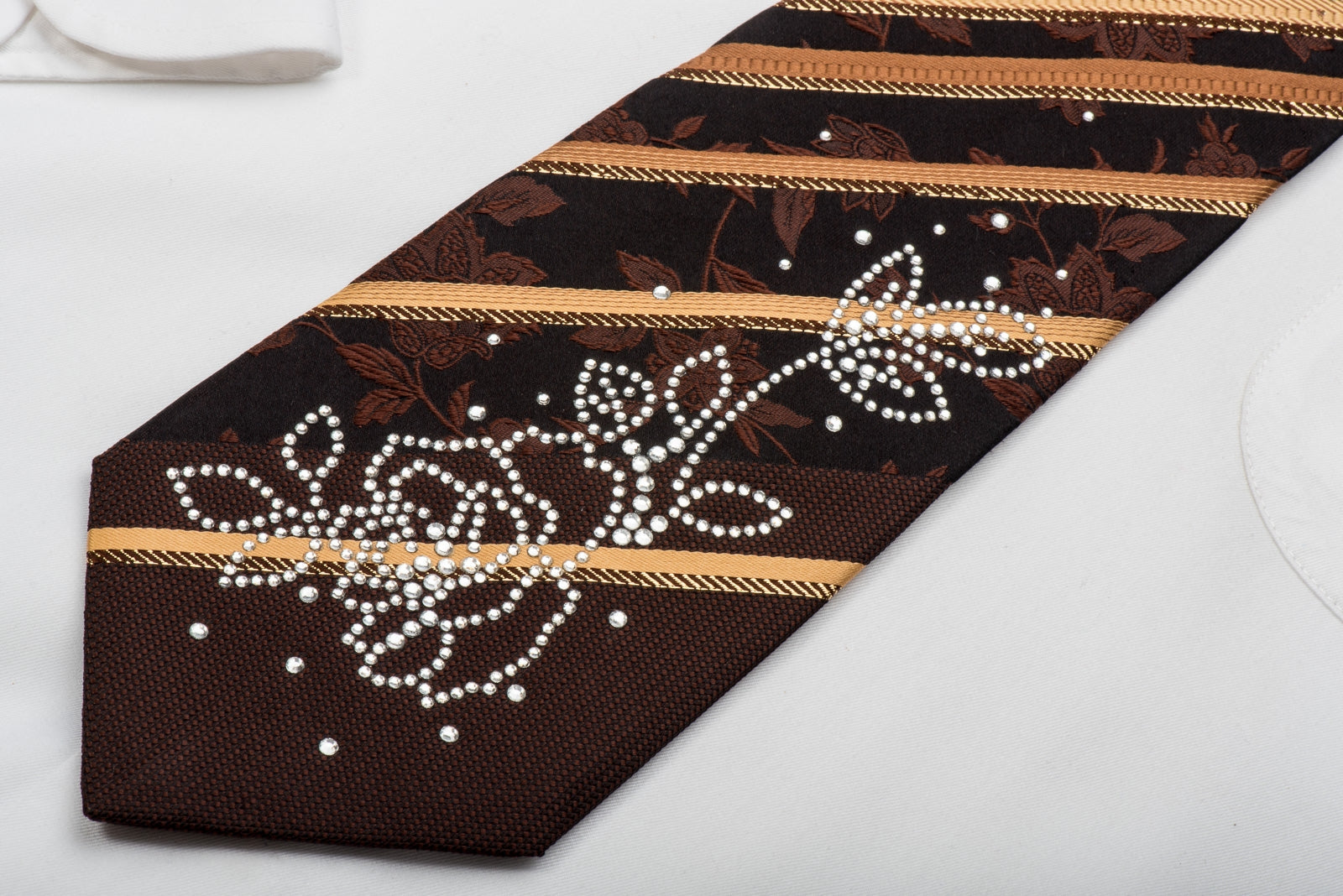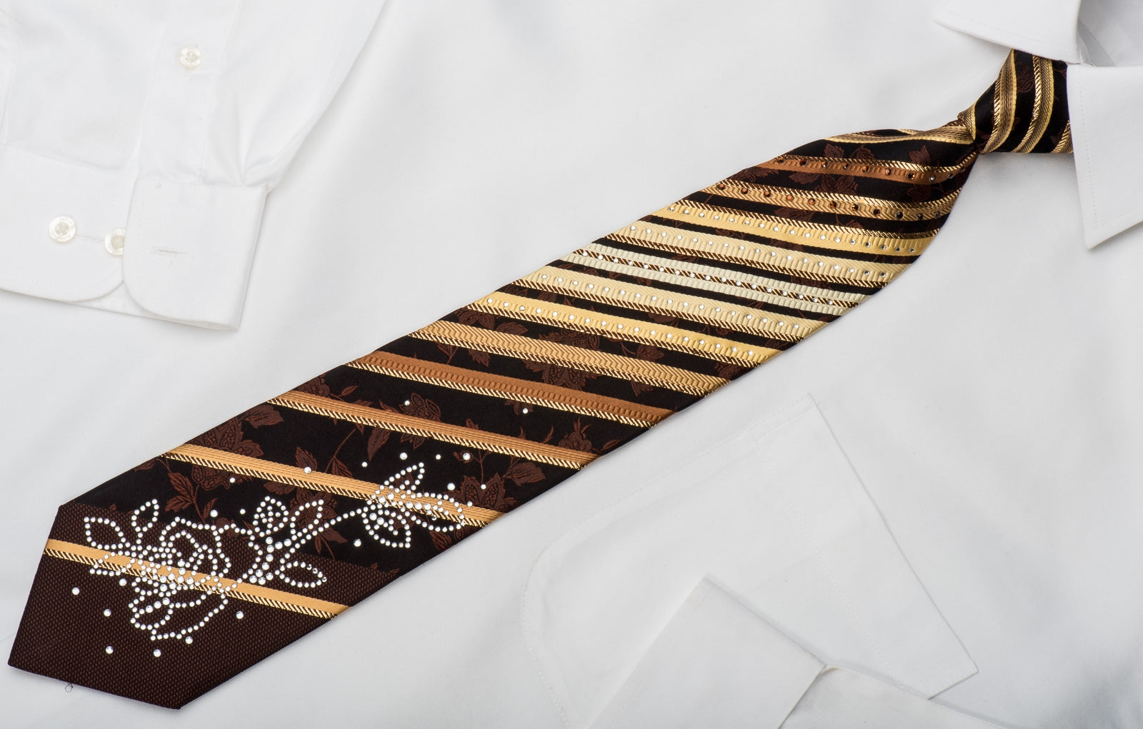 This is a gorgeous men's Rhinestone necktie handmade from the finest quality silk and designed by top brand name Remizio. Presenting a stylish golden Striped and floral design on dark brown silk, sparkling with white, orange Rhinestones and golden sparkles.