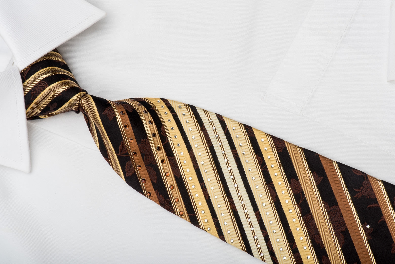 Material - SilkDesign - StripedColor - Brown, GoldLength - Classic (57 in.-60 in.)(145 cm-153 cm)Width - Classic (3 1/4 in.-3 3/4 in.)(8 cm-9.5 cm)Special Features - Golden Sparkles, Orange Rhinestones, White Rhinestones