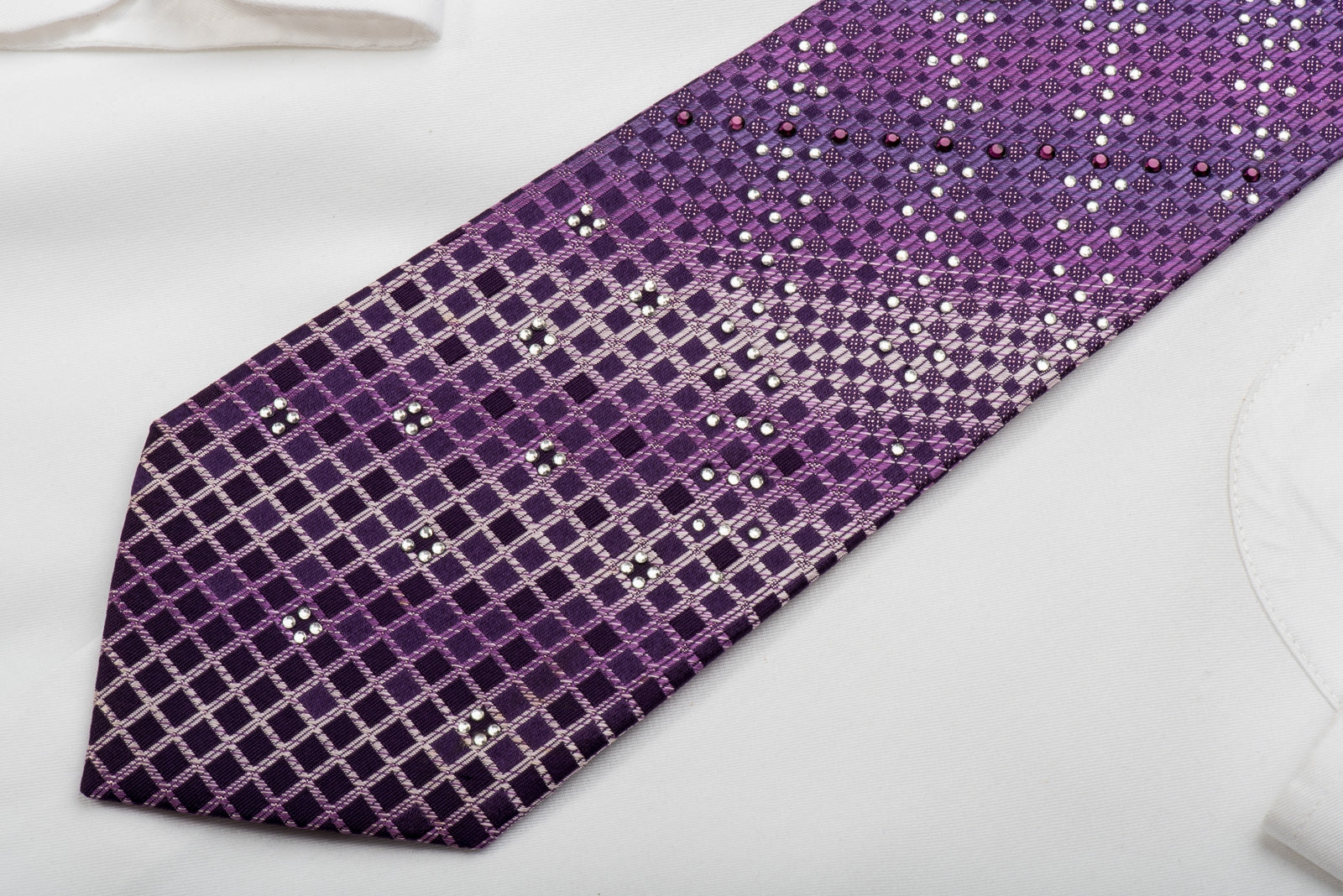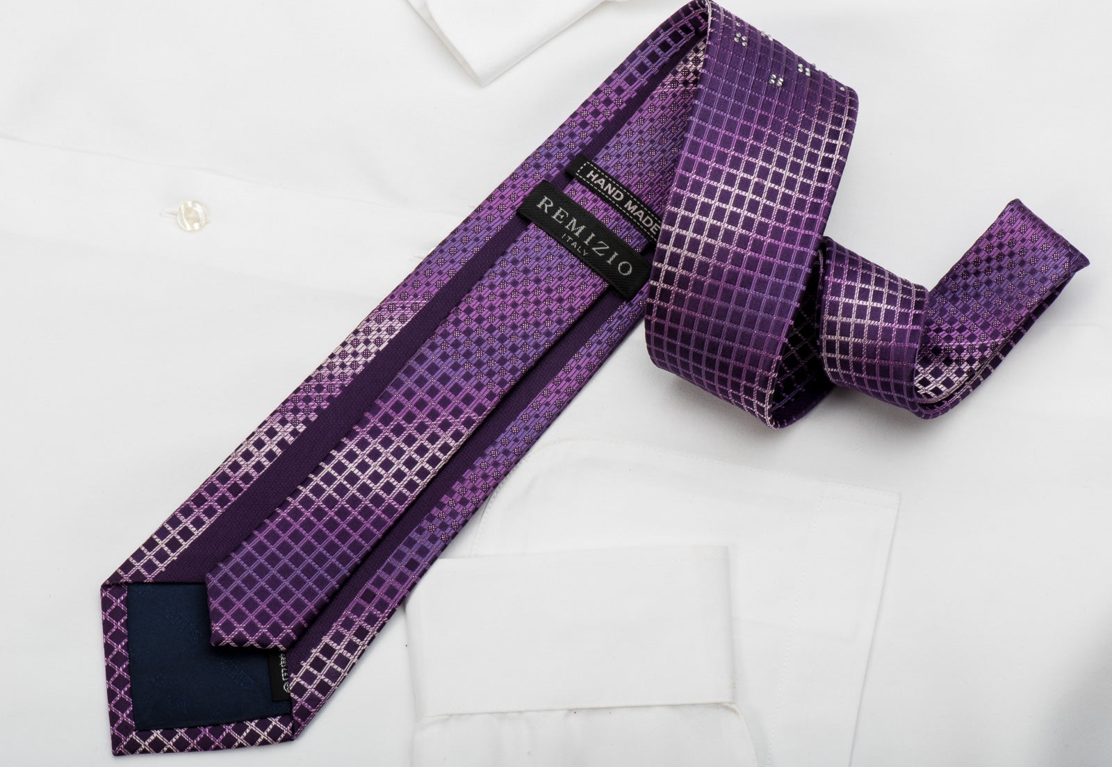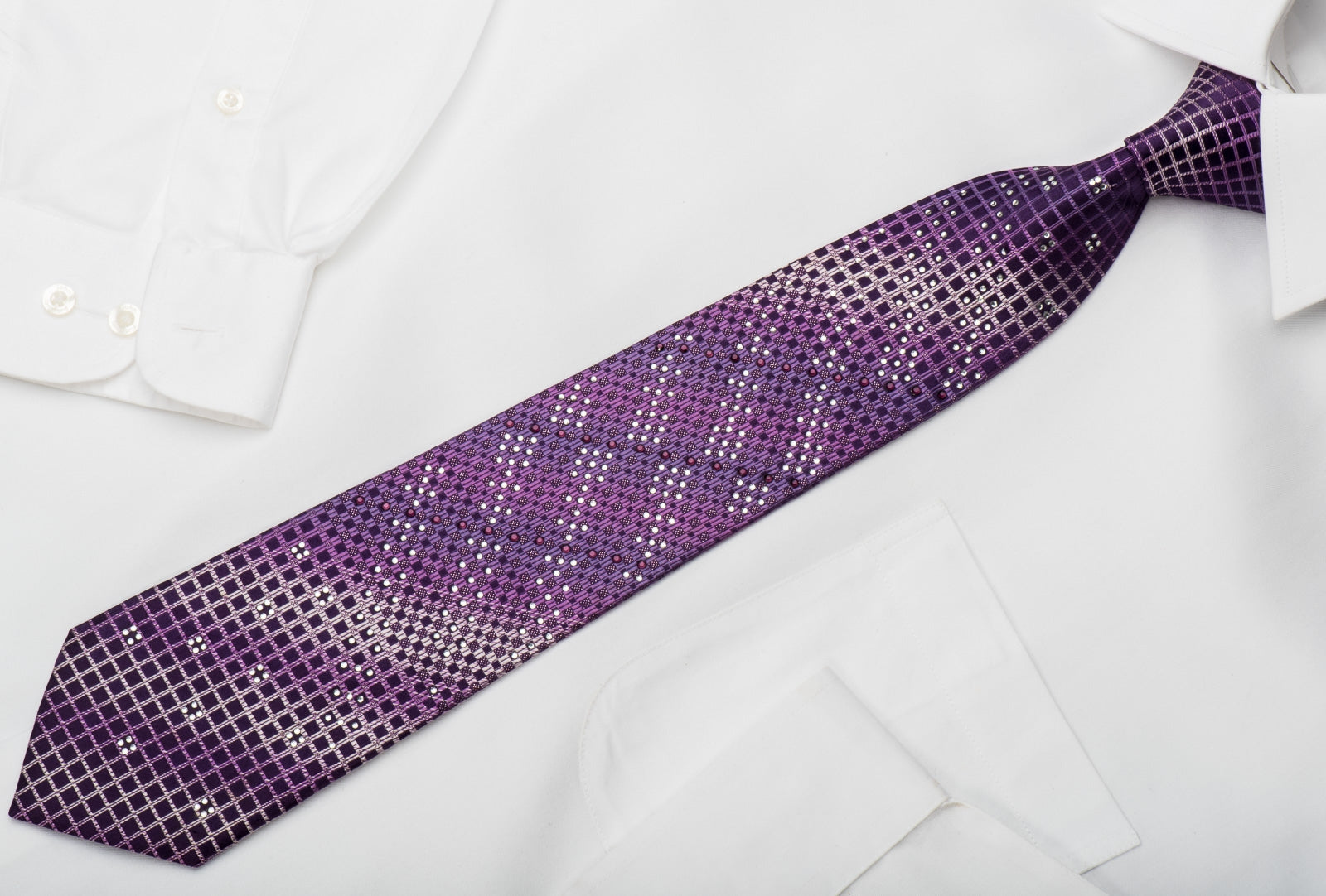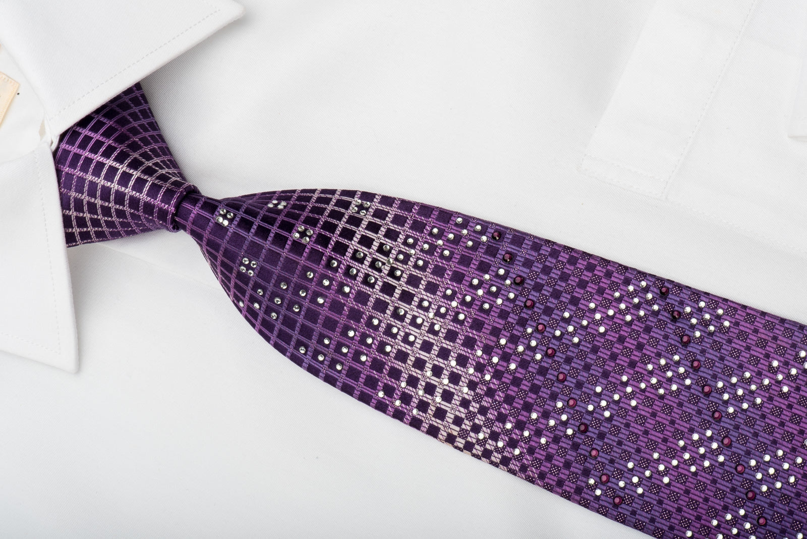 Stylish Rhinestone silk necktie perfect on every occasion handmade and designed by top brand name Remizio. Presenting an elegant geometric squares design on woven purple silk, sparkling with white, purple Rhinestones and purple sparkles.