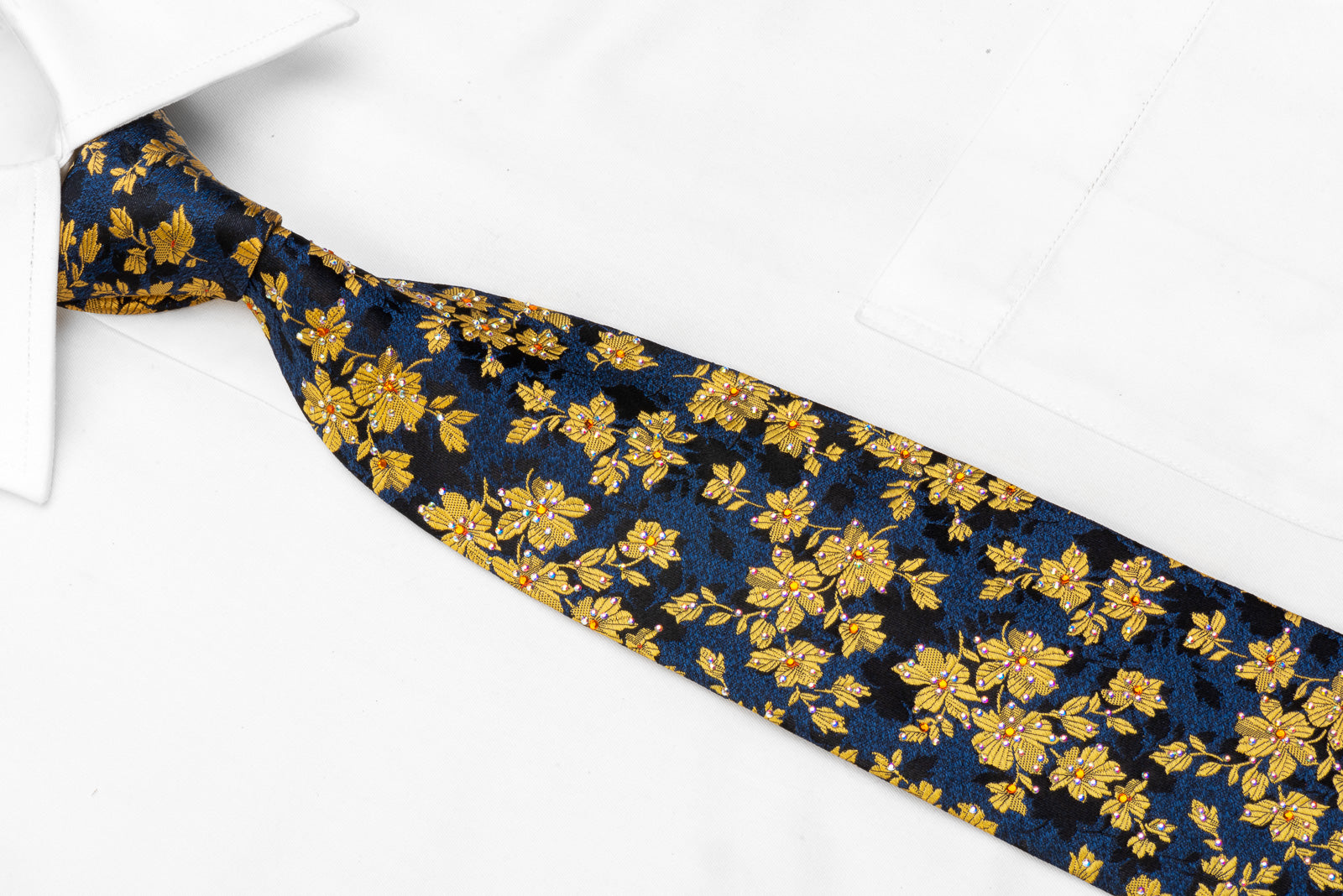 Material - SilkDesign - FloralColor - Black, Blue, GoldLength - Classic (57 in.-60 in.)(145 cm-153 cm)Width - Classic (3 1/4 in.-3 3/4 in.)(8 cm-9.5 cm)Special Features - AB Rhinestones, Orange Rhinestones