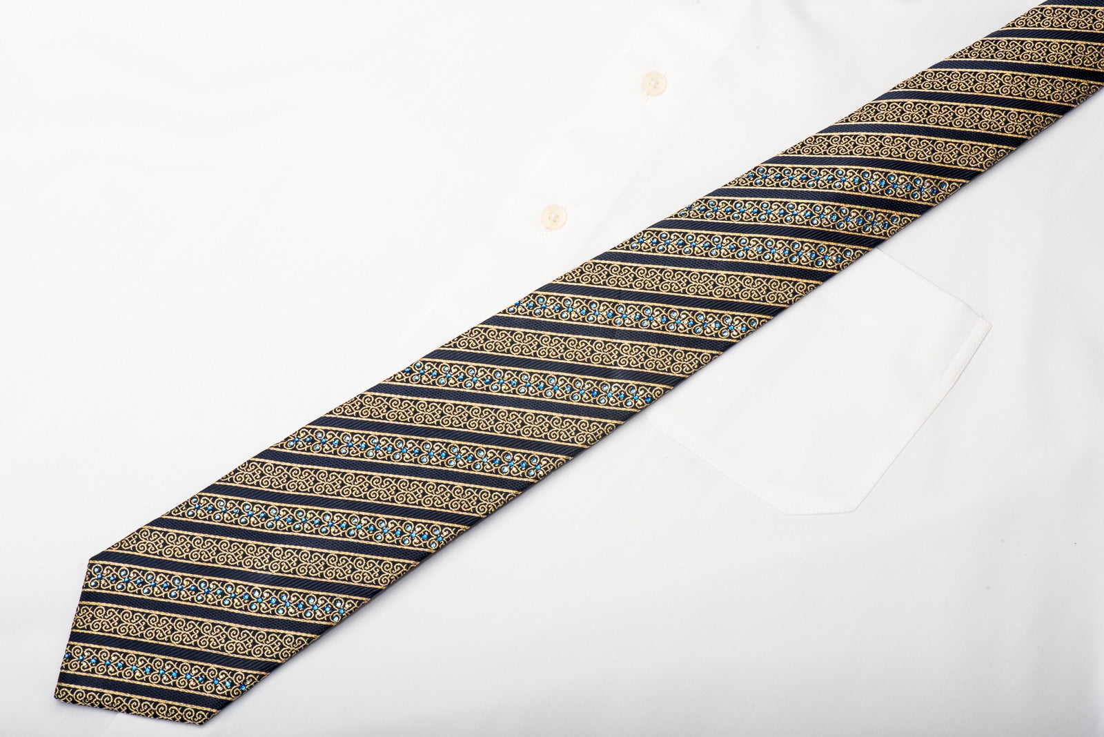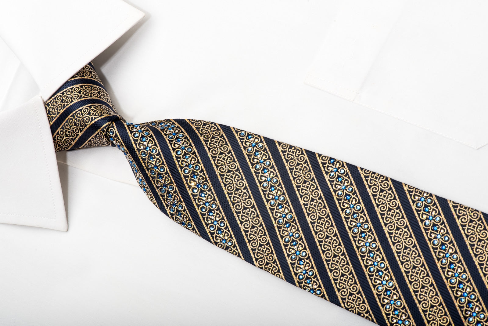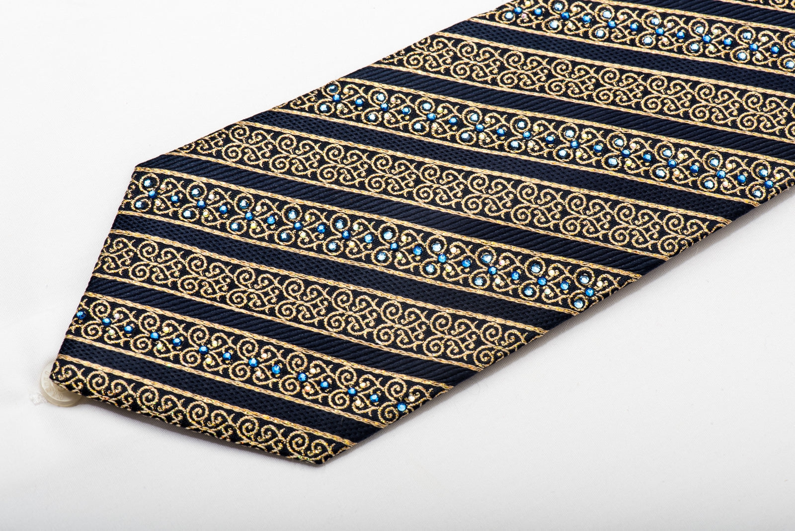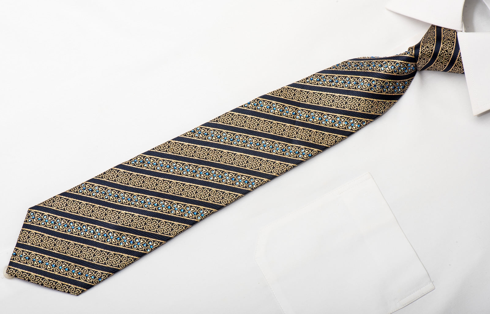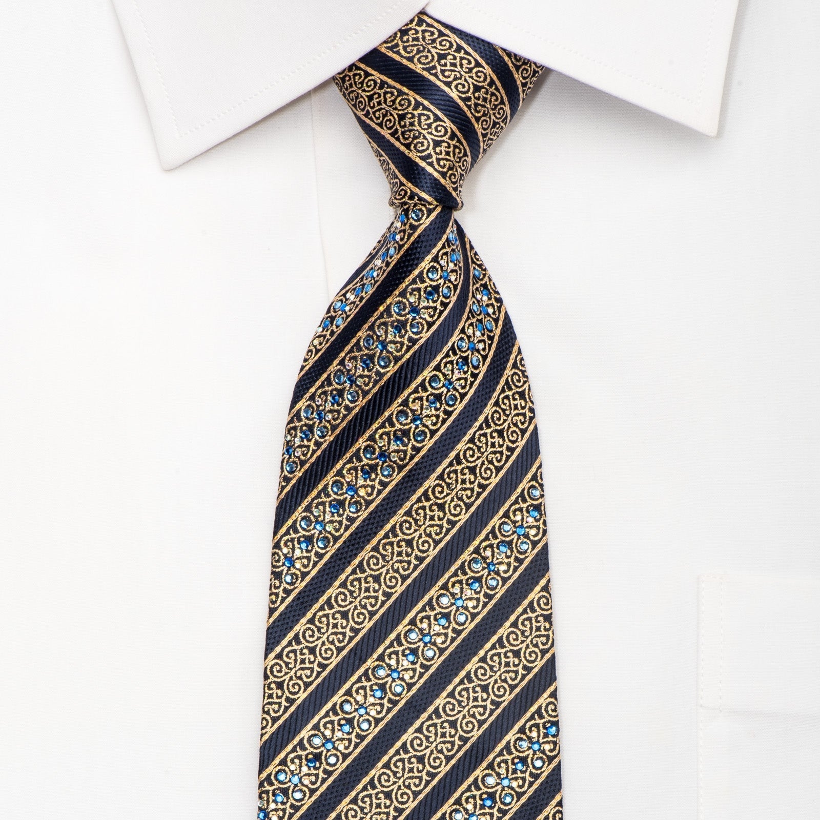 This elegant silk necktie, crafted from premium silk, suits any event with style. It features a refined golden Cartouche Striped pattern on navy silk, enhanced by shimmering clear blue and crystal AB rhinestones accented with gold sparkles.