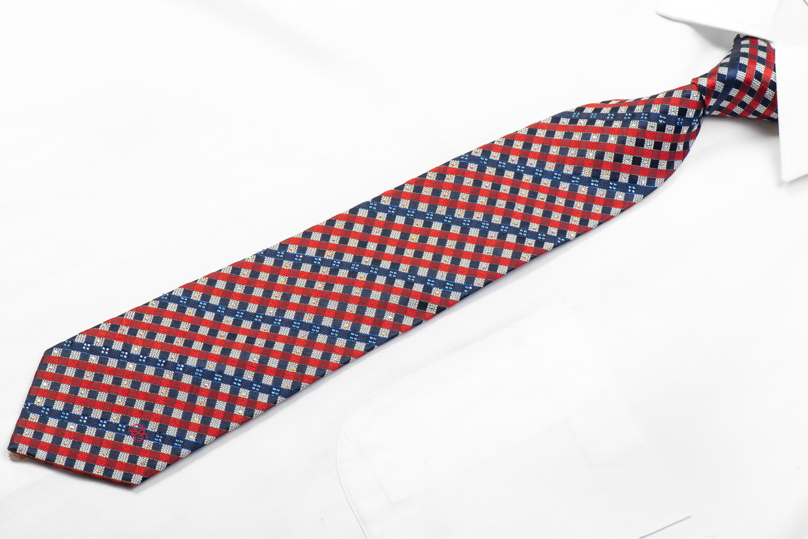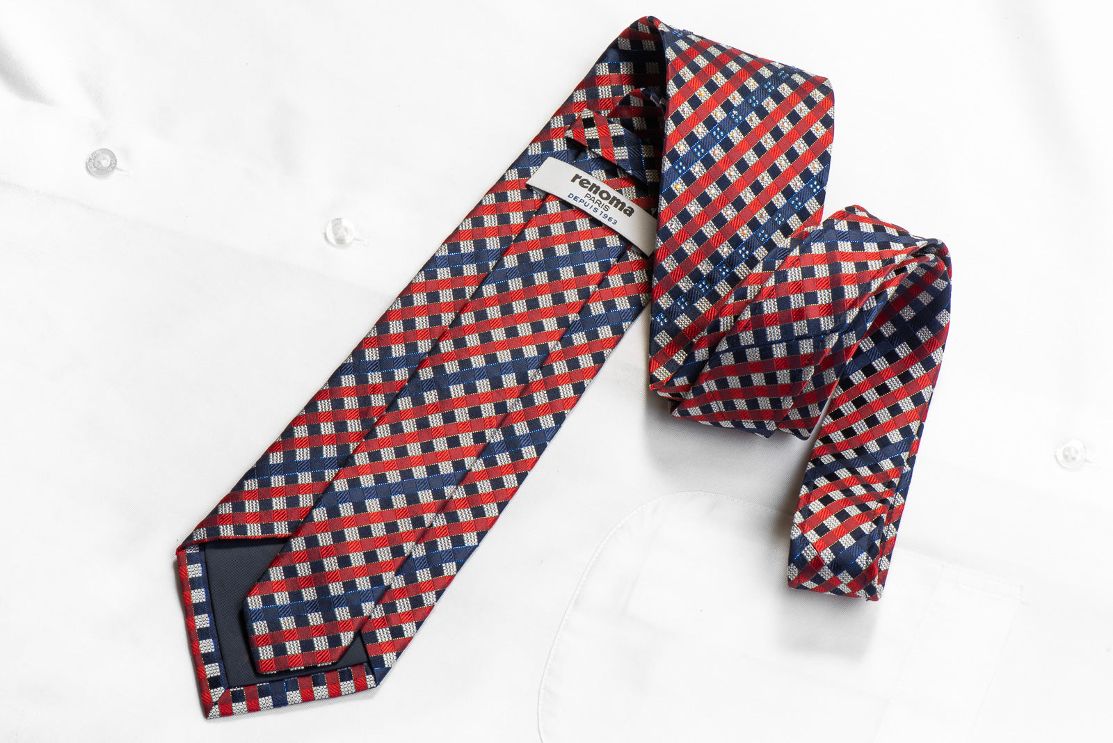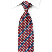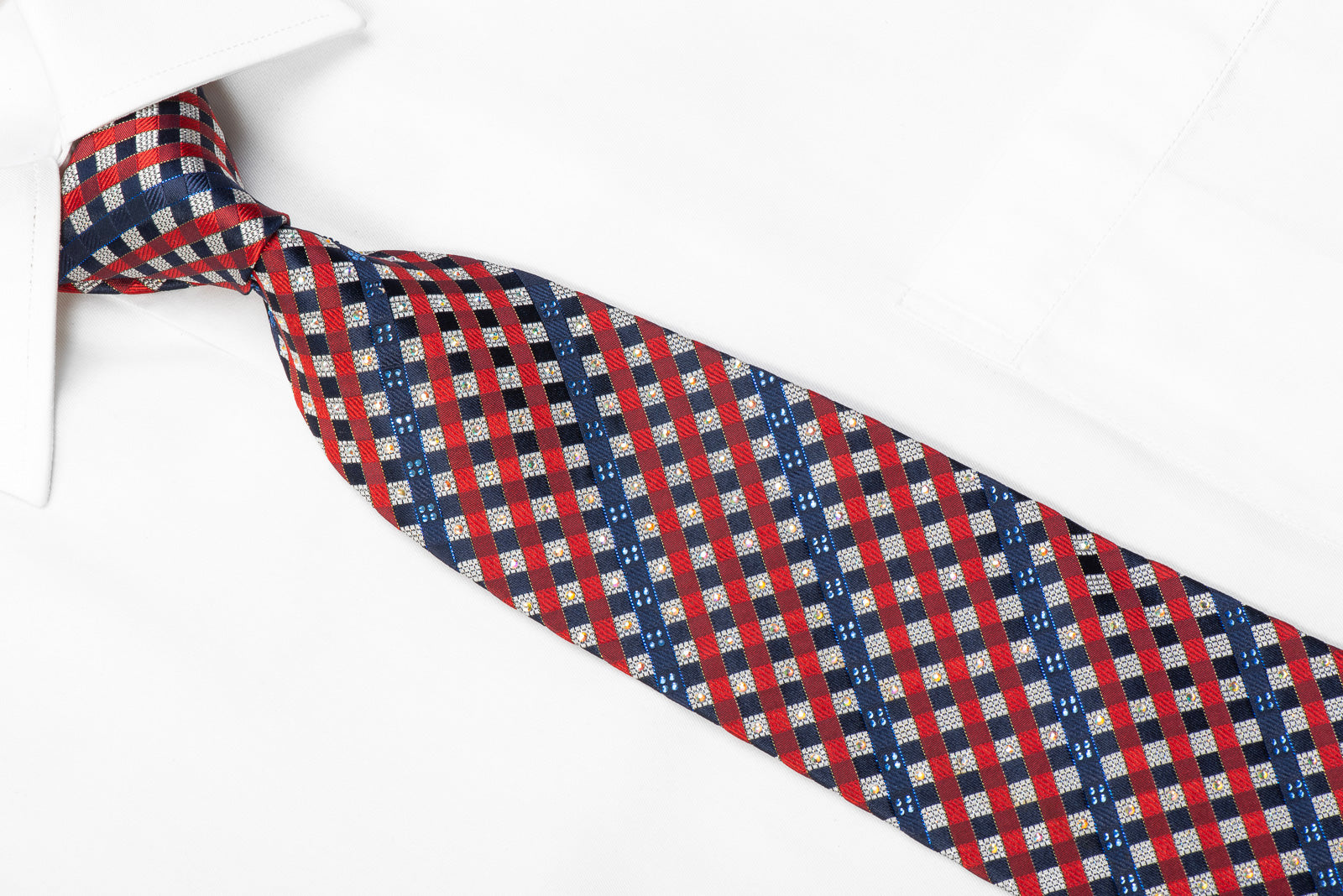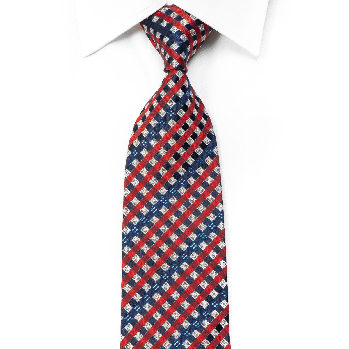 Material - SilkDesign - CheckeredColor - Blue, Red, SilverLength - Classic (57 in.-60 in.)(145 cm-153 cm)Width - Classic (3 1/4 in.-3 3/4 in.)(8 cm-9.5 cm)Special Features - AB Rhinestones, Blue Rhinestones, Silver Sparkles
