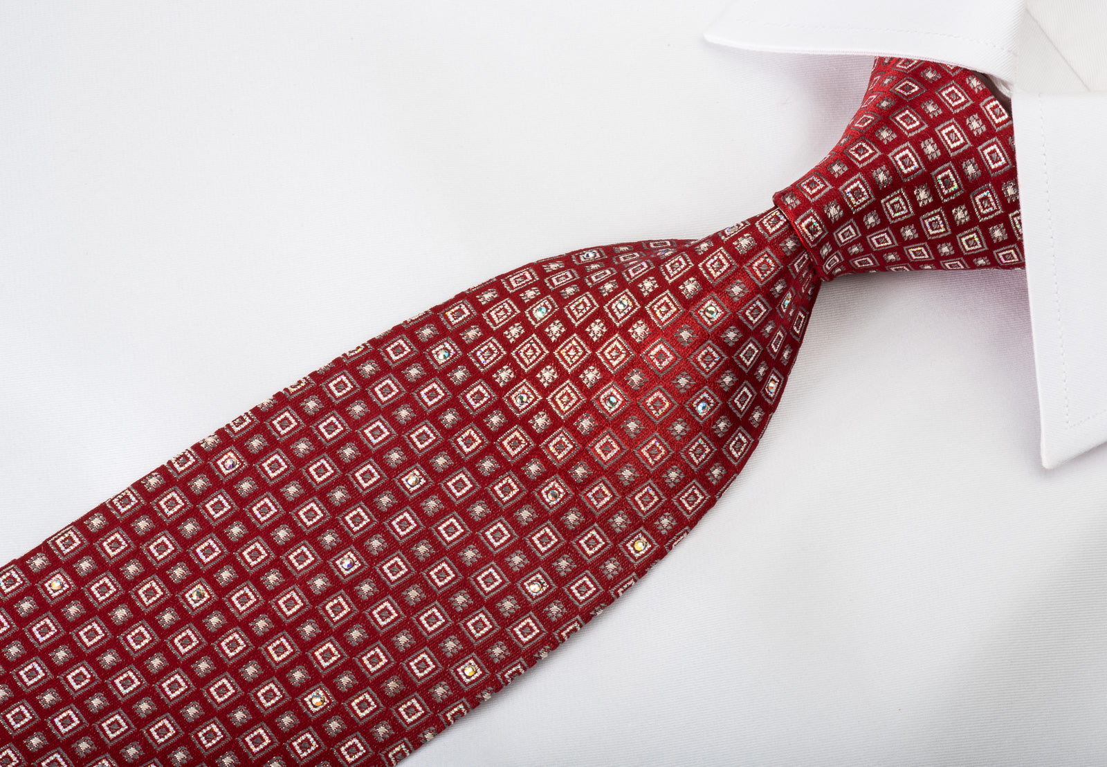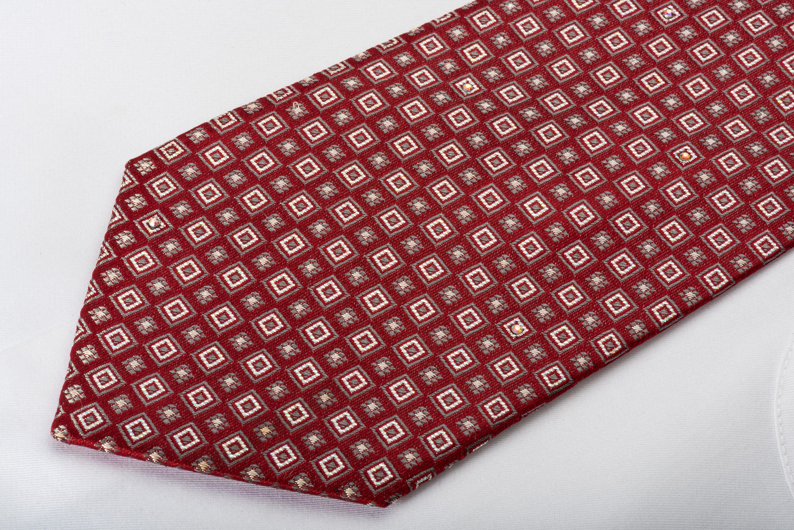 Material - SilkDesign - GeometricColor - Burgundy, SilverLength - Classic (57 in.-60 in.)(145 cm-153 cm)Width - Classic (3 1/4 in.-3 3/4 in.)(8 cm-9.5 cm)Special Features - Silver Sparkles, White Rhinestones