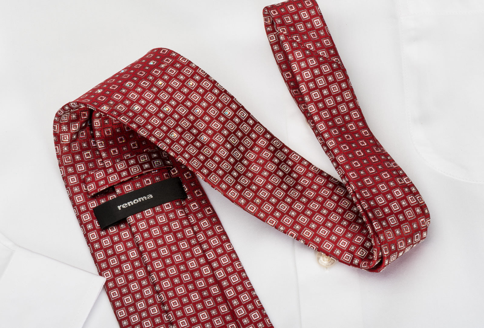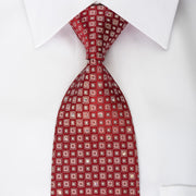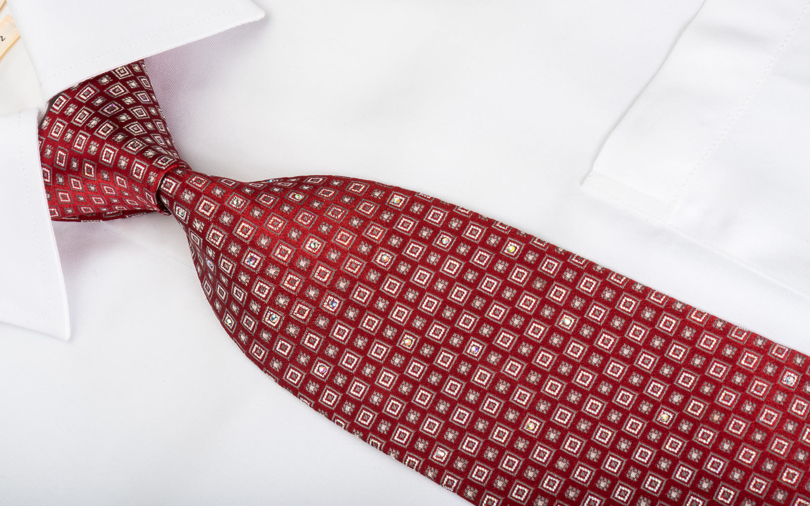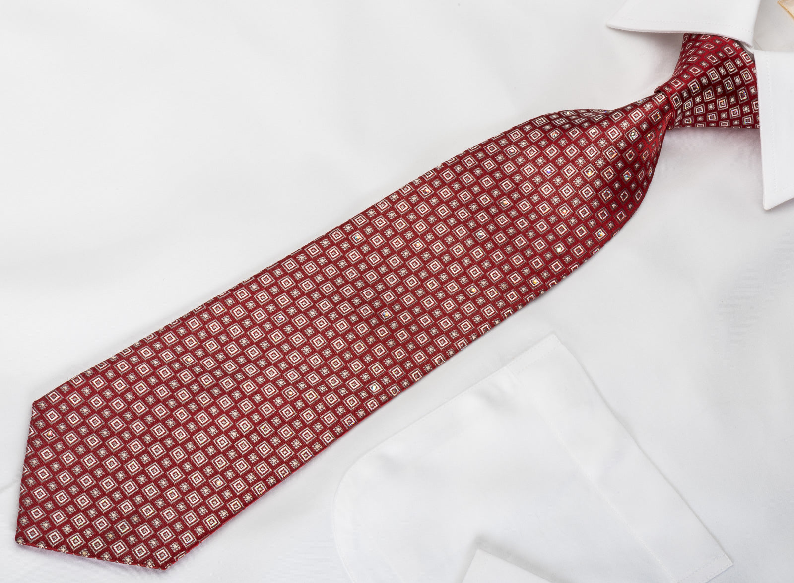 Perfect style for a special occasion this is a handmade men's woven silk Rhinestone necktie handmade from the finest quality silk and designed by top brand name Renoma. Presenting silver geometric squares on burgundy silk, sparkling with white Rhinestones with silver sparkles.