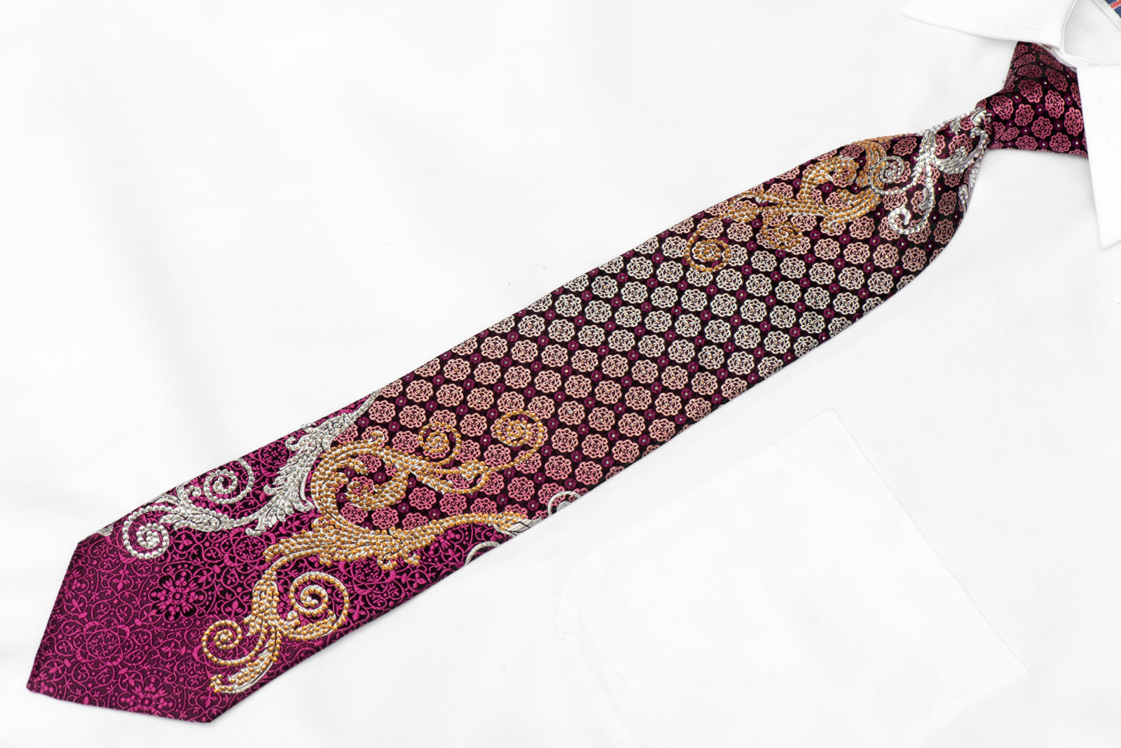 Luxurious silk tie featuring a stunning purple-black backdrop embellished with intricate rhinestone scroll designs and dazzling silver sparkles. A perfect statement piece that elevates your professional or formal attire with sophisticated brilliance.