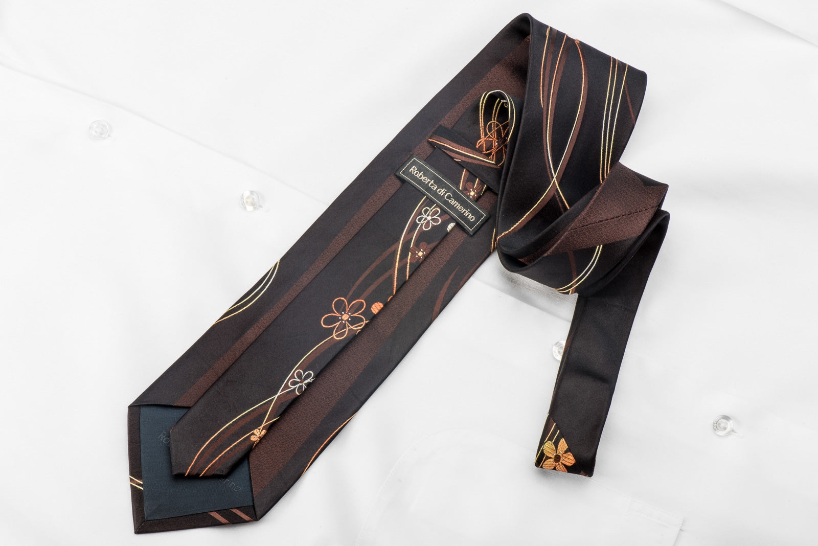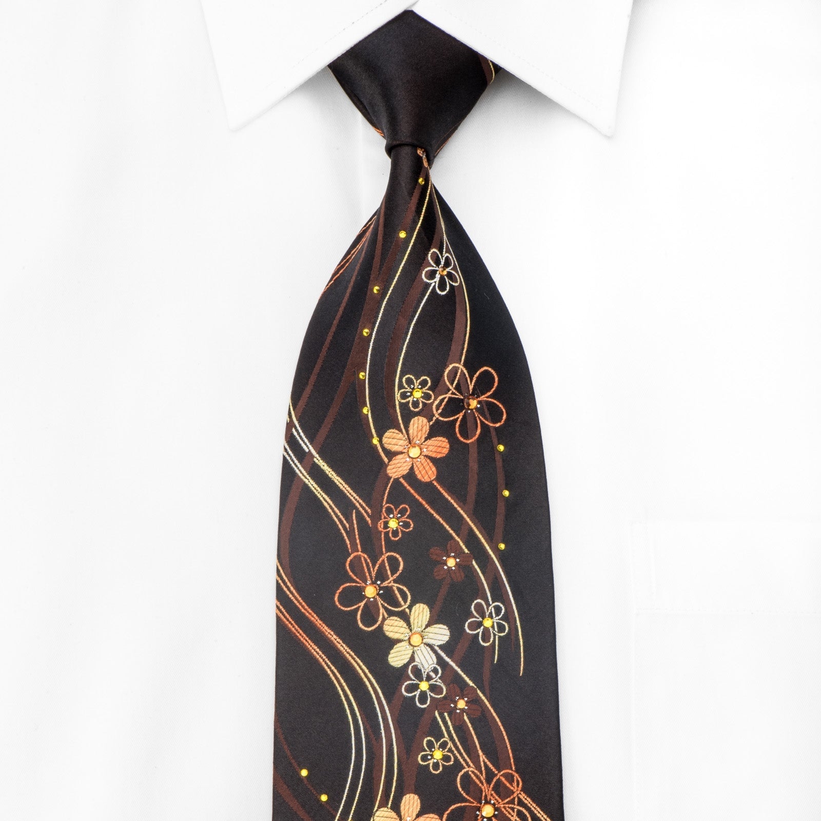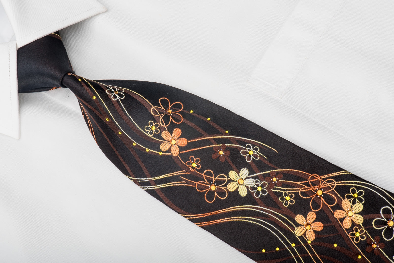 Beautiful men's crystal tie handmade from the finest quality silk and designed by top brand name Roberta di Camerino. Presenting a wonderful Floral and Waves design on dark brown woven silk with yellow, orange crystal Rhinestones and silver sparkles.