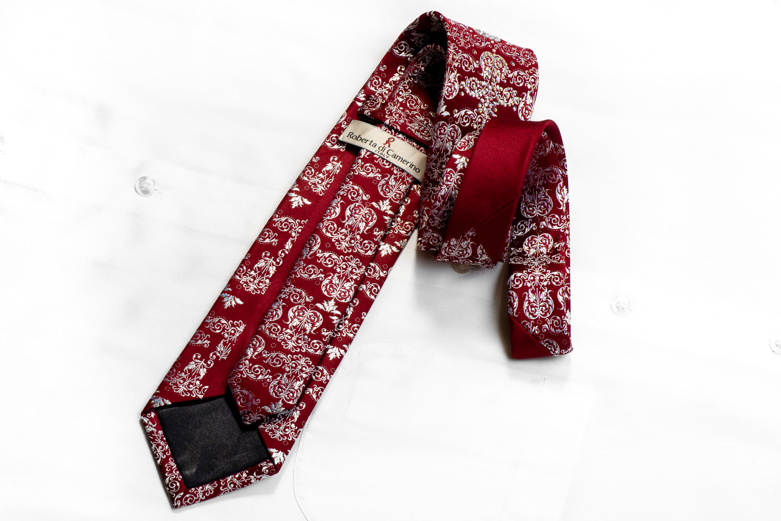 Gorgeous men's Rhinestone necktie handmade from the finest quality silk and designed by top brand name Roberta di Camerino. Presenting an elegant woven silver Damask design on burgundy, sparkling with crystal AB Rhinestones and metallic silver sparkles.