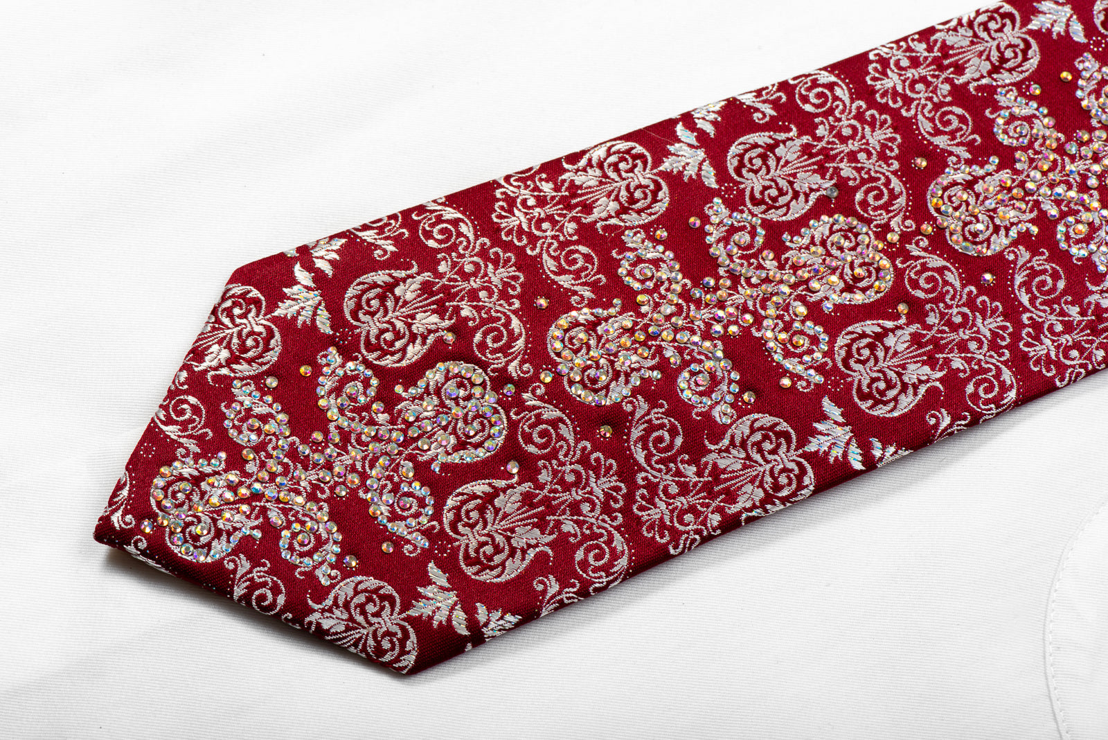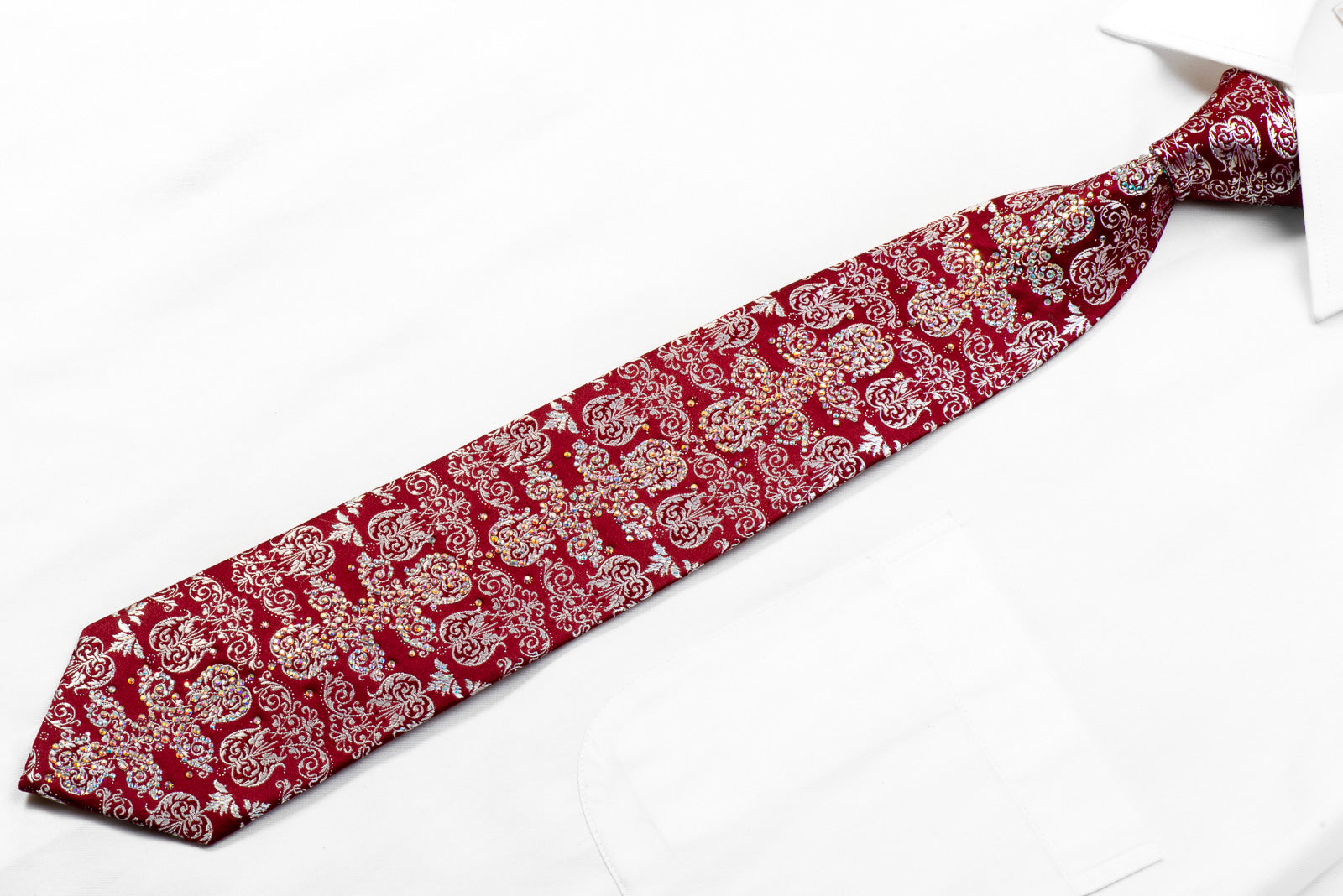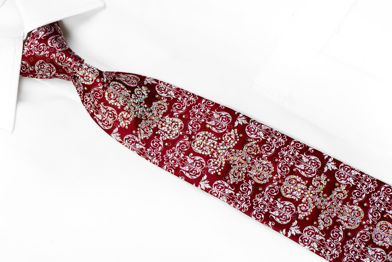 Material - SilkDesign - DamaskColor - Burgundy, SilverLength - Classic (57 in.-60 in.)(145 cm-153 cm)Width - Classic (3 1/4 in.-3 3/4 in.)(8 cm-9.5 cm)Special Features - AB Rhinestones, Silver Sparkles