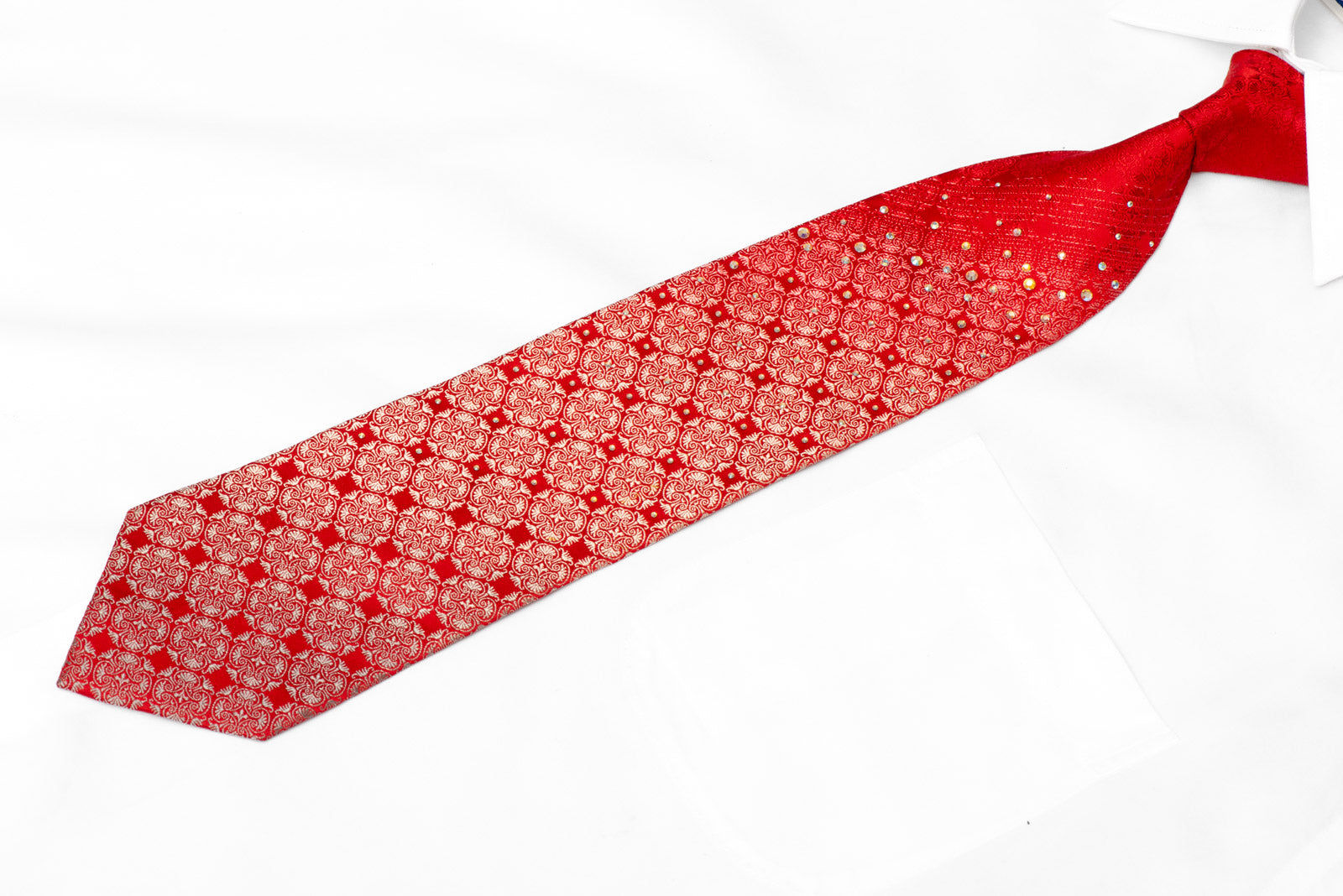 Add some sparkle to your outfit with this eye-catching Silver Cartouche on Red Silk Necktie featuring sparkling rhinestones. It's sure to impress and make you stand out in any crowd.