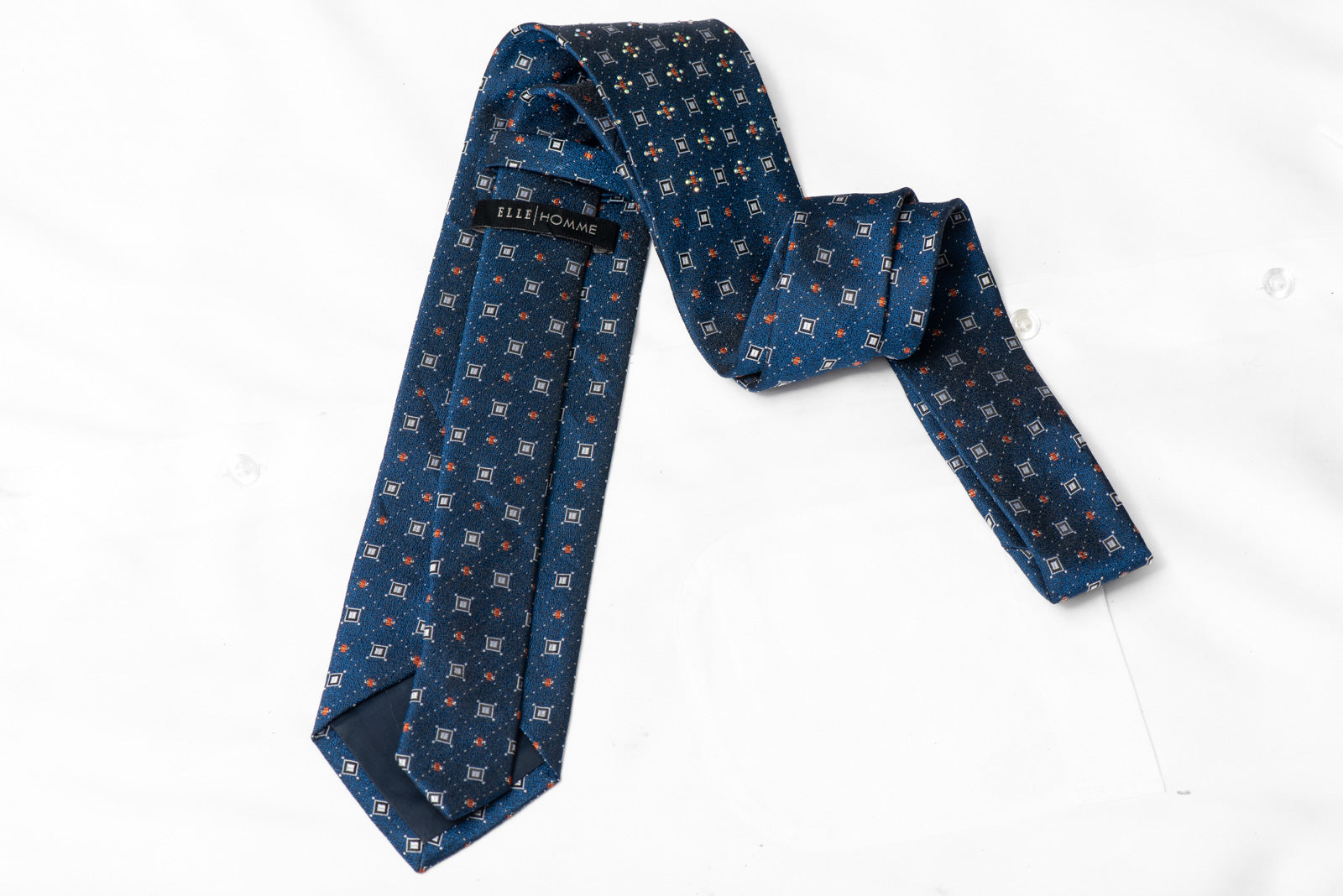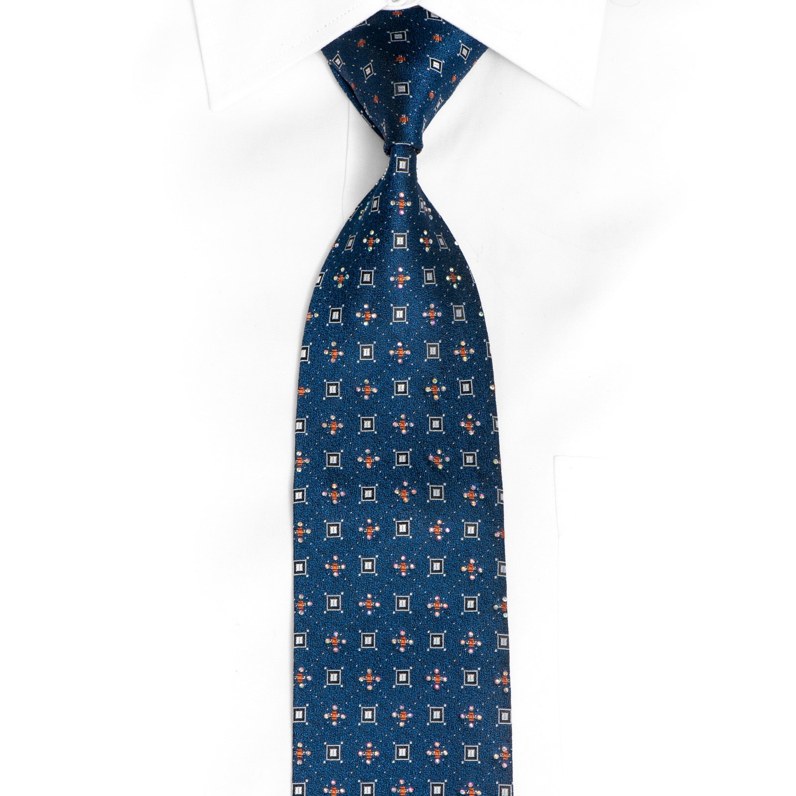This silk tie features a blue background adorned with silver geometric squares and sparkling rhinestones, creating a refined and elegant accessory that adds a touch of sophistication to any outfit.