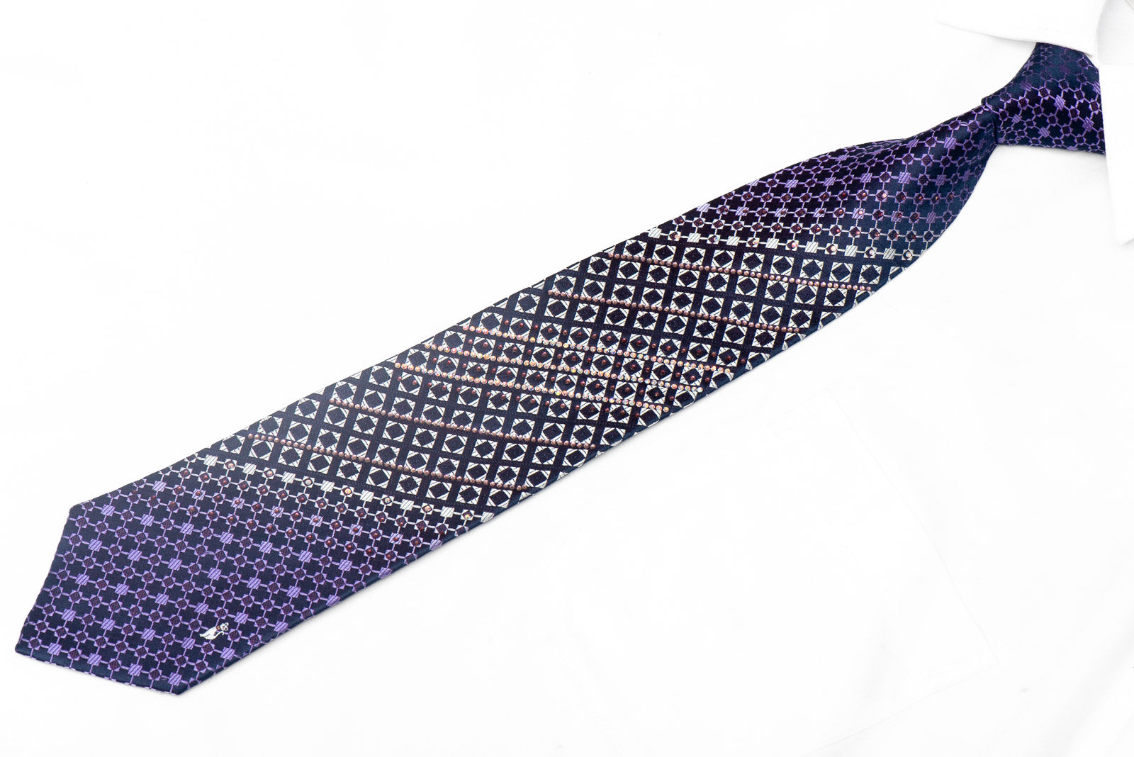 Add a touch of elegance to your look with this Silver Purple Geometric On Navy Rhinestone Silk Tie With Sparkles. It is sure to catch the eye of any viewer and enhance your outfit.