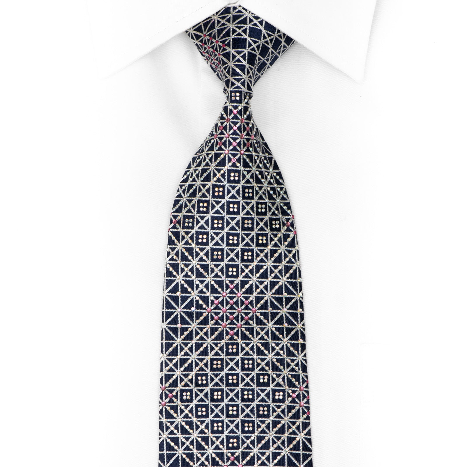 Material - SilkDesign - TrellisColor - Blue, SilverLength - Classic (48 in.-60 in.)(145cm-153 cm)Width - Classic (3 1/4 in.-3 3/4 in.)(8 cm-9.5 cm)Special Features - Rhinestones, Silver Sparkles