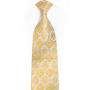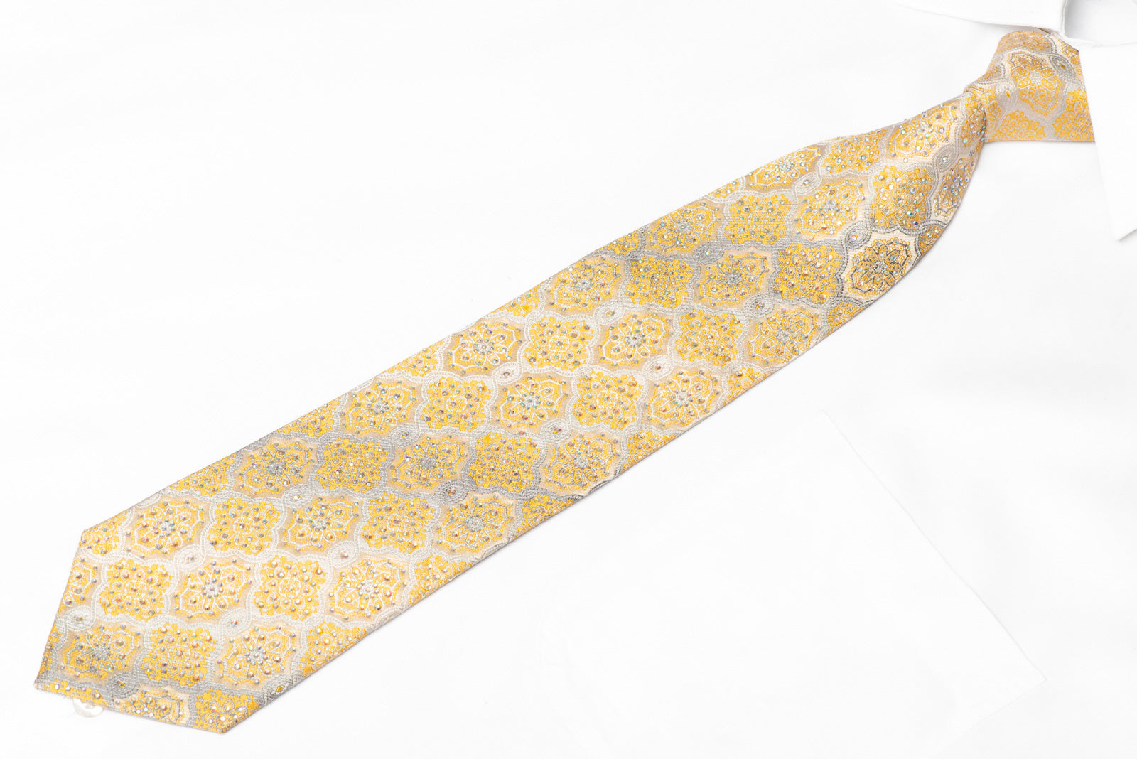 Experience the elegance and craftsmanship of our Yellow Silver Marrakesh Design Rhinestone Silk Necktie. Elevate your look with this stunning accessory that combines traditional Moroccan design with sparkling rhinestones on luxurious silk.