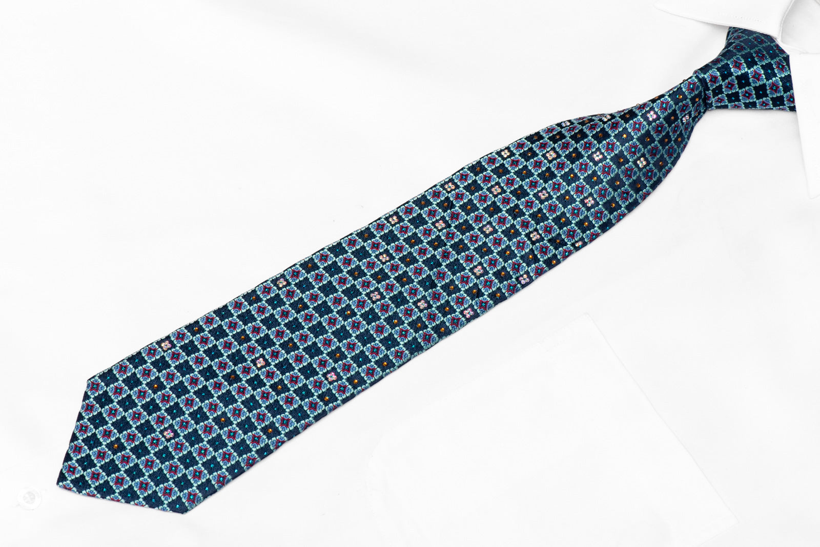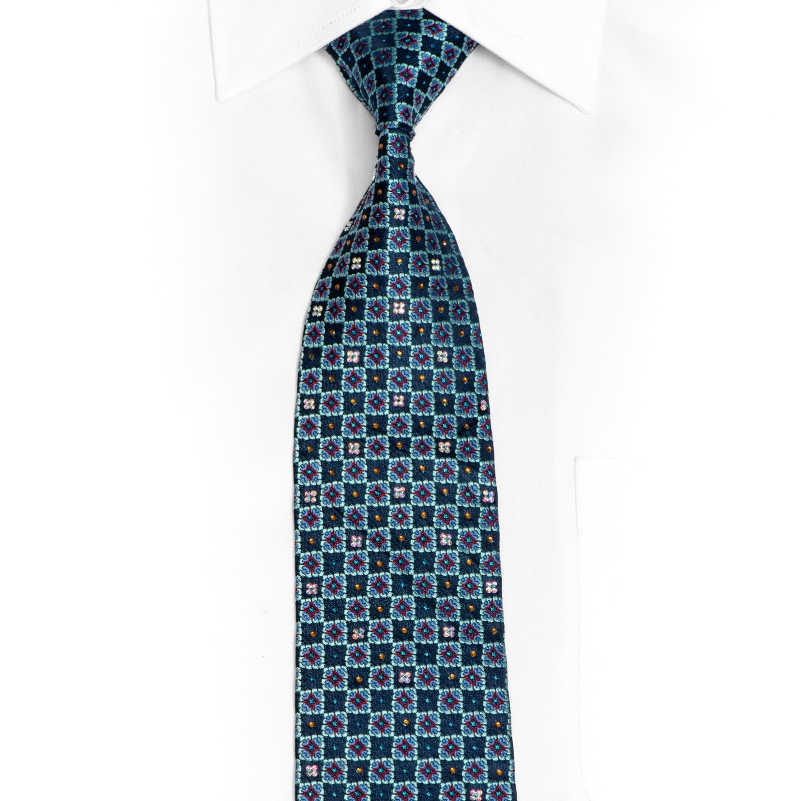 Elevate your style with this blue silk tie featuring a floral checkered pattern adorned with sparkling blue rhinestones for a refined and eye-catching look.