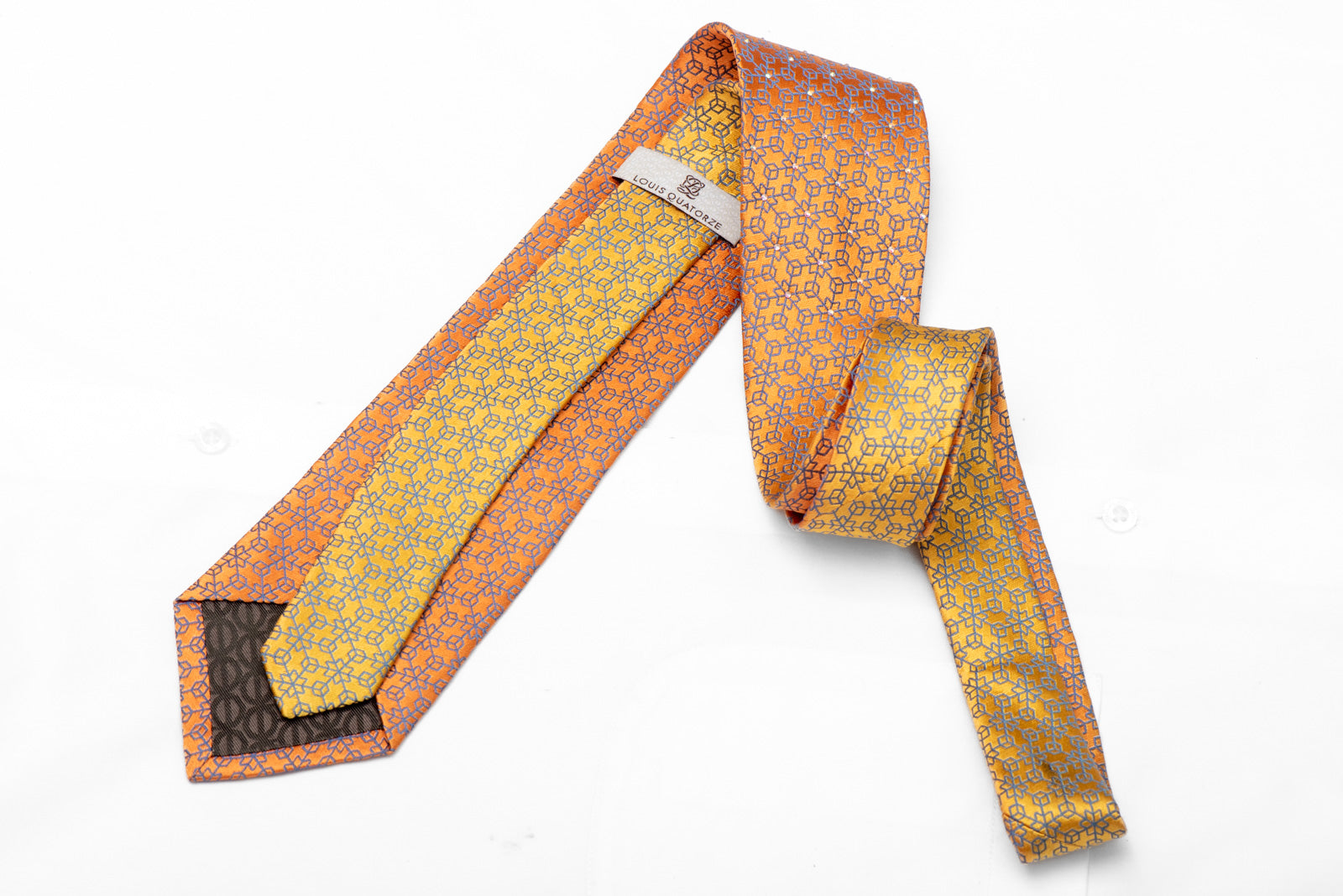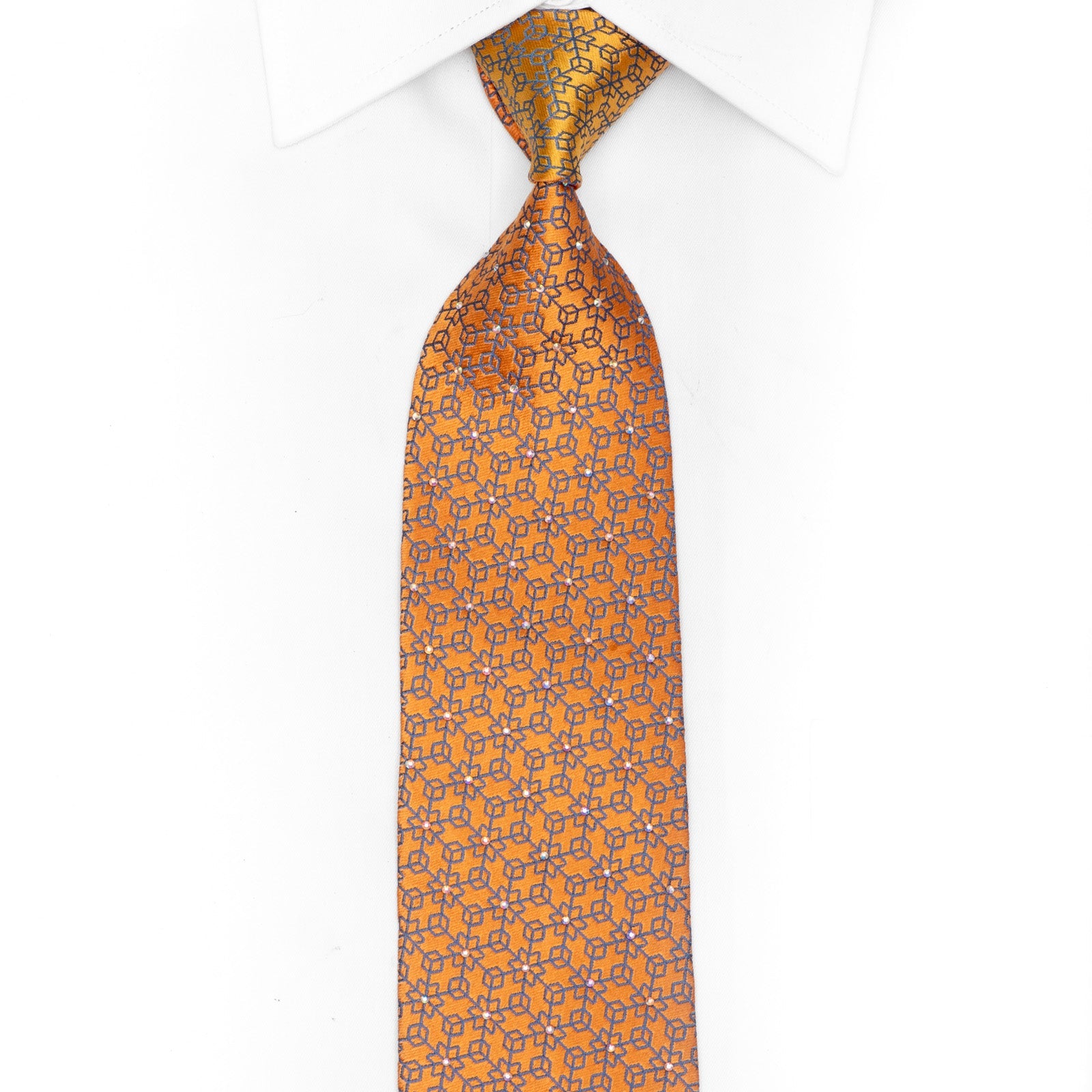 Blue Geometric Trellis On Orange Rhinestone Silk Necktie - 1