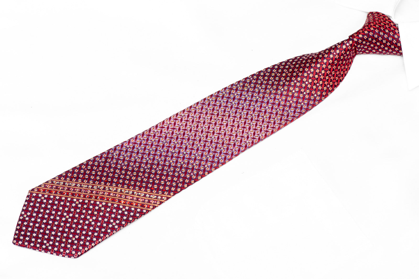 Step up your style game with our beautiful Blue Gold Geometric On Burgundy Rhinestone Silk Tie featuring Gold Sparkles. Perfect for any occasion, this tie will add a touch of elegance to any outfit.