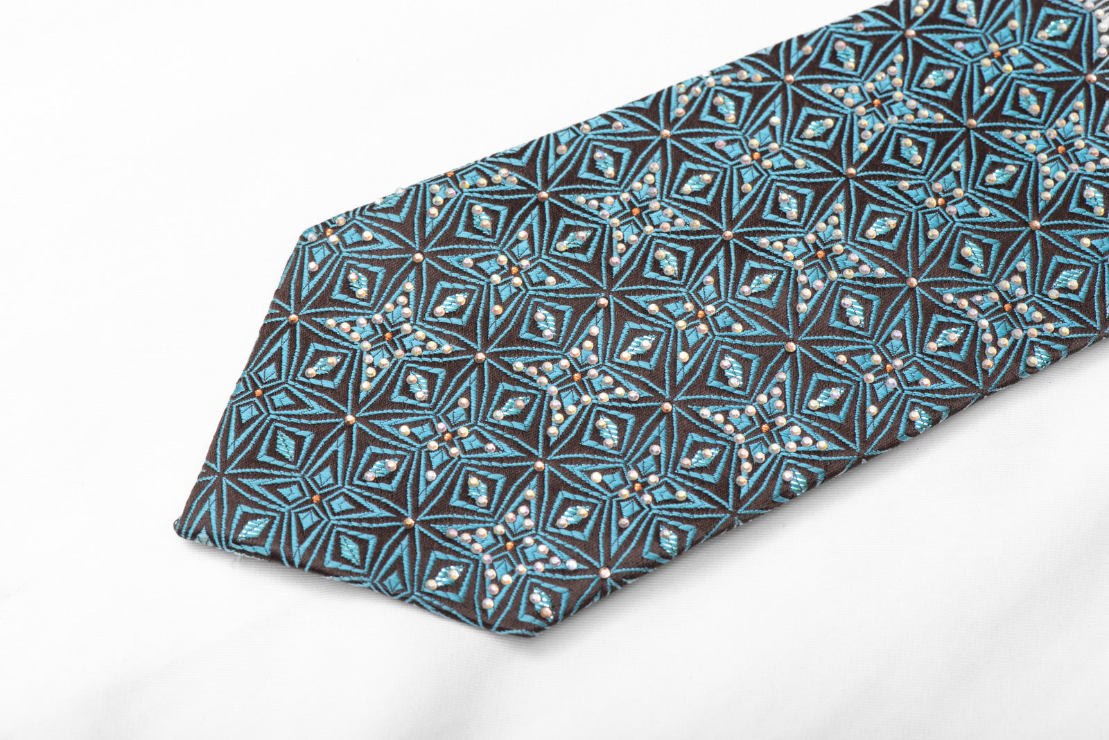 Eleve o seu estilo com nossa gravata de treliça geométrica azul-petróleo em seda com strass marrom. O intrincado design de treliça, embelezado com strass brilhantes, adiciona um toque de sofisticação a qualquer roupa. Feita em seda luxuosa, esta gravata exala elegância e charme. Atualize seu guarda-roupa com este acessório indispensável.
