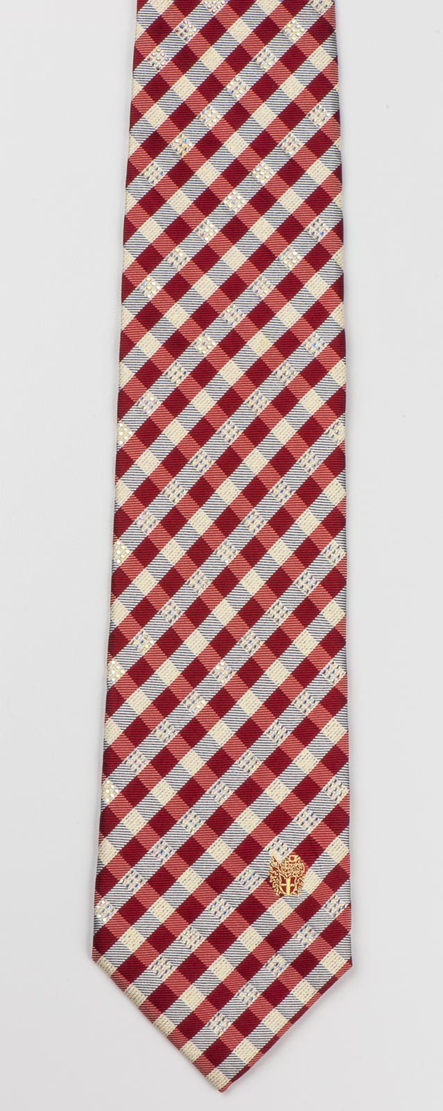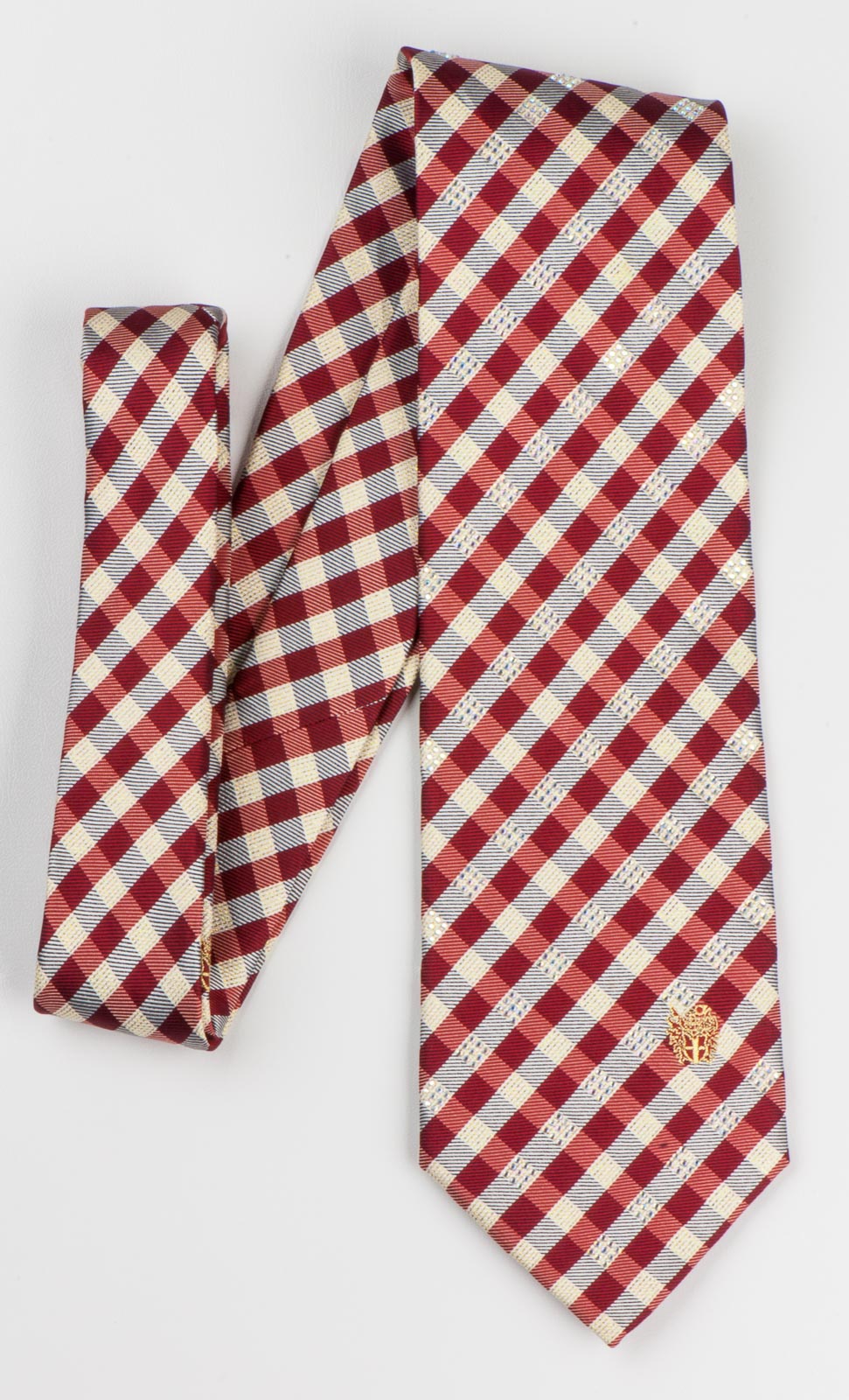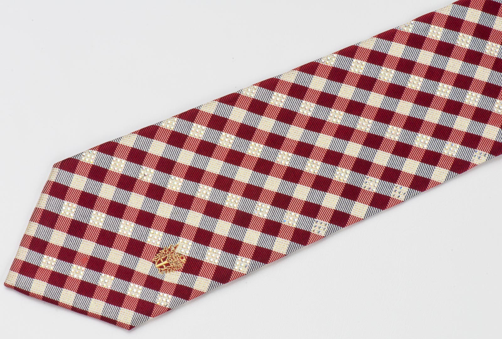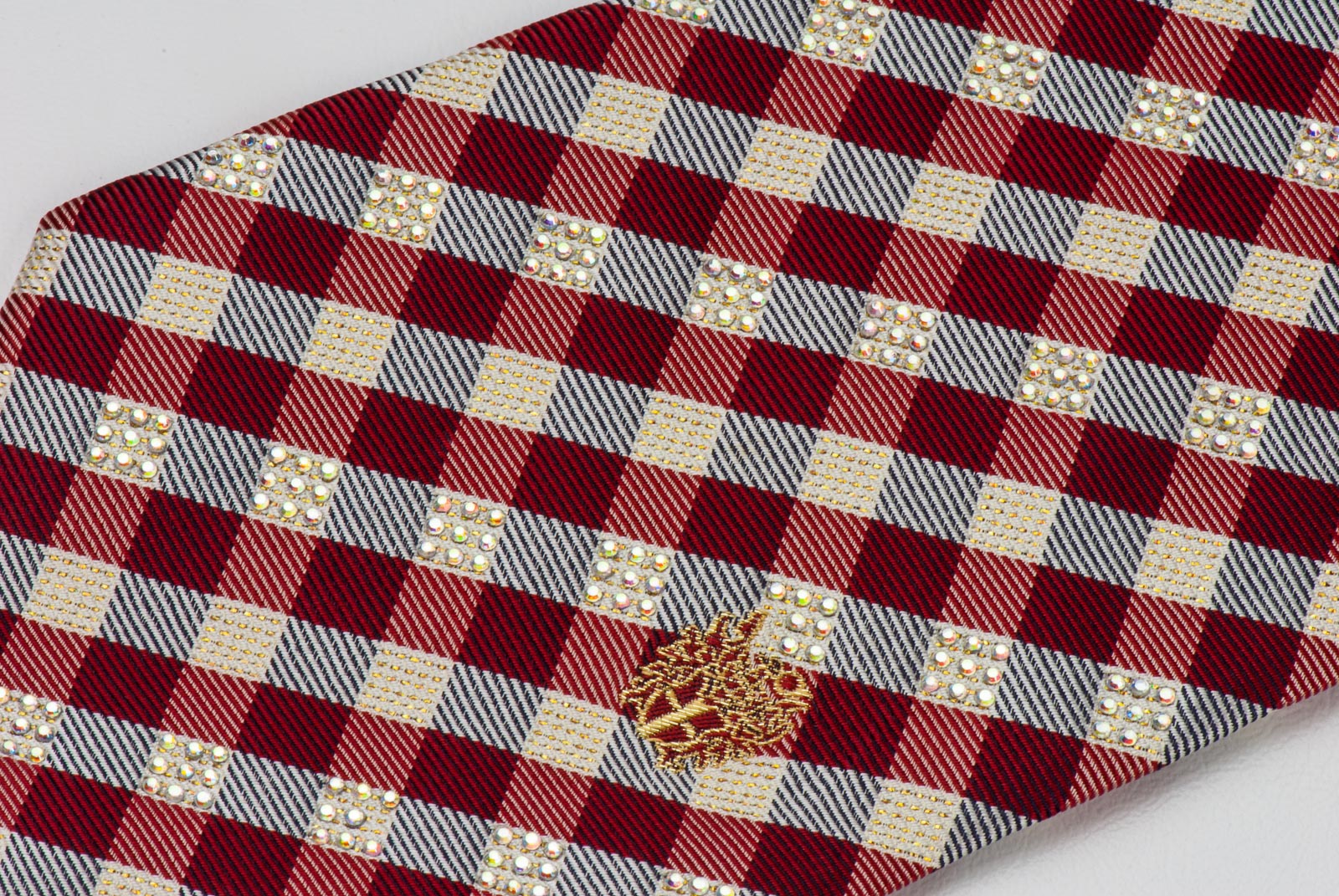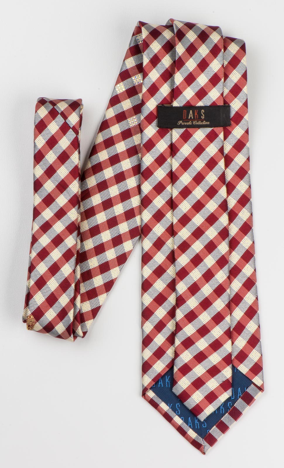 Elegante mão fez homens tecida gravata de seda desenhada por Daks, apresentando um maravilhoso design vermelho, creme e xadrez azul com strass brancos.