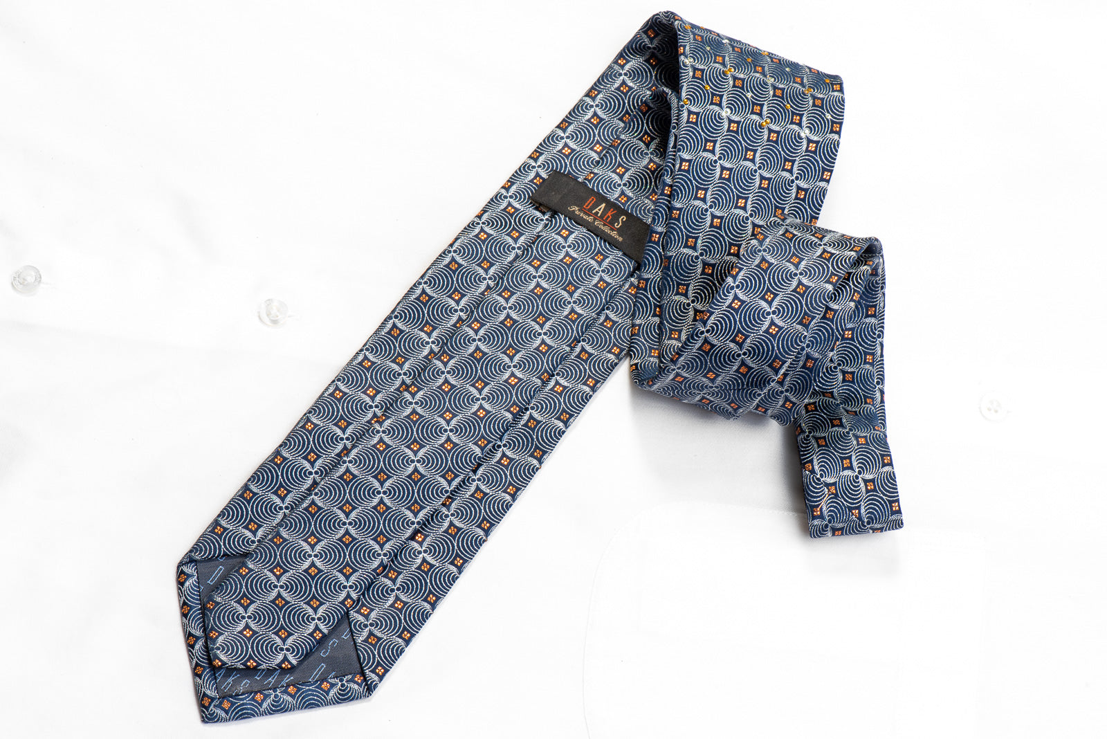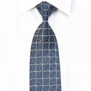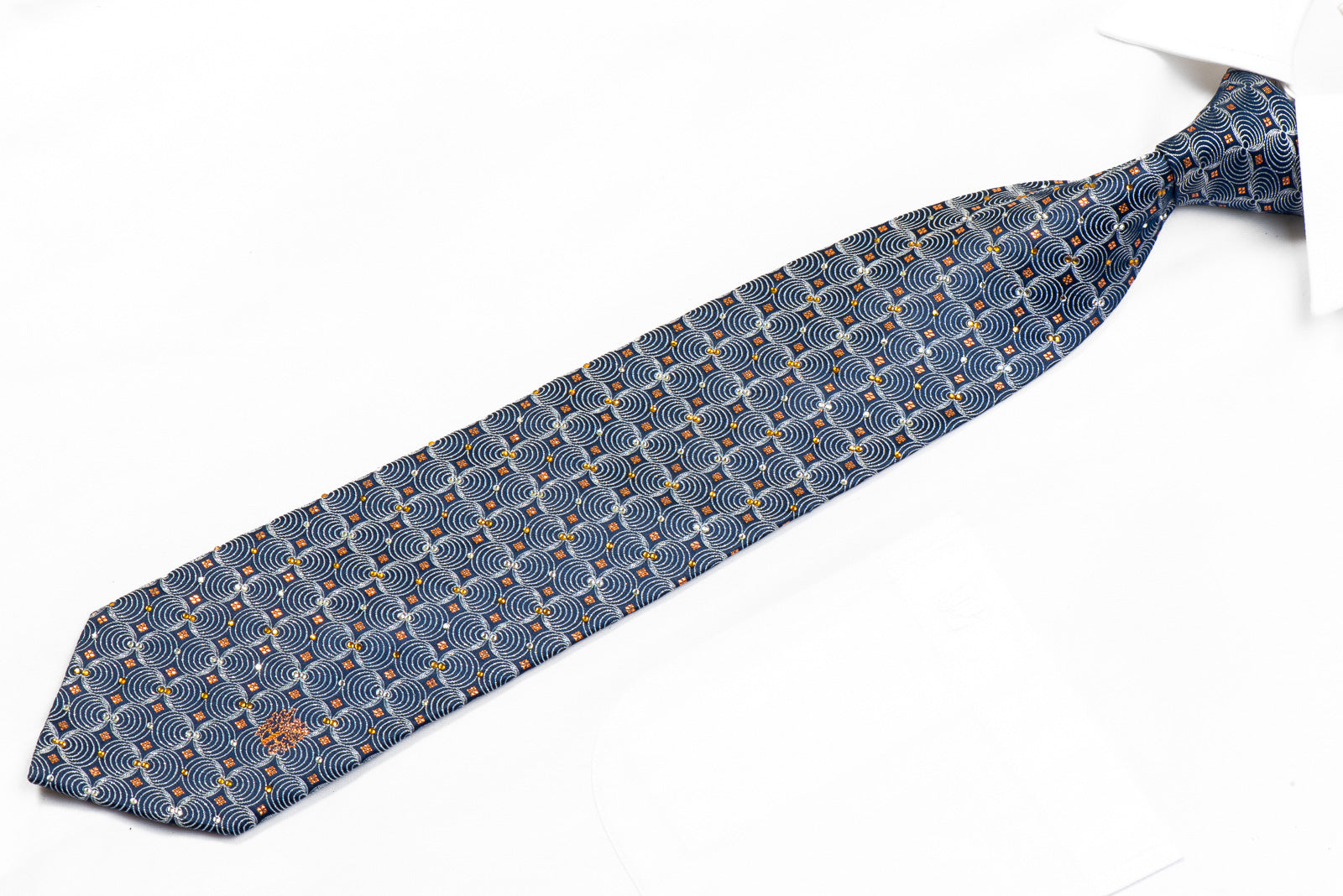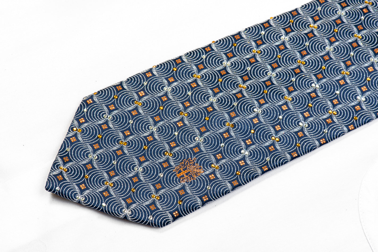 Gravata de seda rhinestone masculina elegante feita à mão e projetada pela marca de topo Daks. Apresentando um elegante design geométrico de prata tecida em azul marinho, brilhando com strass cristalinos e embelezado com brilhos metálicos de laranja.