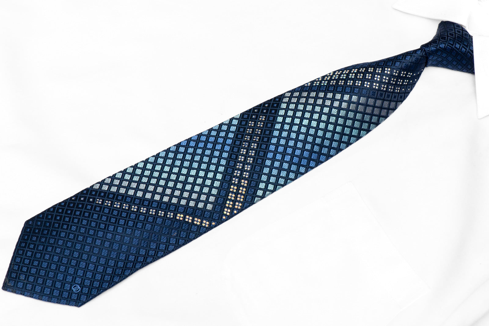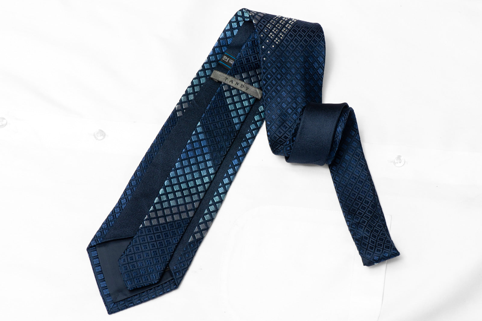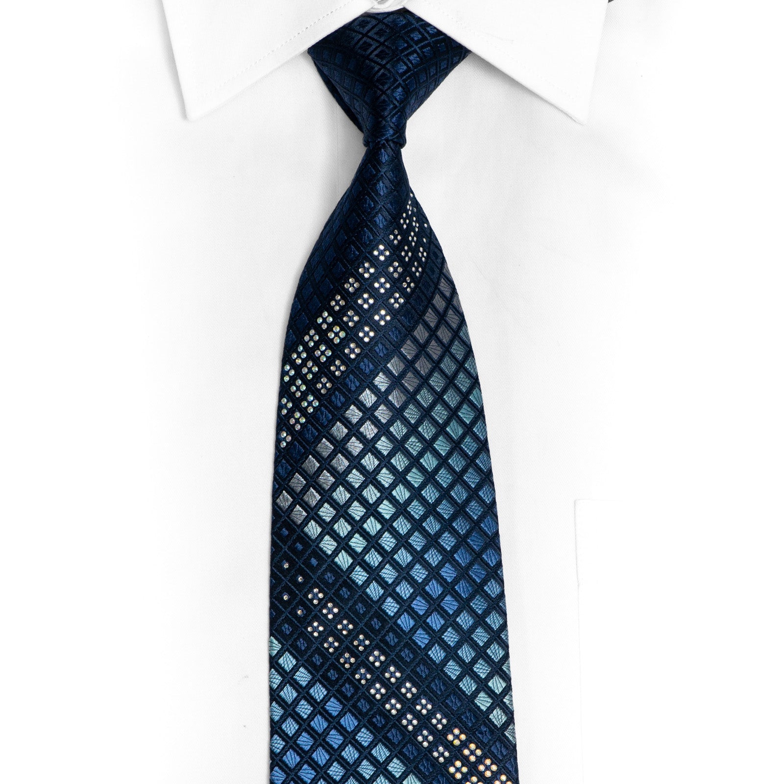 Navy Silk Necktie featuring an elegant geometric chevron pattern adorned with subtle rhinestone accents. This sophisticated accessory combines classic design with a touch of sparkle, perfect for elevating your formal or business attire.