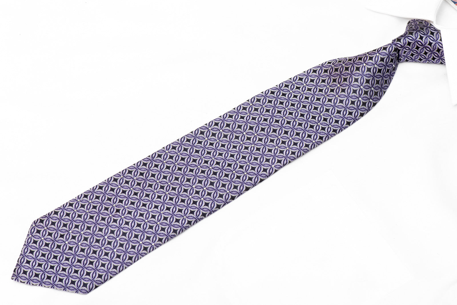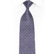 Elevate your formal wardrobe with this striking silk tie featuring a captivating geometric design. Interlocking purple and silver circles dance across a rich navy base, while sparkling rhinestones catch the light with every movement. Crafted from premium silk, this tie combines sophisticated style with eye-catching elegance, making it the perfect choice for special occasions, professional events, or when you want to make a confident statement.