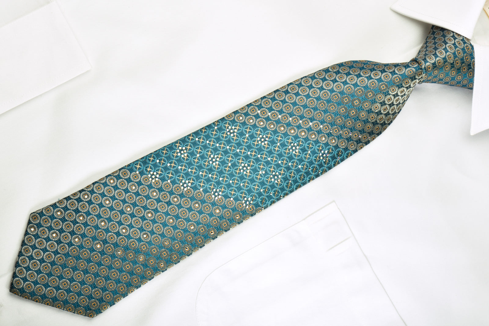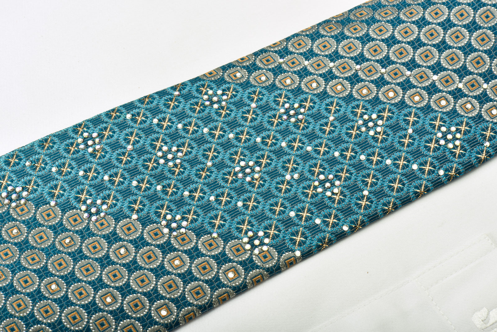 Material - Seda Design - Geométrico Cor - Ouro, prata, turquesa Comprimento - Clássico (57 pol.-60 pol.)(145 cm-153 cm) Largura - Clássico (3 1/4 pol.-3 3/4 pol.)(8 cm-9,5 cm) Recursos especiais - Brilhos dourados, brilhos prateados, strass brancos Fornecedor - San-Dee