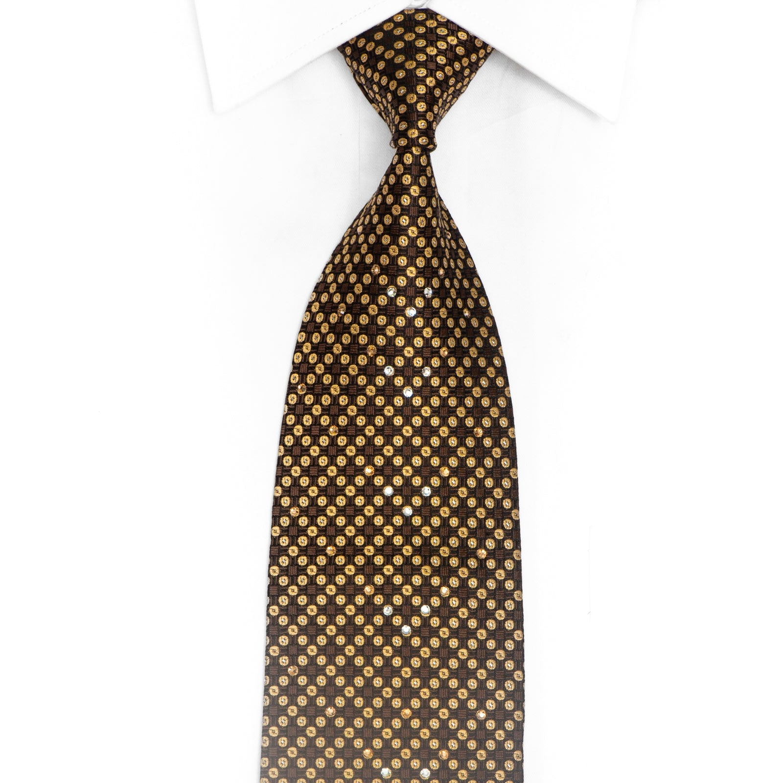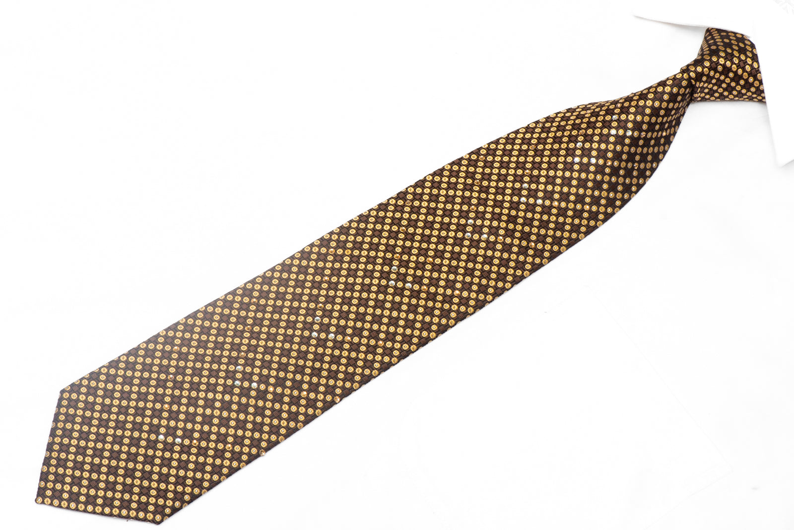 Introducing our Gold Geometric Dota On Black Rhinestone Silk Tie With Silver Sparkles - a perfect blend of elegance and sparkle. This tie is designed to make any outfit stand out and add a touch of sophistication.