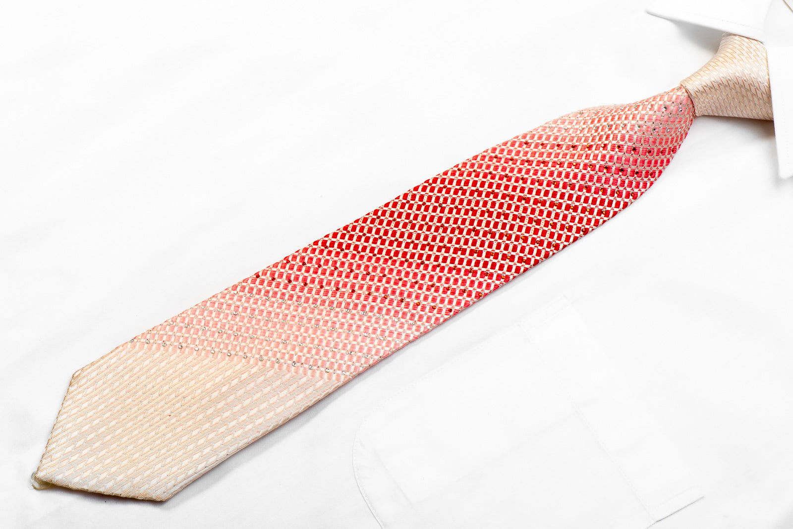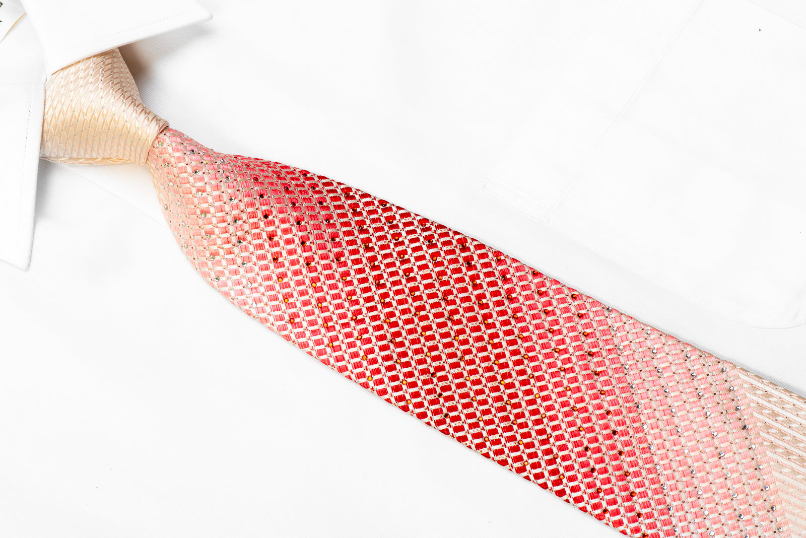 Material - Seda Design - Geométrico Cor - Rosa, Vermelho Comprimento - Clássico (57 pol.-60 pol.)(145 cm-153 cm) Largura - Clássico (3 1/4 pol.-3 3/4 pol.)(8 cm-9,5 cm) Recursos especiais - Strass de cristal, brilhos dourados, strass vermelhos, brilhos prateados Fornecedor - San-Dee