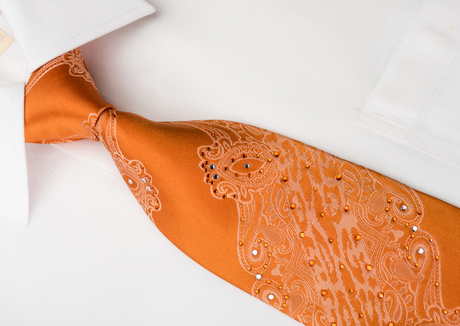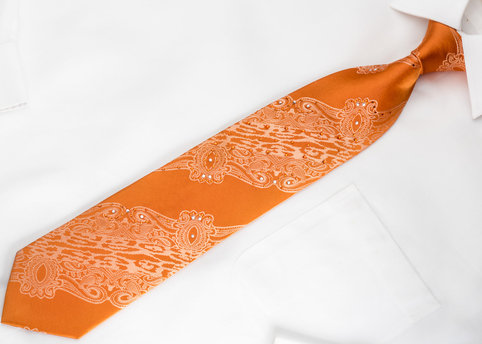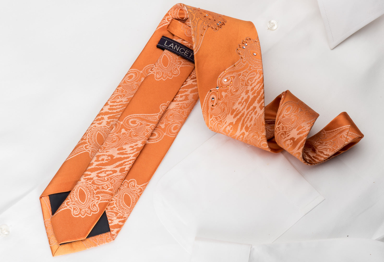 Gravata de seda masculina linda, feita à mão da seda de melhor qualidade e projetada pela marca lancetti. Apresentando um belo design barroco em seda tecida laranja e espumante com, laranja, strass branco.