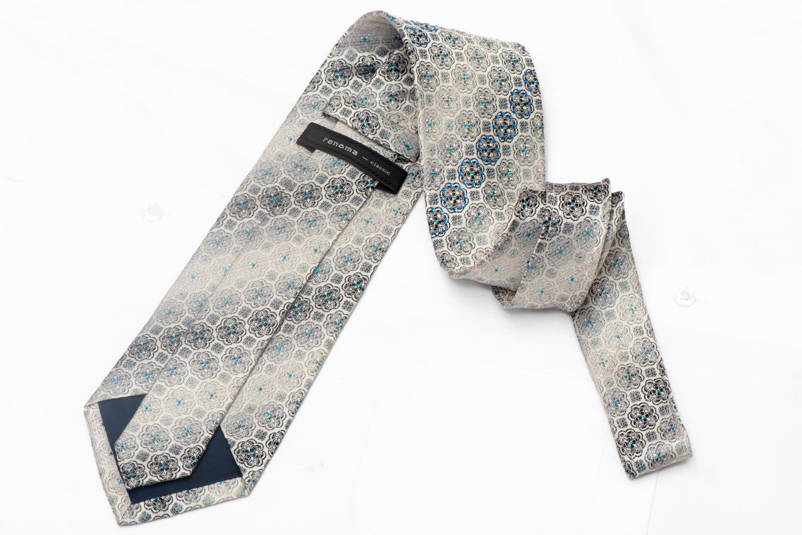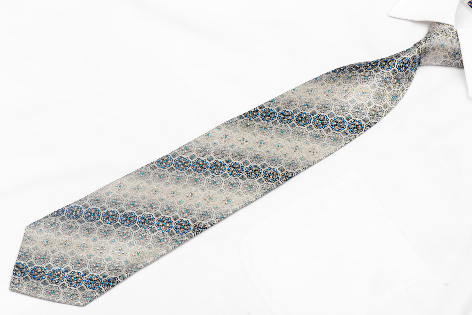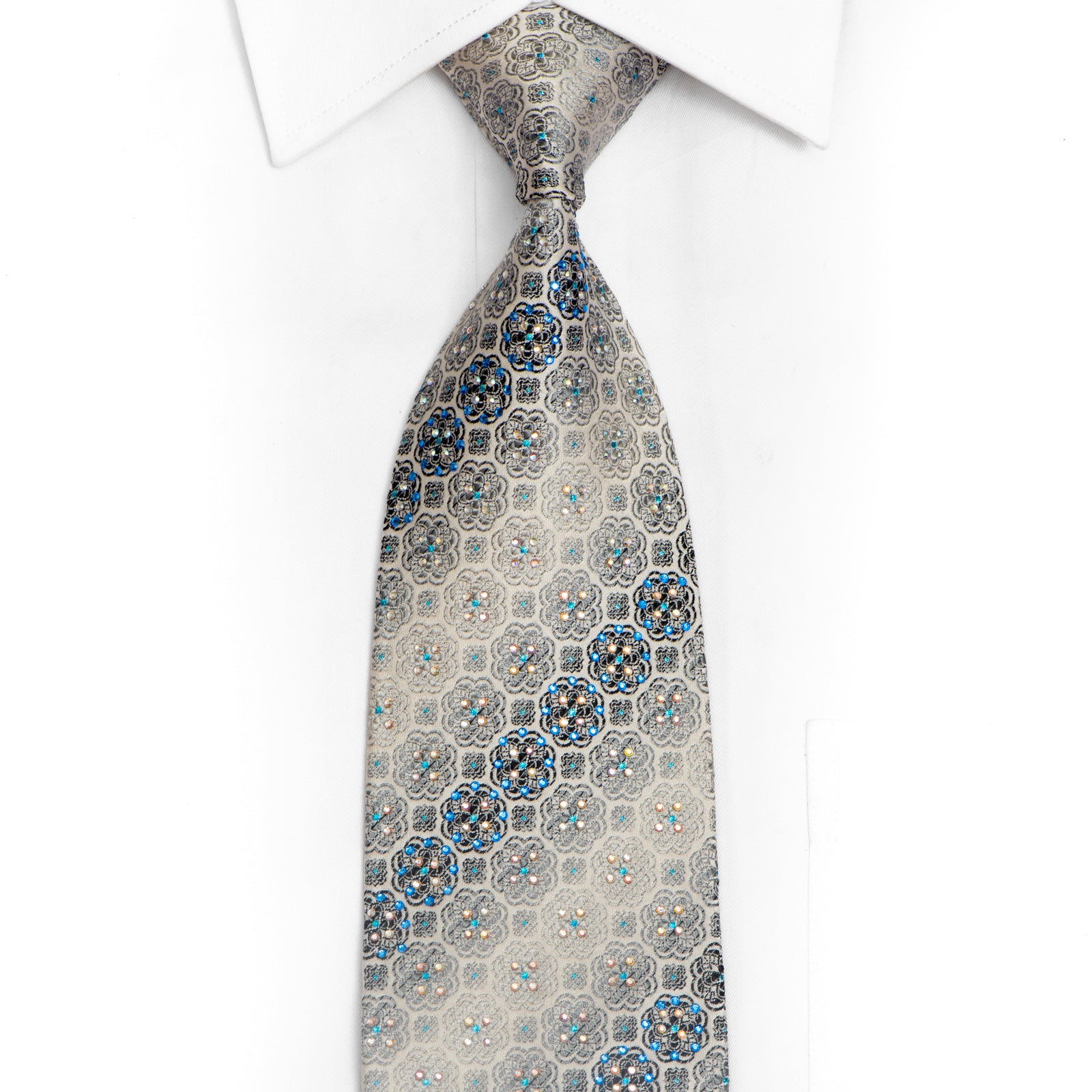 Medallion Patterns On Silver Rhinestone Silk Necktie With Blue Sparkles