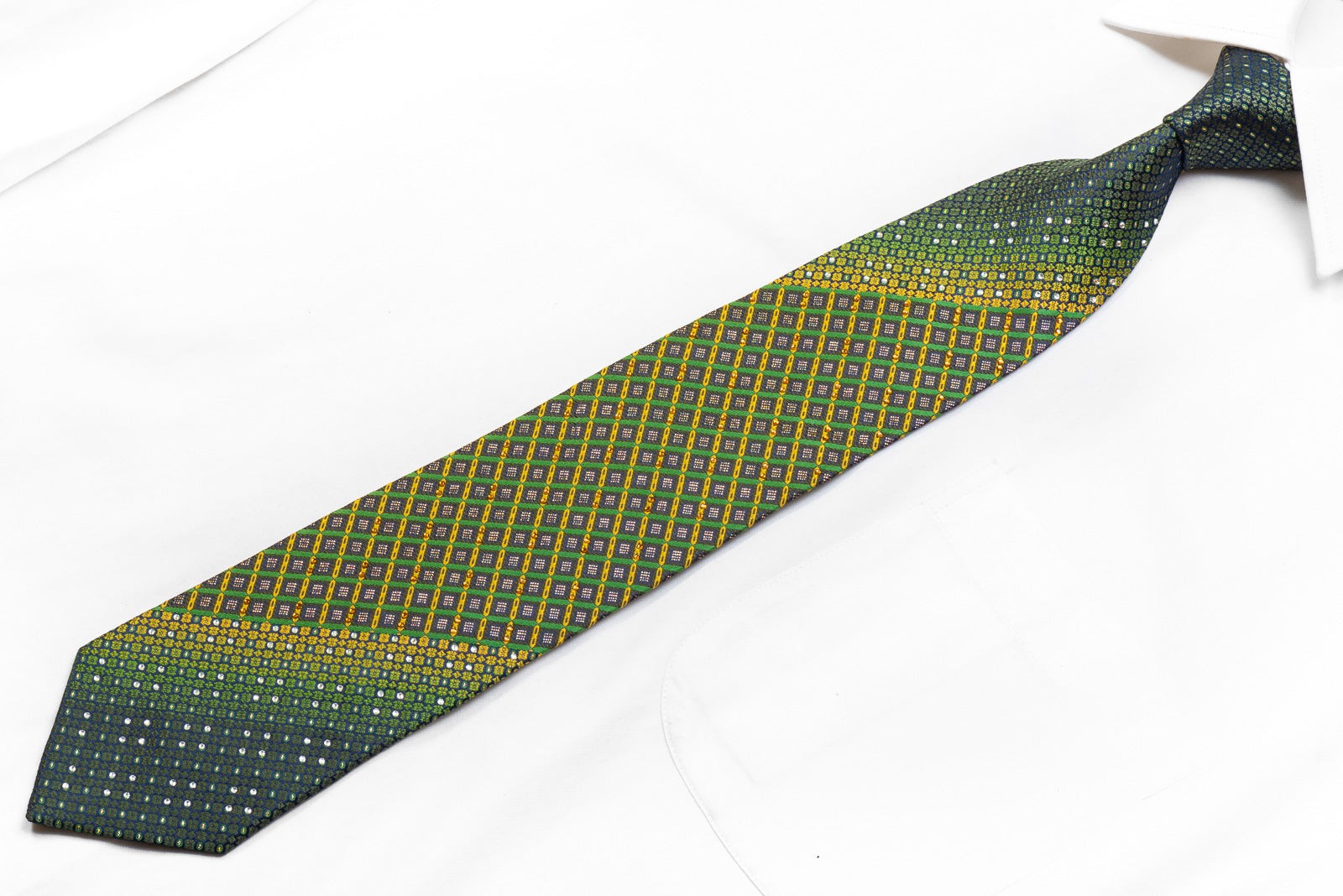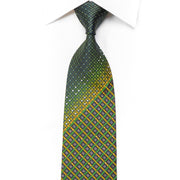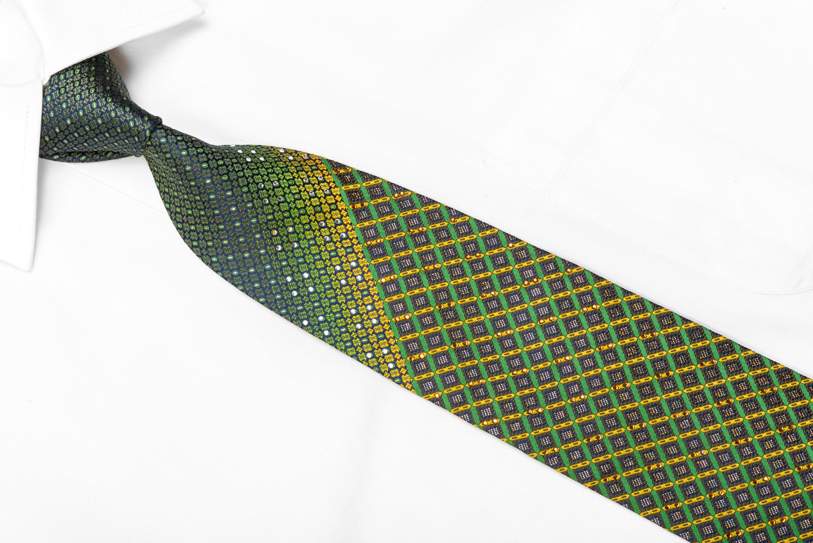 Gravata de cristal masculino elegante, perfeita para todas as ocasiões feita à mão da seda de melhor qualidade. Apresentando um elegante design listrado e geométrico verde tecido na marinha, brilhando com strass cristalinos e brilhos metálicos de prata.