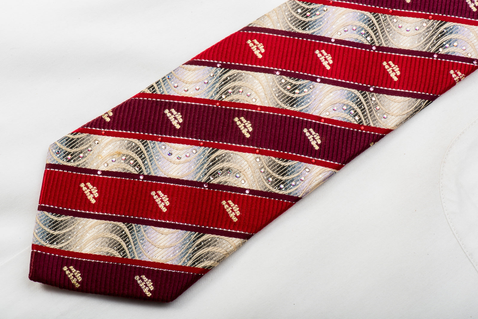 Material - Seda Design - Listrado Cor - Borgonha, Vermelho, Prata Comprimento - Clássico (57 pol.-60 pol.)(145 cm-153 cm) Largura - Clássico (3 1/4 pol.-3 3/4 pol.)(8 cm-9,5 cm) Recursos especiais - Strass rosa, strass vermelhos, brilhos prateados, strass brancos Fornecedor - Mila Schon