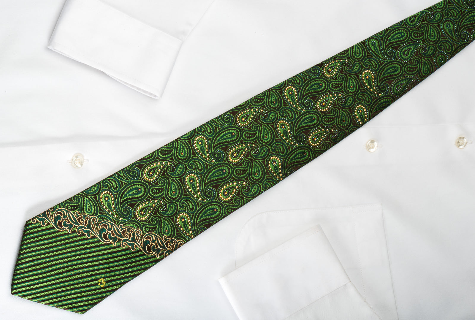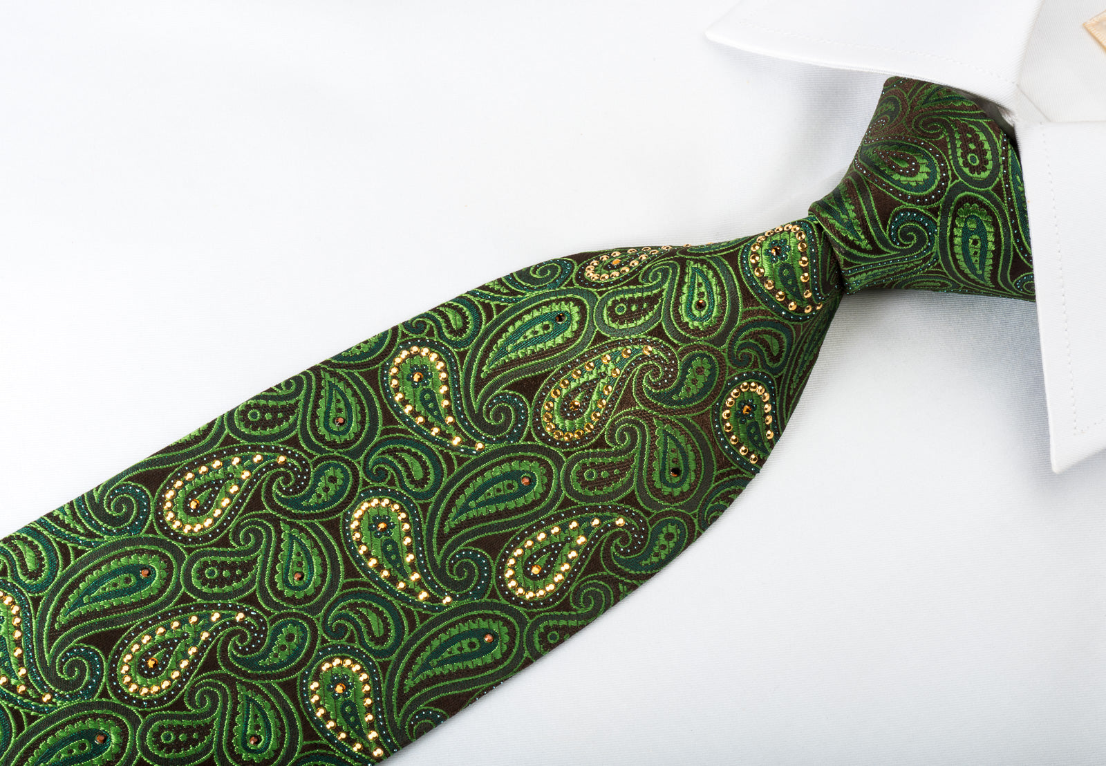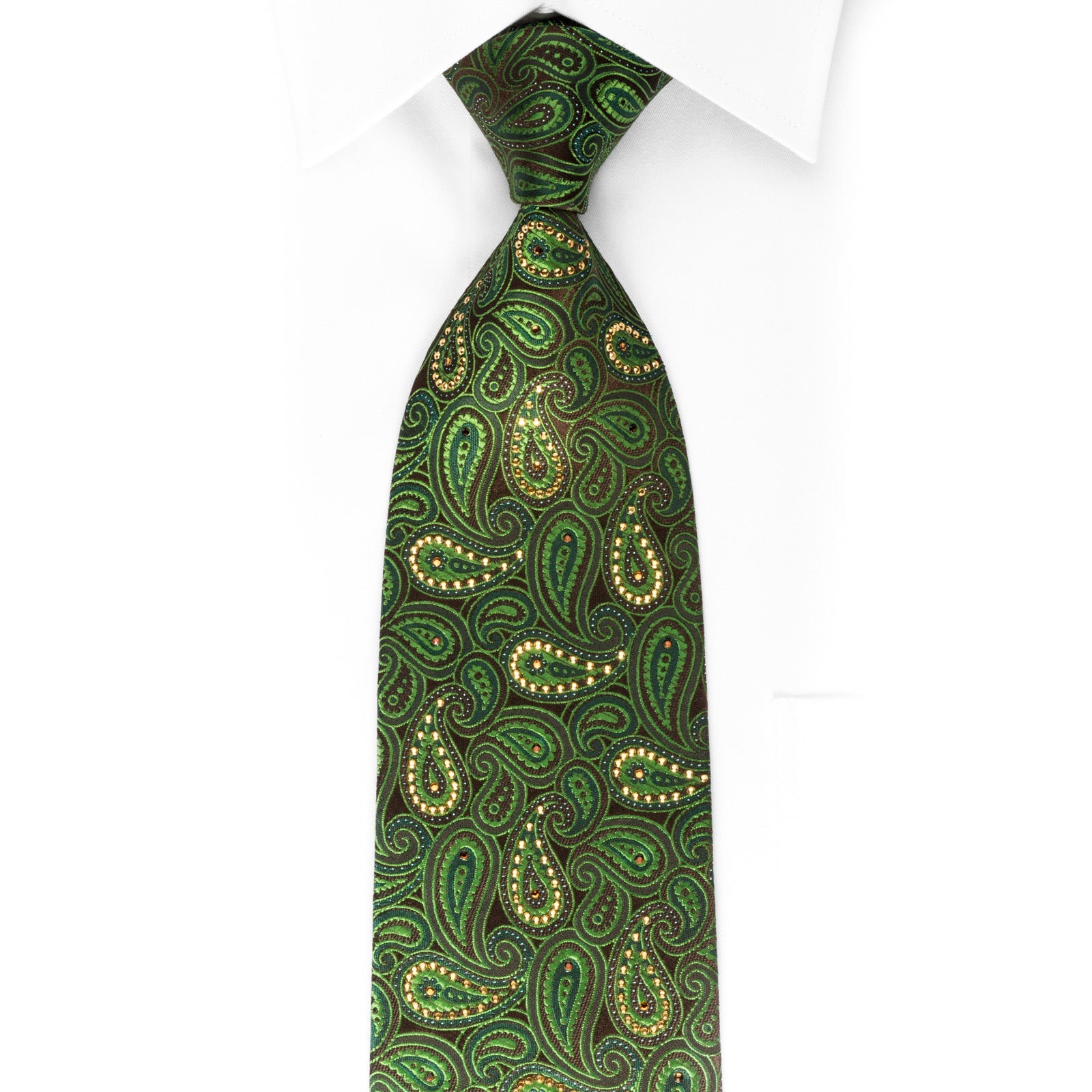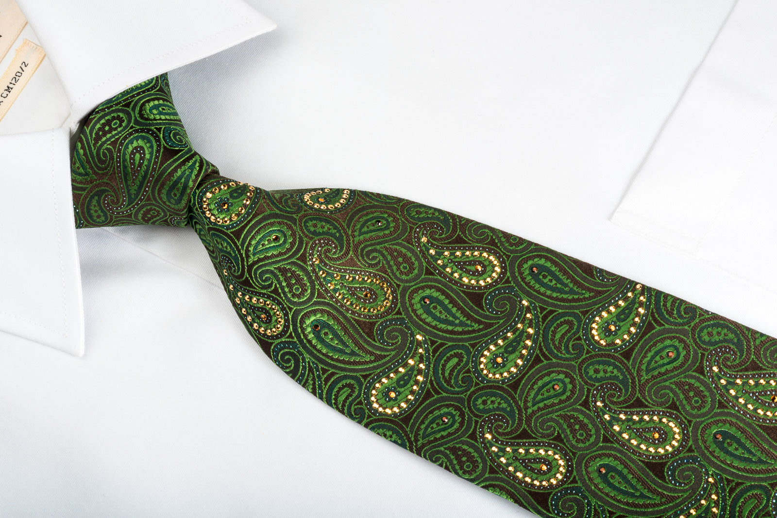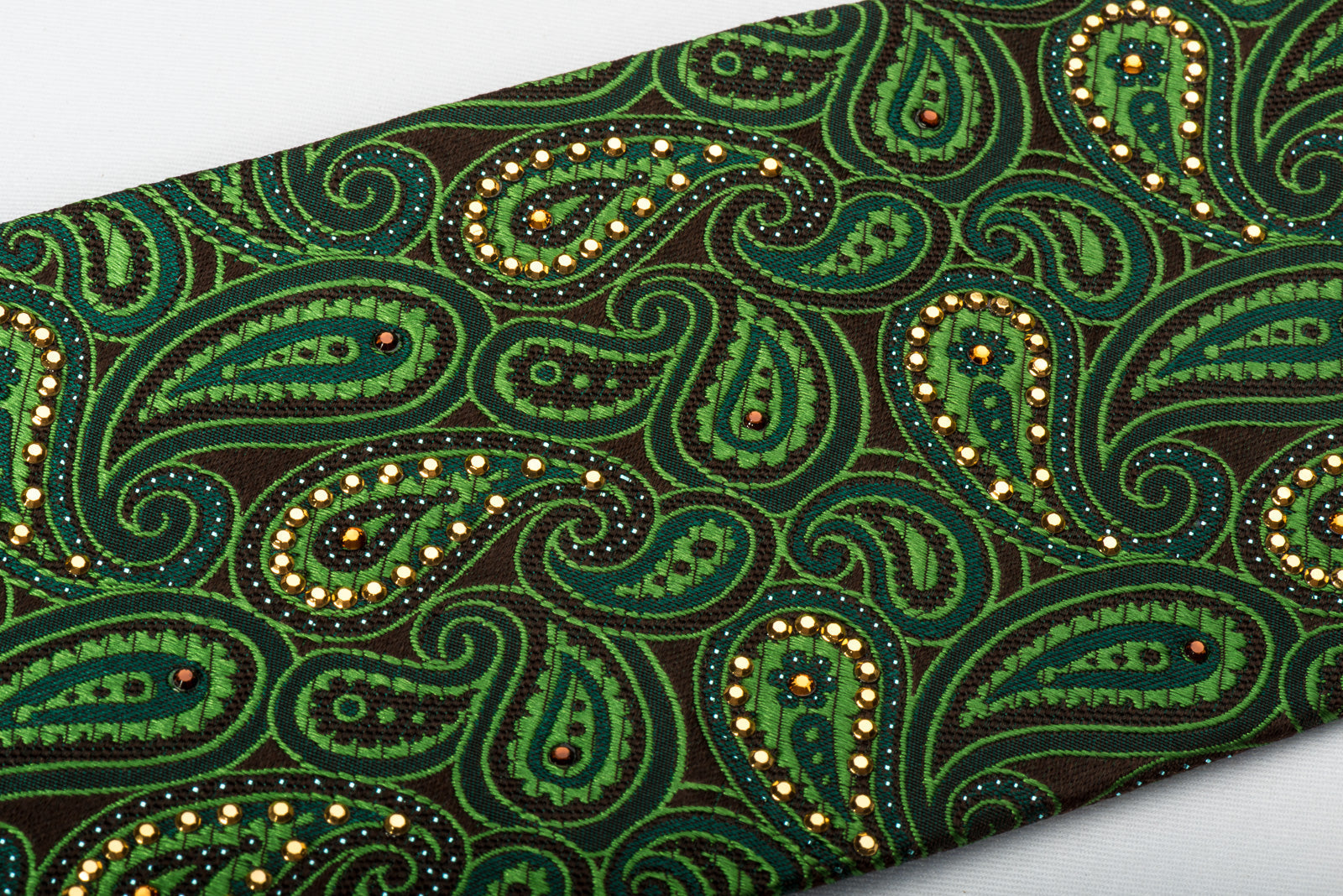 Material - Seda Design - Paisley Cor - Marrom, Dourado, Verde Comprimento - Clássico (57 pol.-60 pol.)(145 cm-153 cm) Largura - Clássico (3 1/4 pol.-3 3/4 pol.)(8 cm-9,5 cm) Recursos especiais - Strass dourados, brilhos dourados, brilhos verdes, strass brancos Fornecedor - Mila Schon