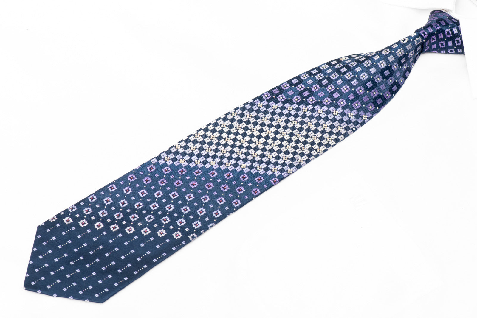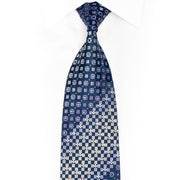Discover the perfect blend of classic sophistication and modern glamour with this exquisite woven silk tie adorned with shimmering silver rhinestones. This stunning piece features an intricate checkered pattern in rich navy blue with lavender and silver accents, creating a mesmerizing gradient effect that transitions from deep navy at the top to lighter tones toward the bottom.
