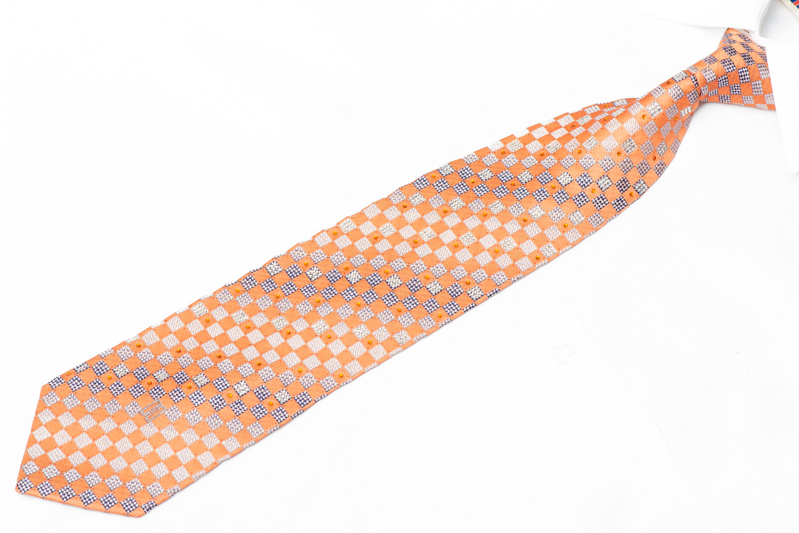 Elevate your formal attire with this exquisite woven silk tie featuring a sophisticated checker pattern in warm orange tones. This luxurious accessory combines traditional craftsmanship with contemporary embellishment, showcasing delicate rhinestones and silver sparkles that catch the light beautifully.
