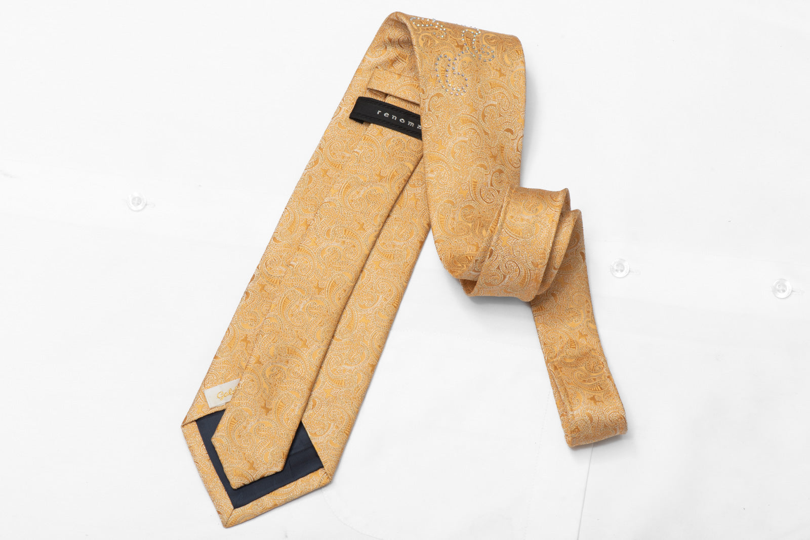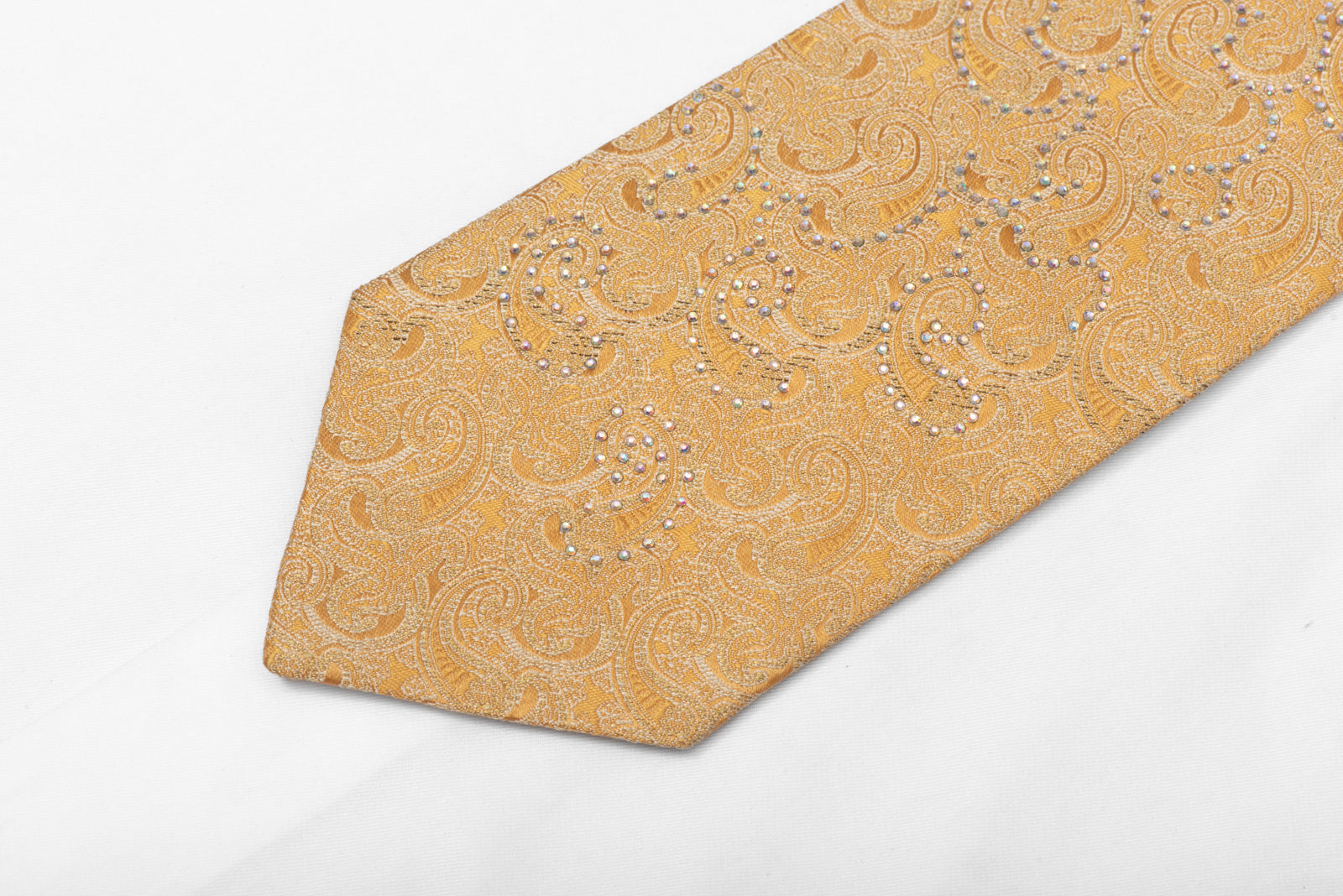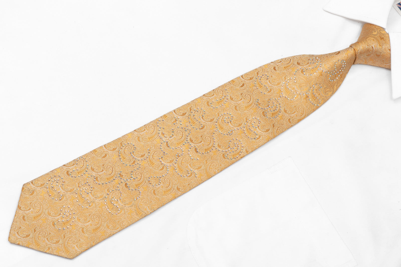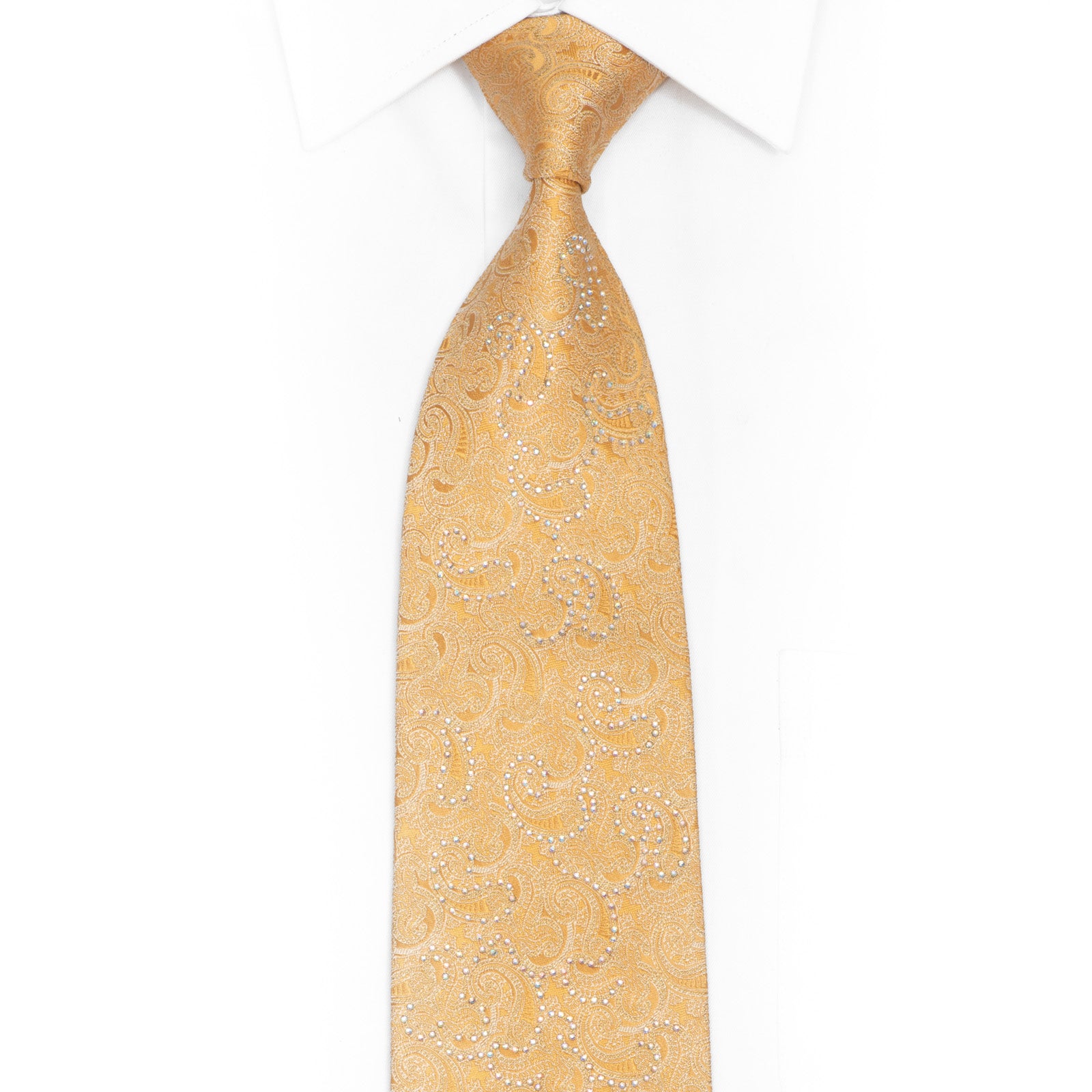 Add some sparkle to your wardrobe with our Paisley Design Yellow Rhinestone Silk Tie, featuring stunning gold details. It's the perfect statement piece for any occasion.