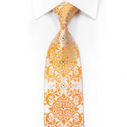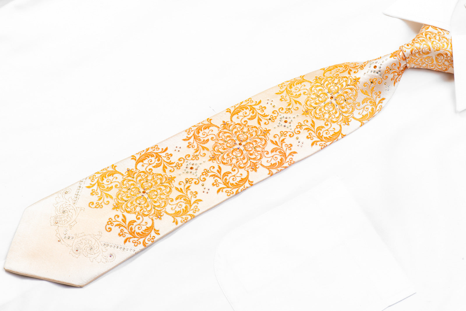 Material - Seda Design - Damasco Cor - Laranja, Pêssego Comprimento - Clássico (57 pol.-60 pol.)(145 cm-153 cm) Largura - Clássico (3 1/4 pol.-3 3/4 pol.)(8 cm-9,5 cm) Recursos especiais - Strass de cristal, strass laranja, brilhos prateados, strass amarelos Fornecedor - Perry Ellis