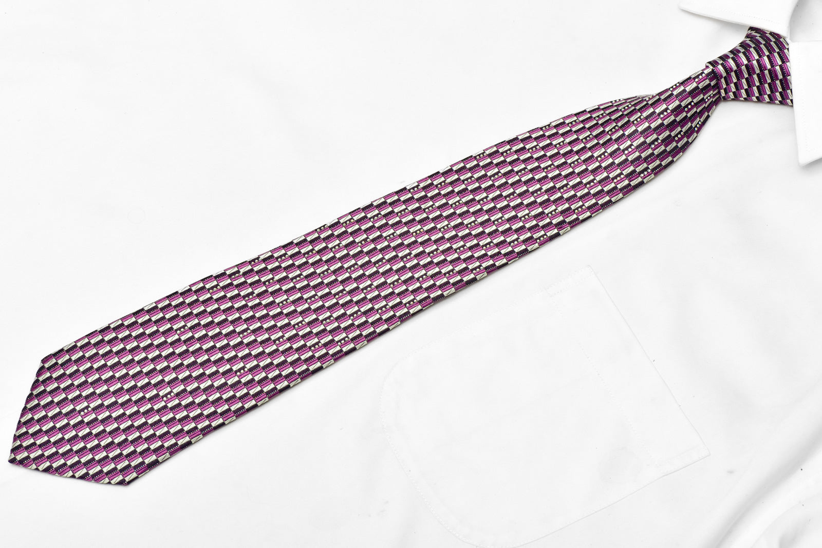 Material - Seda Design - Geométrico Cor - Prata, Roxo, Preto Comprimento - Clássico (48 pol.-60 pol.)(145 cm-153 cm) Largura - Clássico (3 1/4 pol.) (8,5 cm) Recursos especiais - Strass, brilhos prateados Fornecedor - Pierre Cardin