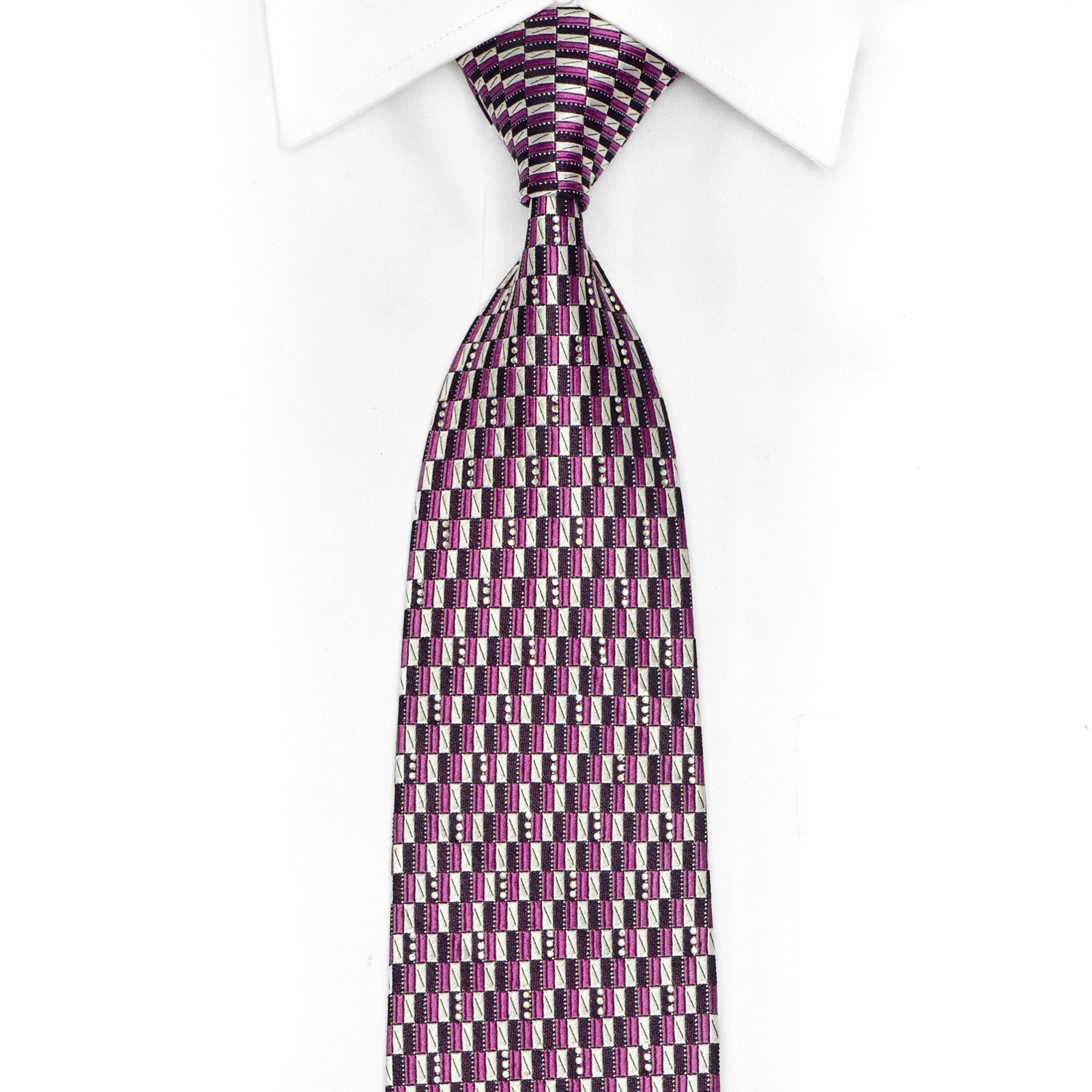 Introducing our stunning Silver Purple Black Geometric Rhinestone Tie With Sparkles! This tie is the perfect addition to your collection with its unique design and dazzling sparkles. It's the perfect accessory for adding some personality to any outfit.