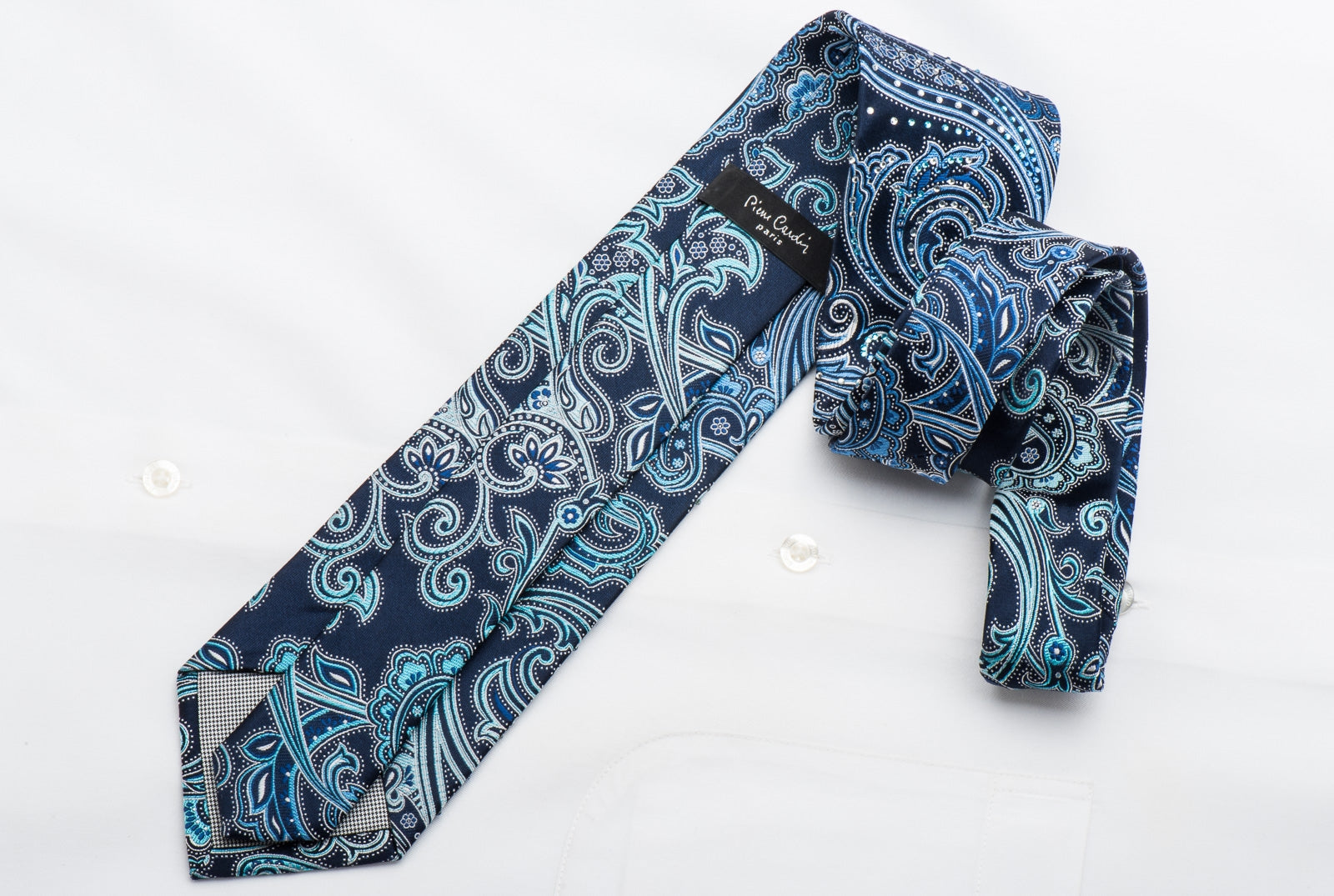 Gravata de seda masculina bonita feita à mão da seda de melhor qualidade e projetada pelo top de marca Pierre Cardin. Apresentando um maravilhoso design Paisley em azul. brilhando com strass branco e azul de cristal.