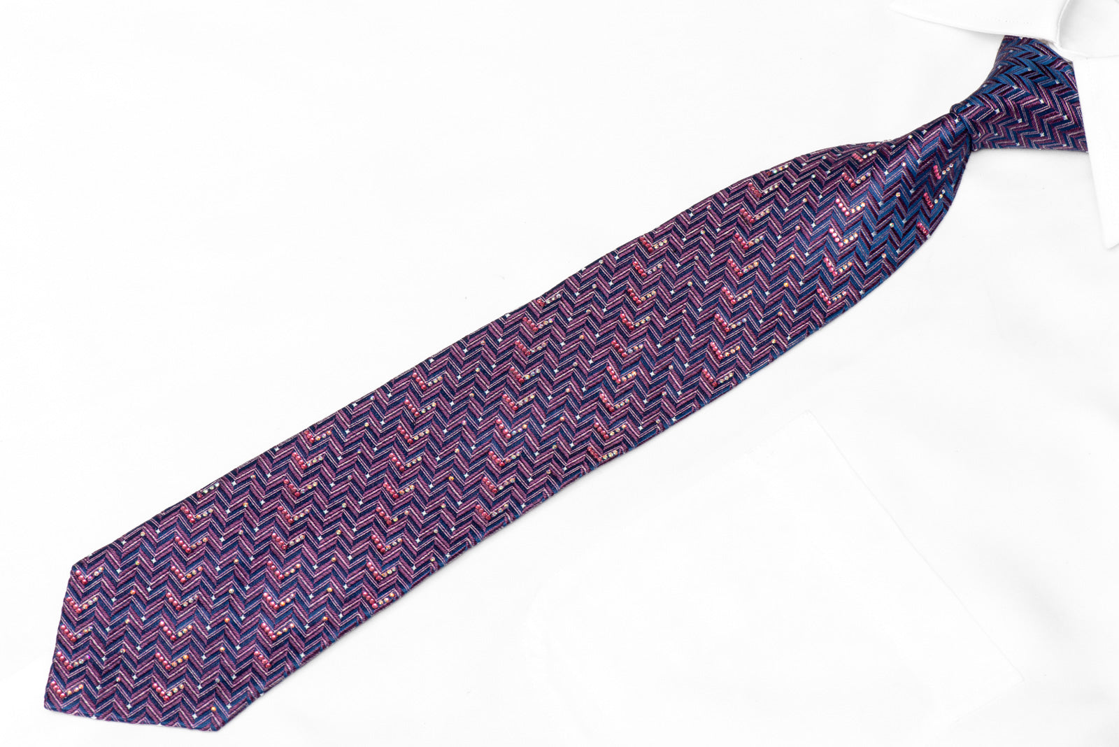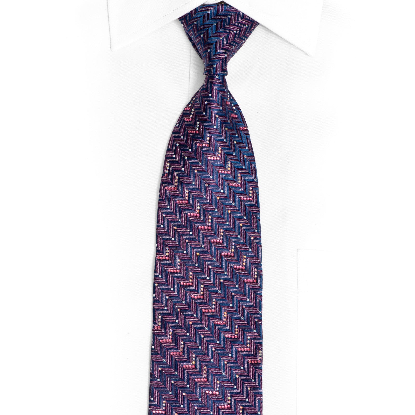 This silk necktie features a pink and purple chevron stripe design, accented with sparkling rhinestones for a refined and stylish look.