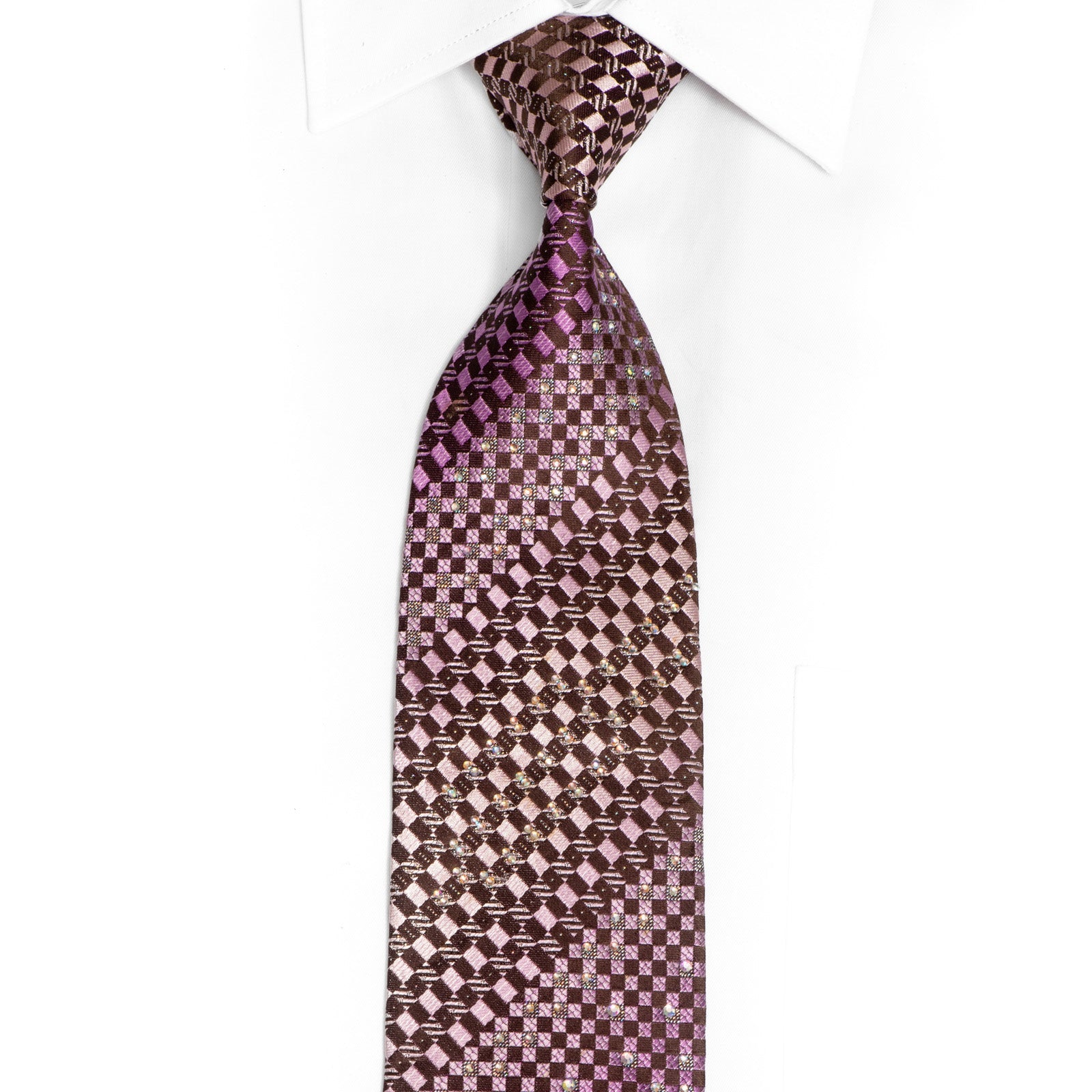 This elegant tie features a purple checkered pattern on a rich brown background, adorned with sparkling silver rhinestones. Perfect for adding a touch of sophistication and sparkle to any outfit.