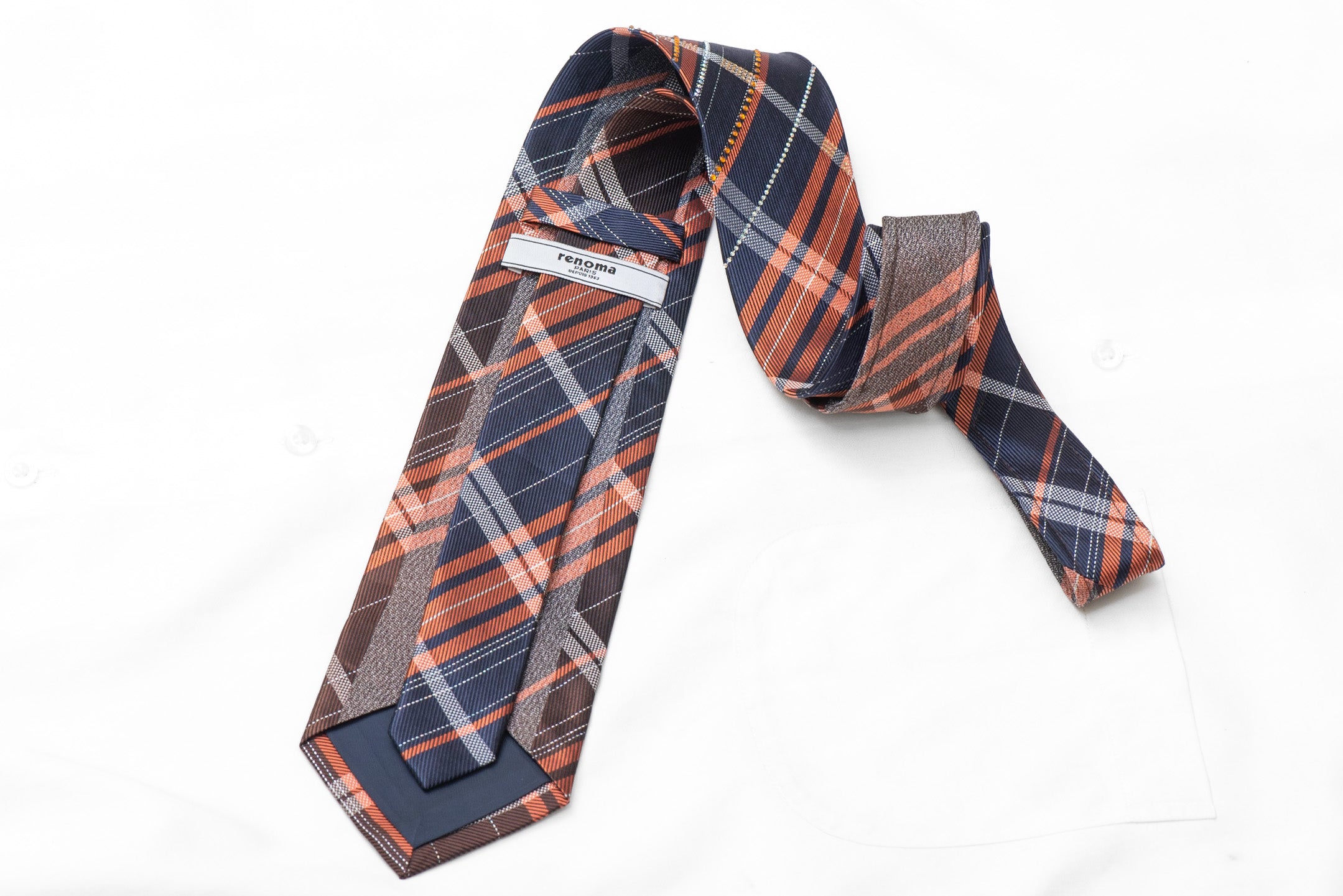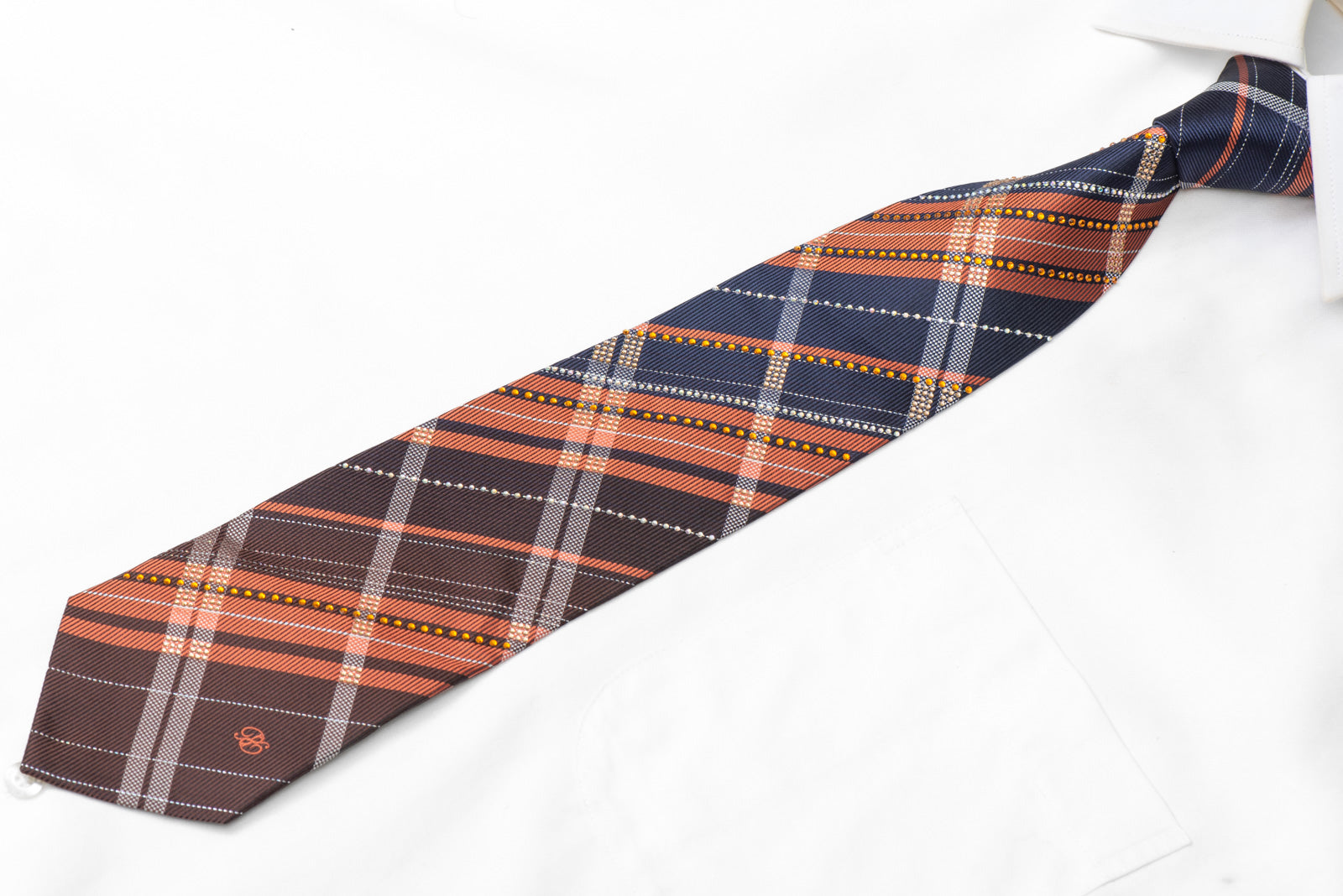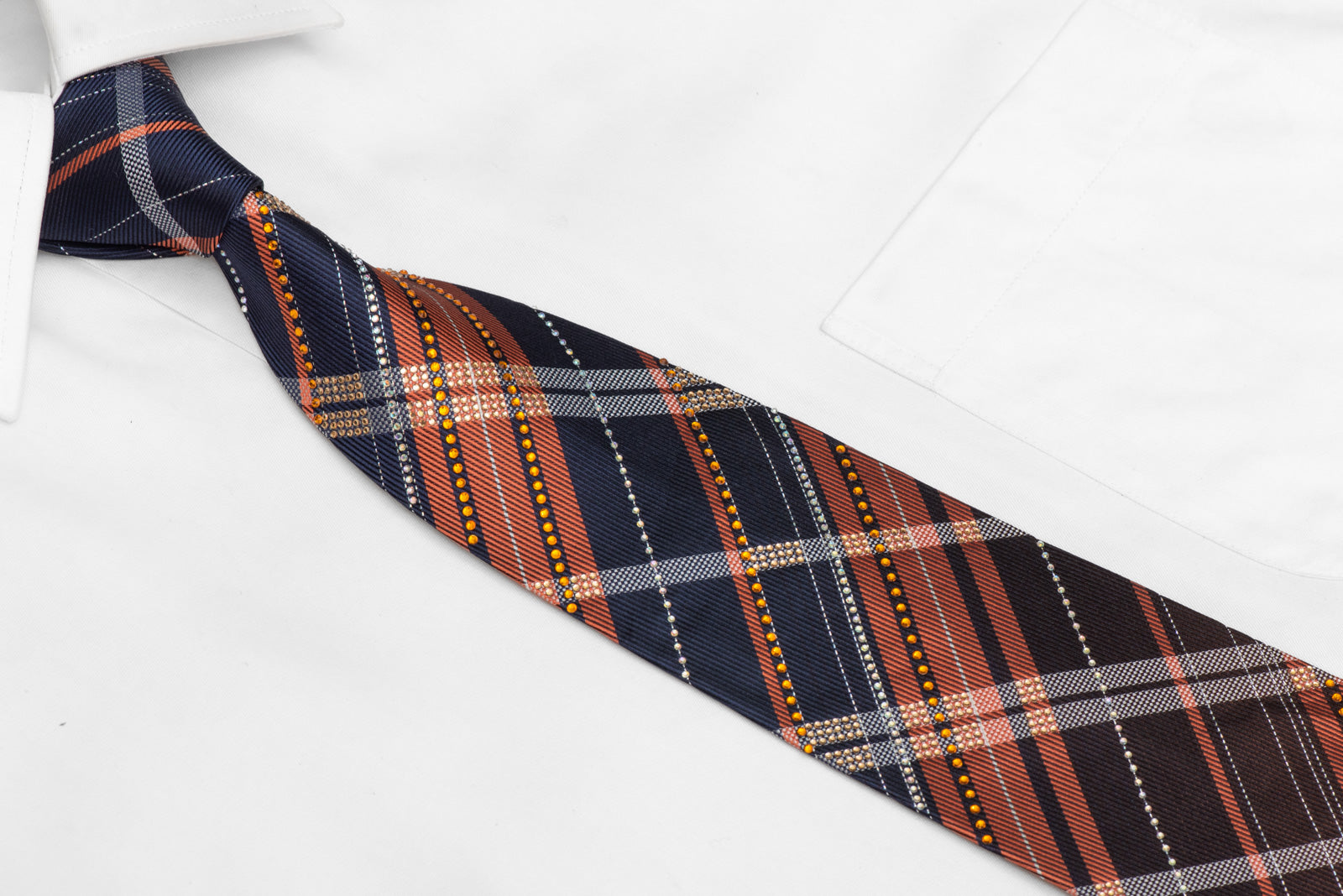 Material - Seda Design - Xadrez Cor - Laranja, Azul, Prata Comprimento - Clássico (48 pol.-60 pol.)(145 cm-153 cm) Largura - Clássico (3 1/4 pol.) (8,5 cm) Recursos especiais - Strass, brilhos prateados Fornecedor - Renoma