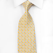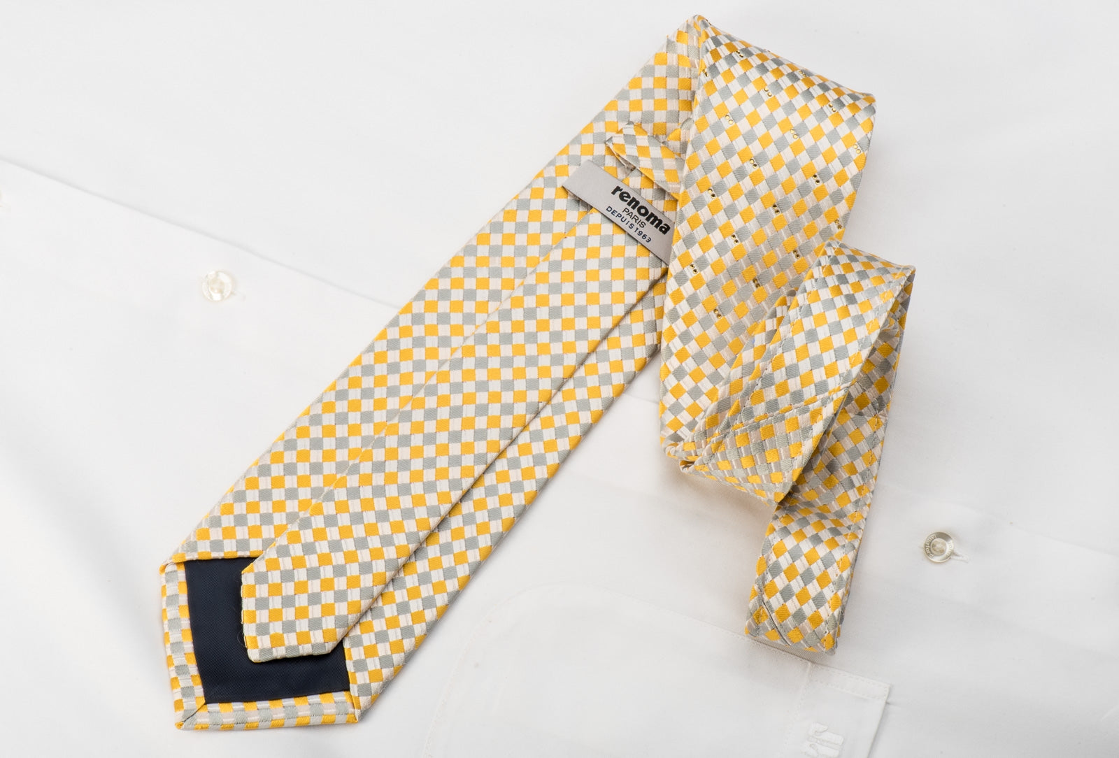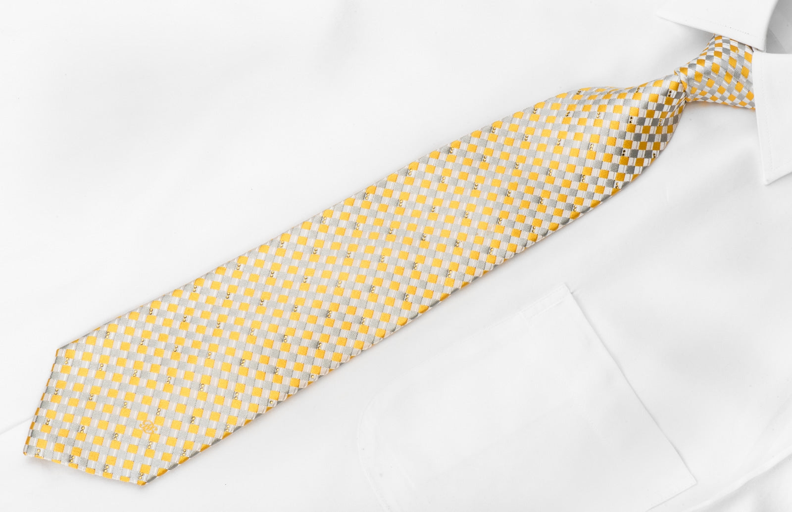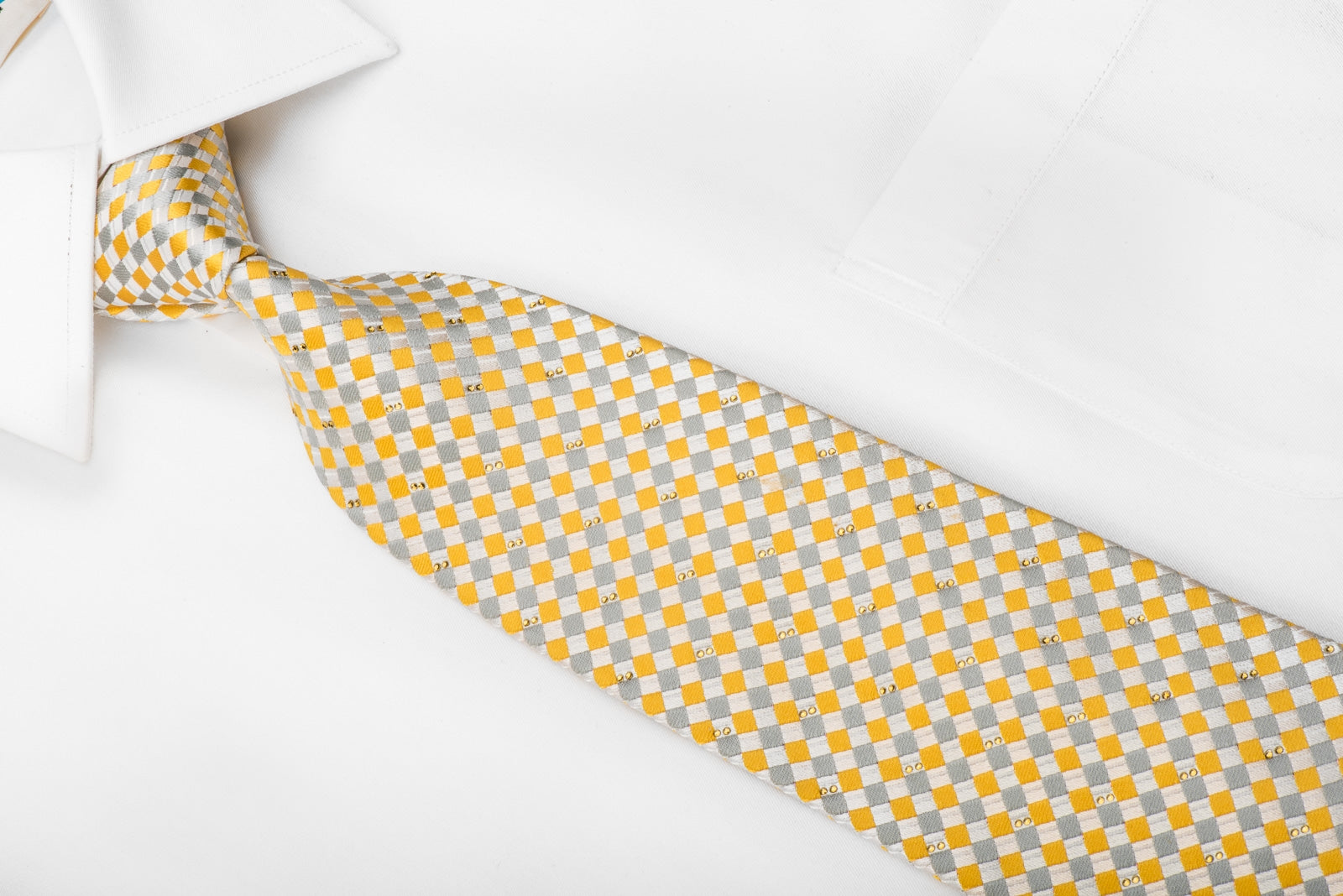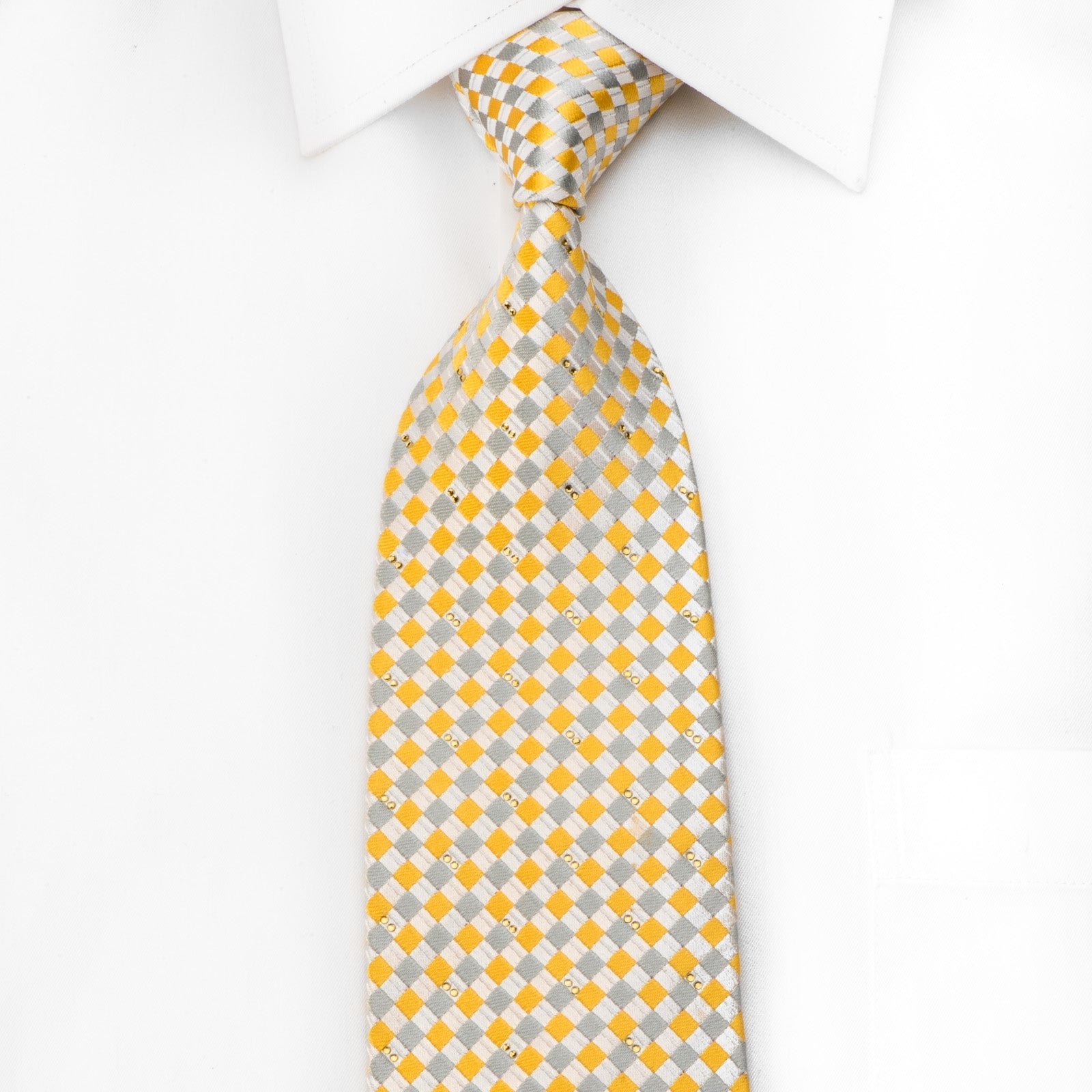 Gravata de strass de cristal masculina elegante perfeita para todas as ocasiões feita à mão da seda de melhor qualidade e projetada pela marca renoma. Apresentando um elegante design amarelo de tecido amarelo tecida checkered com strass de cristal e brilhos metálicos de prata.