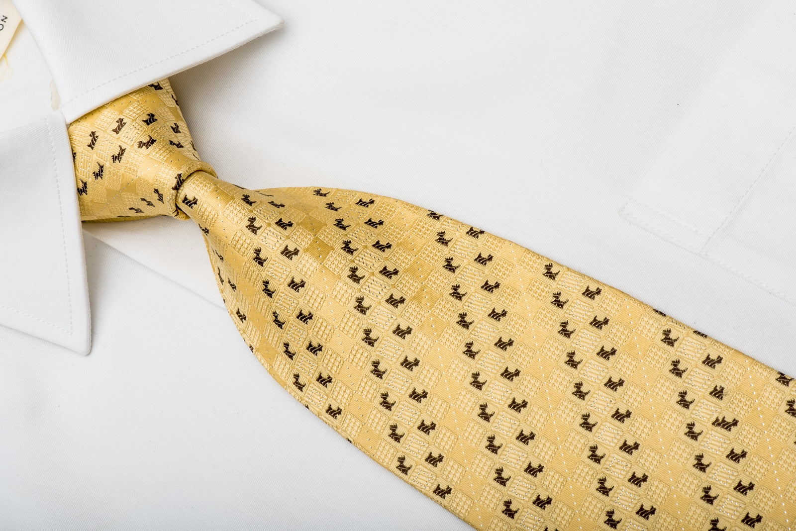 Gravata de seda masculina perfeita para todas as ocasiões feita à mão da seda de melhor qualidade e projetada pela marca renoma. Apresentando um design elegante com cães Scottie marrons em seda amarela tecida com brilhos prateados.