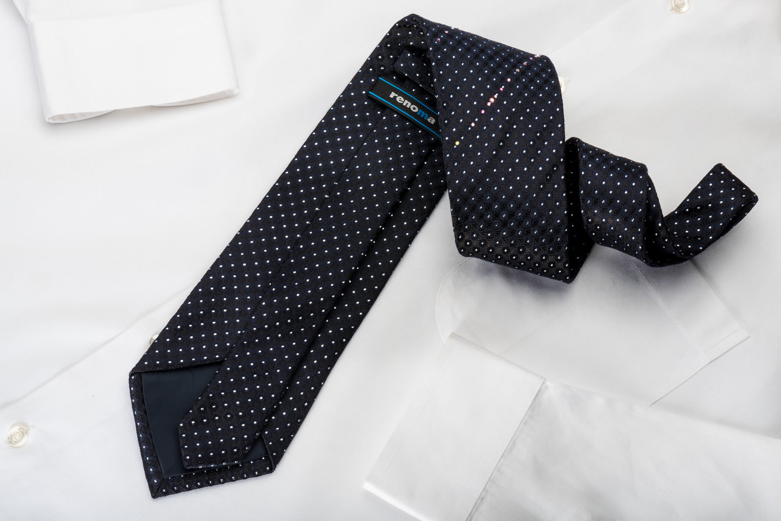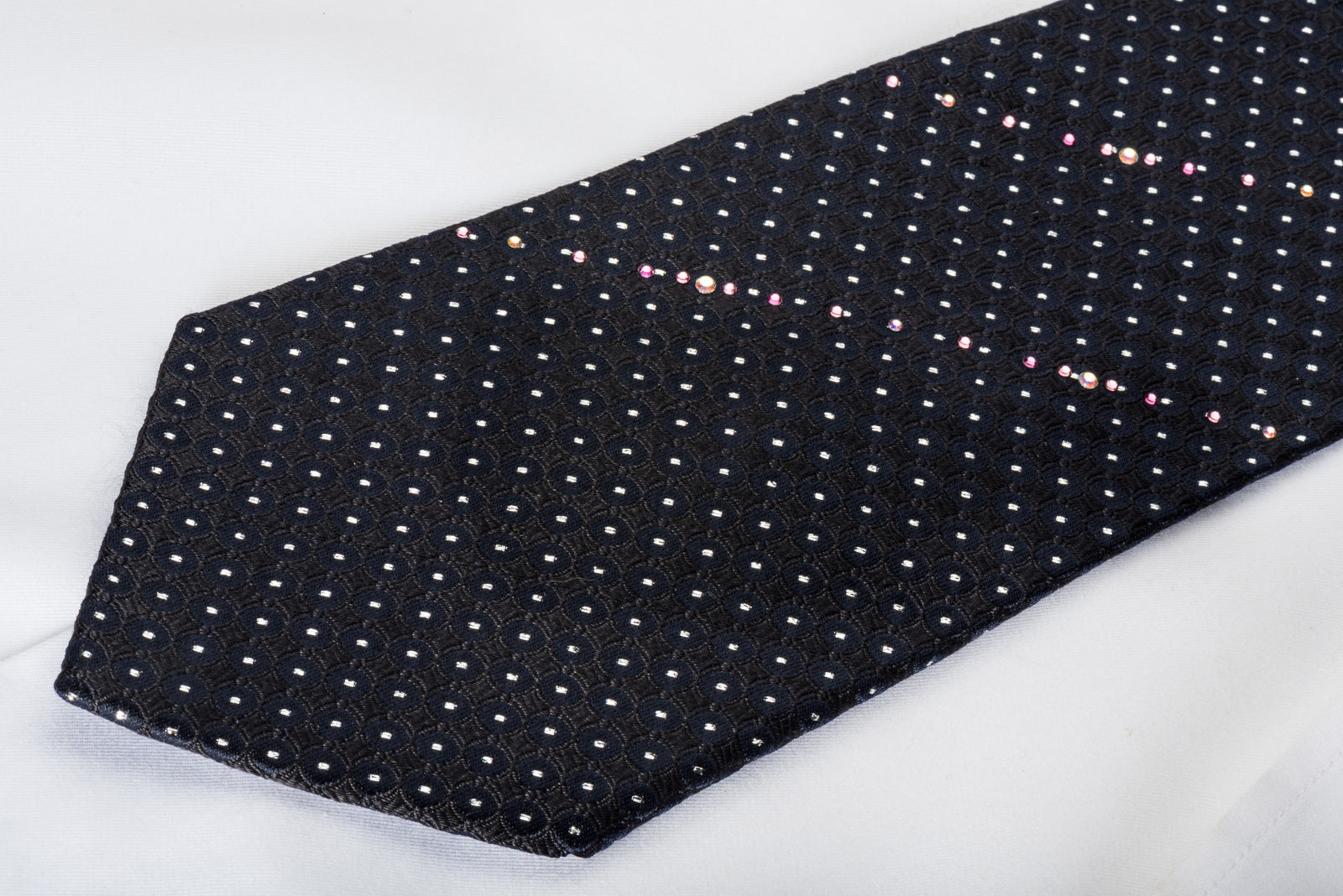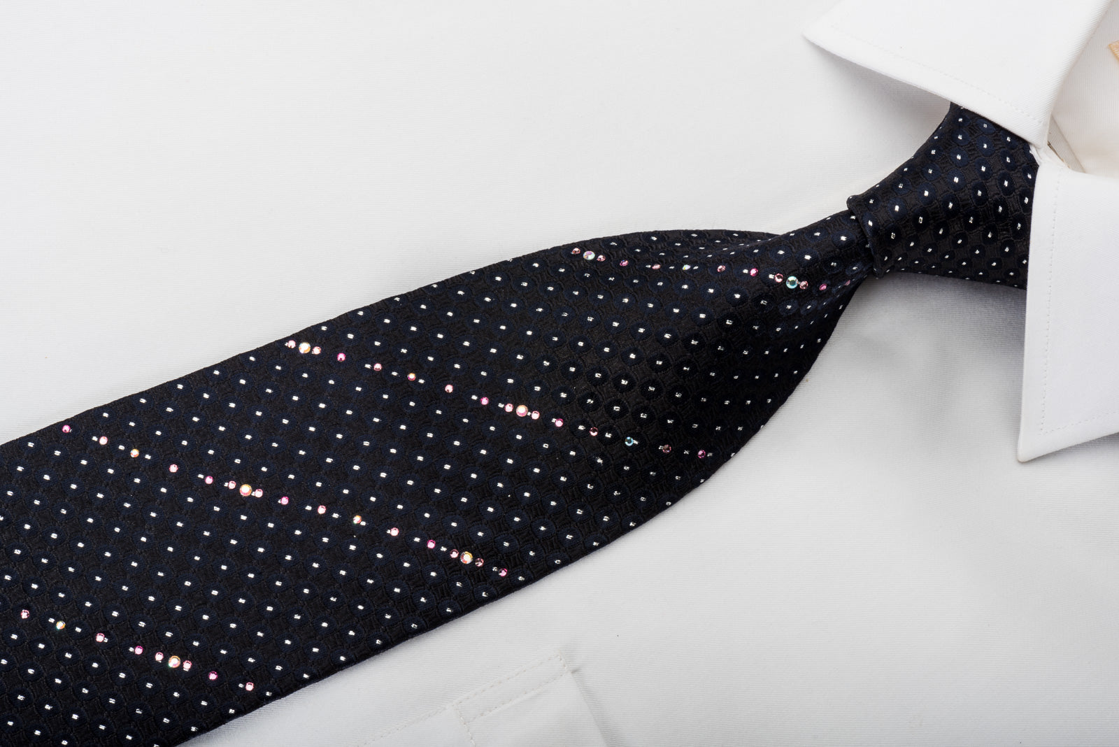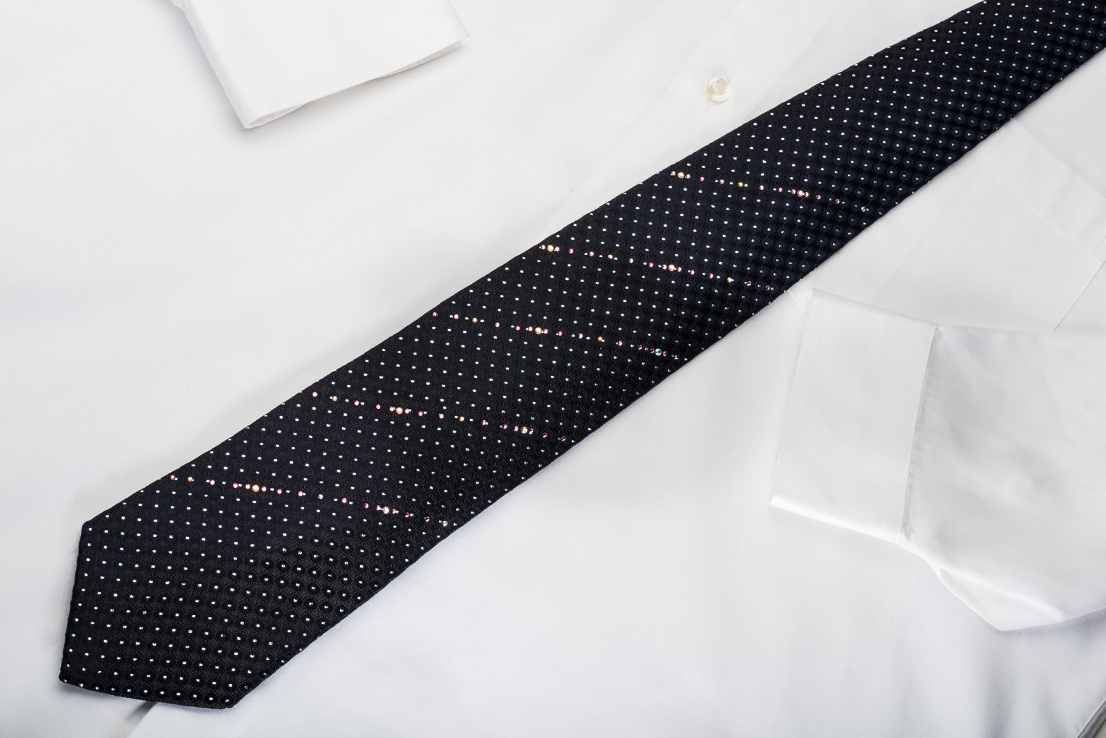 Material - Seda Design - Pontos Cor - Prata negra Comprimento - Clássico (57 pol.-60 pol.)(145 cm-153 cm) Largura - Clássico (3 1/4 pol.-3 3/4 pol.)(8 cm-9,5 cm) Recursos especiais - Strass cinza, brilhos prateados, strass brancos Fornecedor - San-Dee