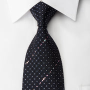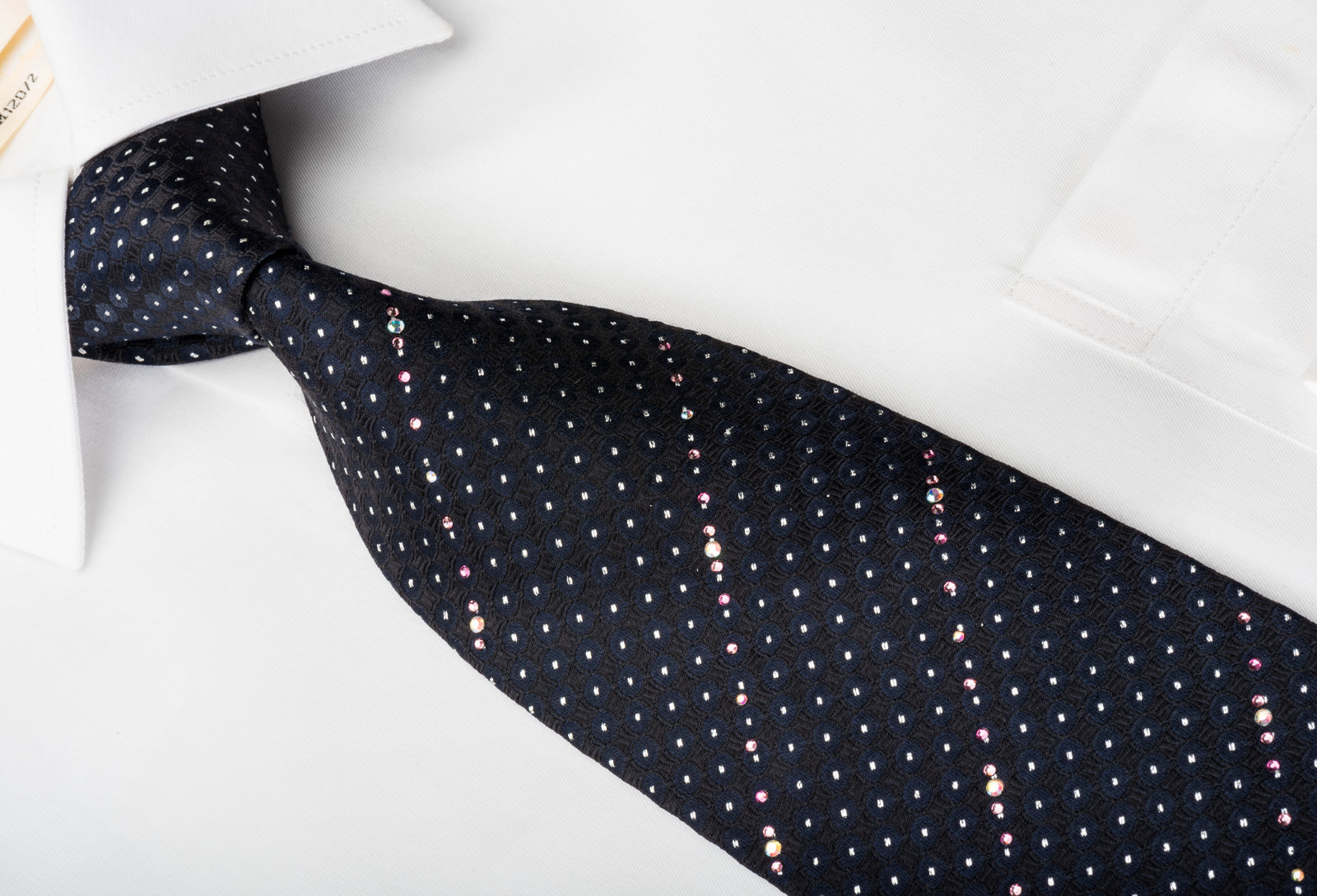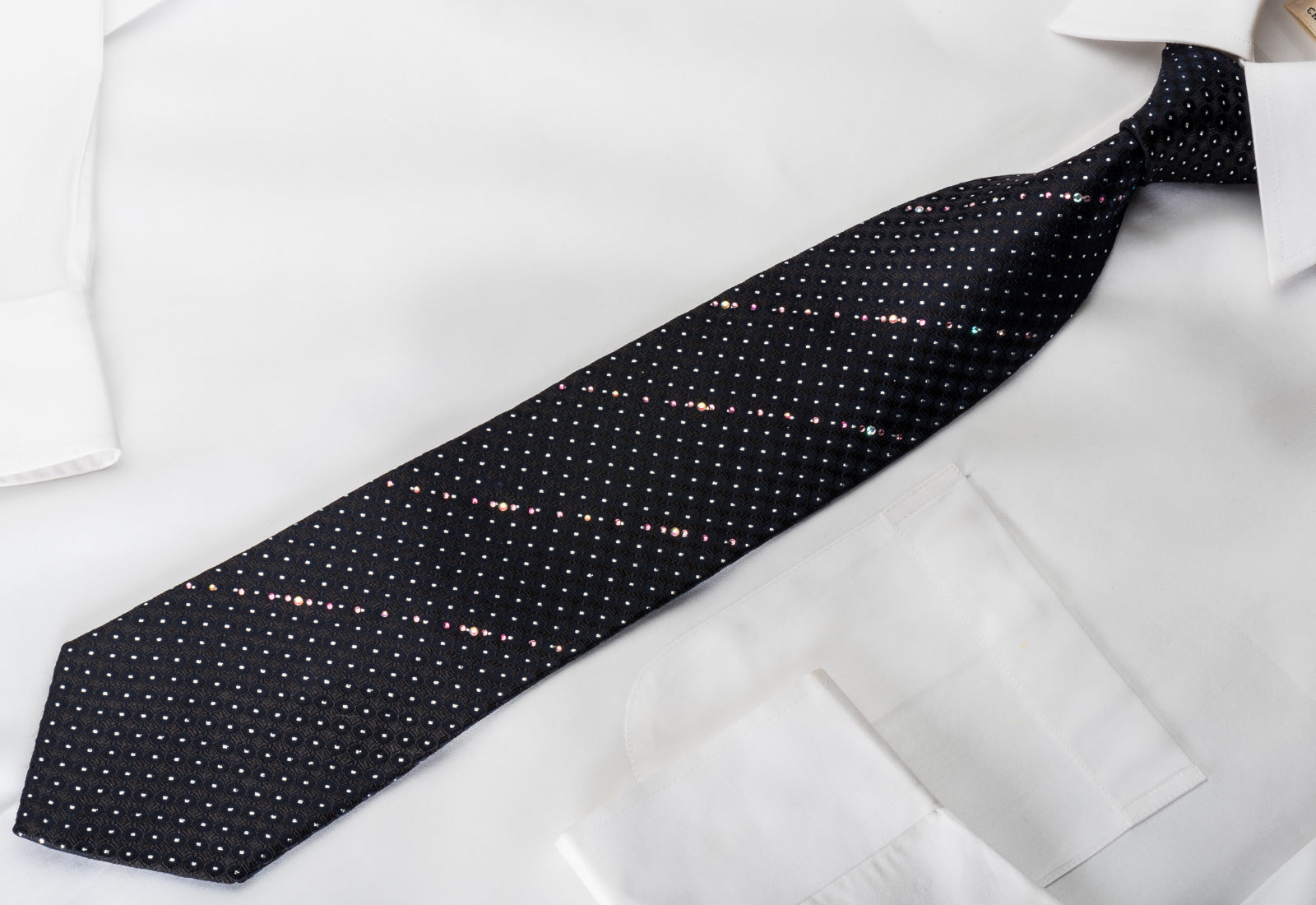 Gravata de seda de strass elegante perfeita para todas as ocasiões feita à mão da seda de melhor qualidade e projetada pela marca renoma. Apresentando um design elegante com pontos prateados brilhantes em seda preta tecida, brilhando com strass cinza e branco.